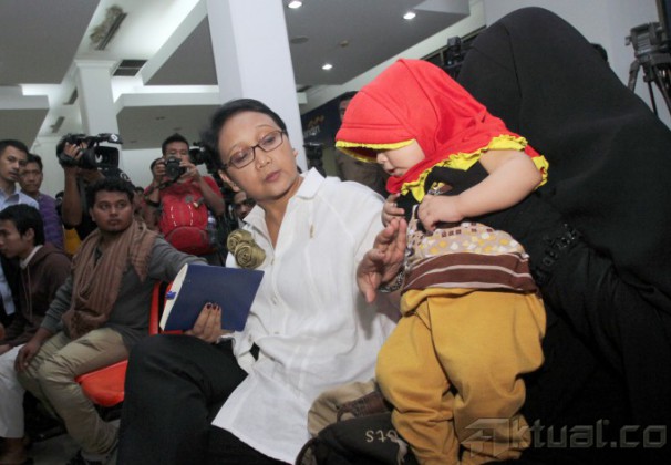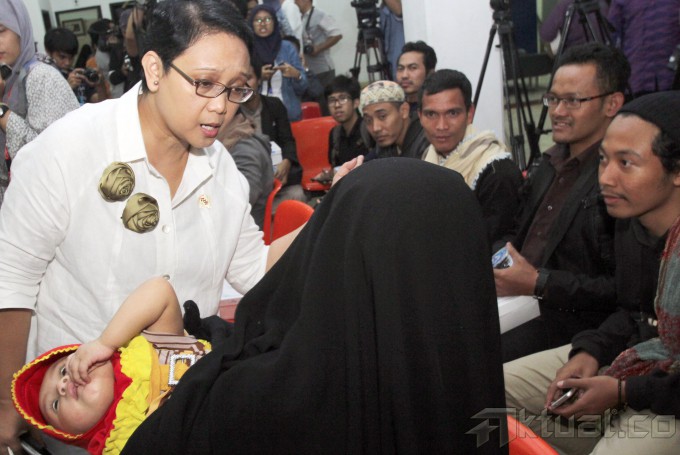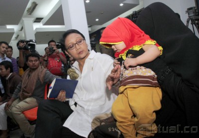 Menteri Luar Negeri Retno LP Marsudi (kiri) berbincang dengan seorang wanita warga negara Indonesia yang kembali dari Yaman setibanya di Bandara Soekarno Hatta, Tangerang, Banten, Minggu (5/4). Pada pemulangan gelombang pertama ini pemerintah berhasil memulangkan 110 WNI yang berada di Yaman dan Pemerintah akan terus memulangkan WNI yang tengah berada di Negara yang sedang Konflik perang tersebut. ANTARA FOTO/Muhammad Iqbal