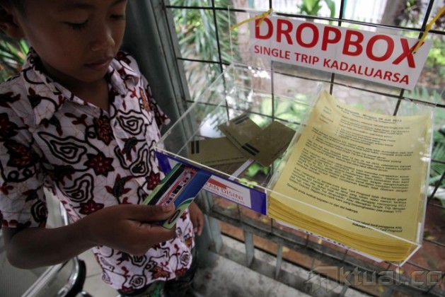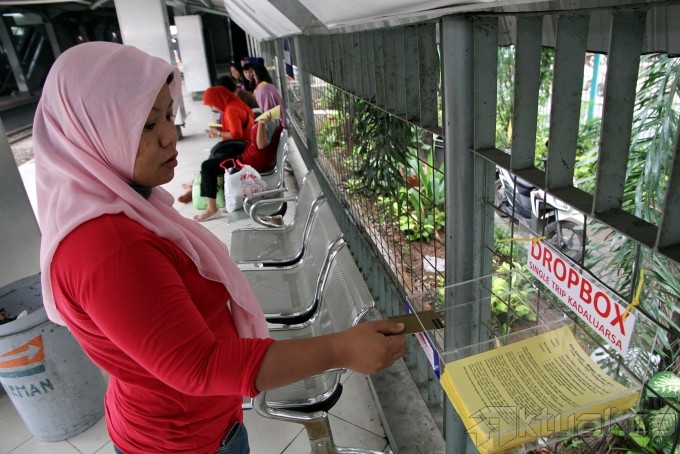 Sejumlah warga mengembalikan tiket single trip ke dalam Drop box pengembalian tiket ‘single trip’ kadaluwarsa commuter line yang diletakkan di Stasiun Sudirman, Jakarta Pusat, Minggu (28/7). Dalam seminggu sebanyak 700 ribu tiket ‘single trip’ hilang dan untuk itu pengguna commuter line diiimbau untuk mengembalikan tiket yang terbawa pulang dengan meletakkannya di drop box. Aktual/Tino Oktaviano