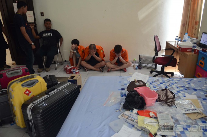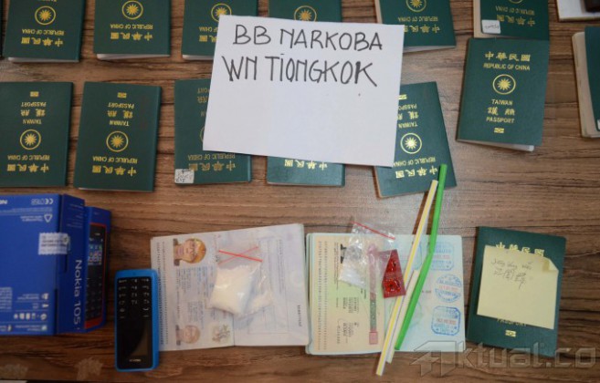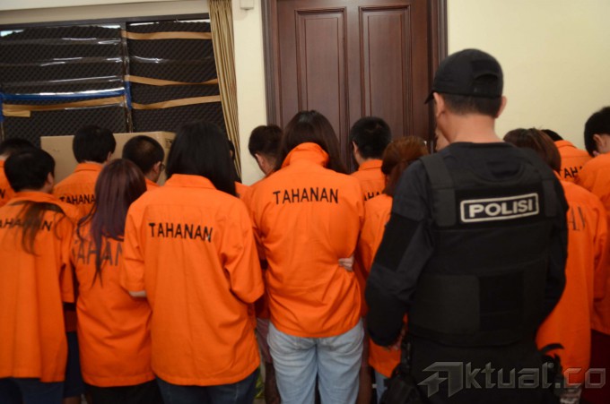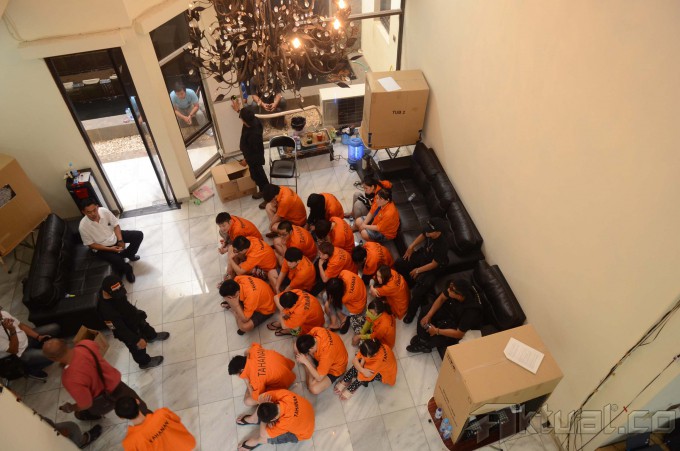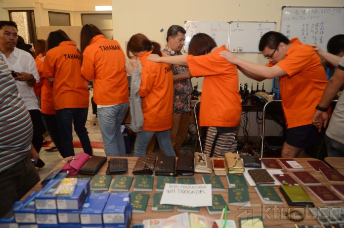 Petugas Kriminal Umum Polda Metro Jaya mengidentifikasi warga negara Tiongkok yang digerebek di kawasan Pondok Indah, Jakarta, Minggu (24/5/2015). Sebanyak 29 WNA asal Tiongkok ditangkap terkait kasus narkoba dan penipuan menggunakan telepon dan internet yang kebanyakan korbannya merupakan pejabat di Tiongkok. AKTUAL/TINO OKTAVIANO