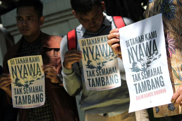 Sejumlah aktifis lingkungan berunjuk rasa di depan Pengadilan Negeri (PN) Surabaya, Jawa Timur, Kamis (18/2). Mereka menyampaikan beberapa tuntutan yang salah satu diantaranya adalah mendesak majelis hakim PN Surabaya untuk bertindak imparsial dan menghukum dengan hukuman maksimal kepada seluruh pelaku kejahatan mafia tambang pasir di Lumajang. ANTARA FOTO/Didik Suhartono/pd/16