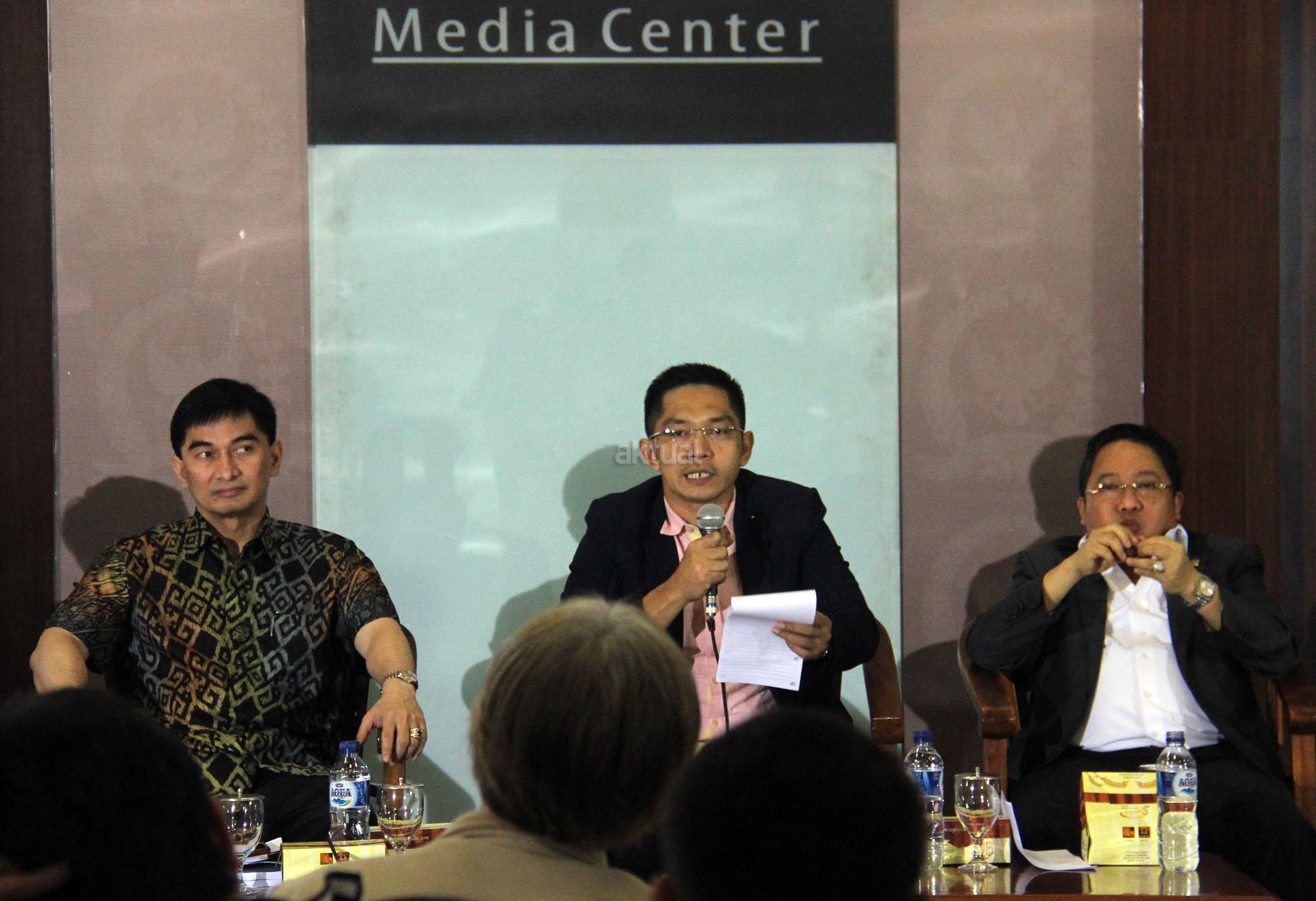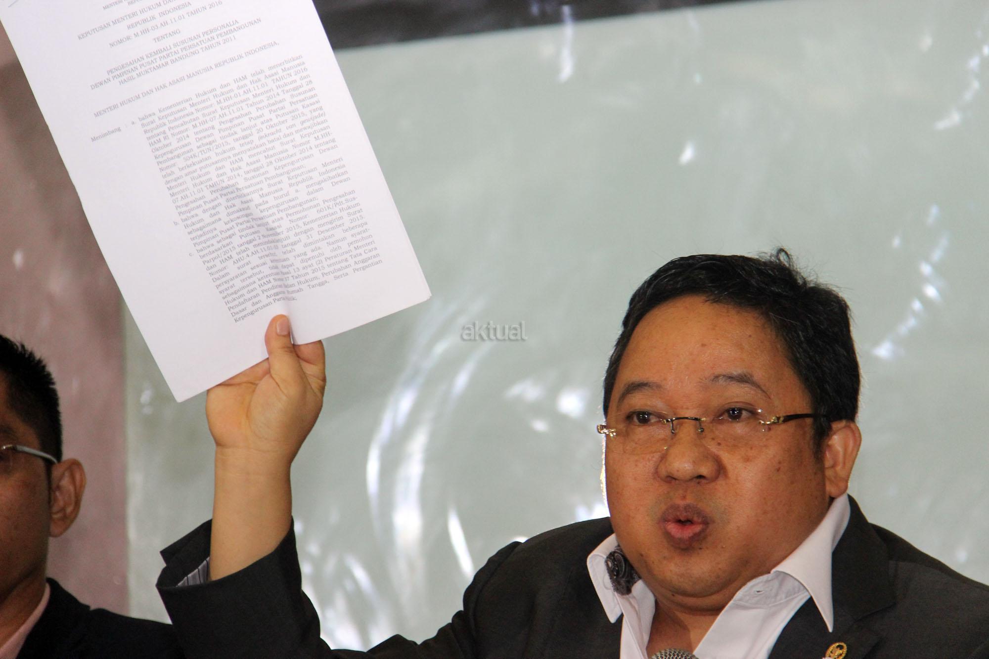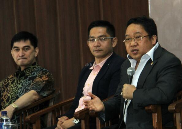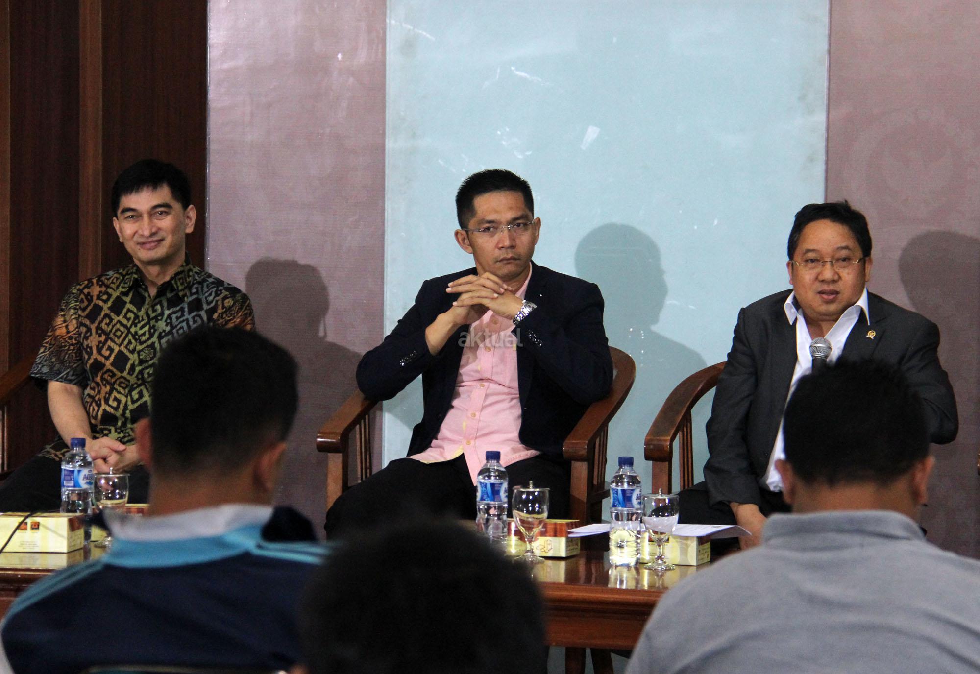 Dualisme Partai Ka'bah: Wakil Sekretaris Jenderal DPP PPP hasil Muktamar Bandung Syaifullah Tamliha (kanan) bersama Anggota Komisi III yang juga Sekretaris Jenderal PPP hasil Muktamar Jakarta Dimyati Natakusuma (kiri) dan Direktur Eksekutif Konstituen Indonesia Yusuf Warsyim (tengah) menjadi pembicara dalam diskusi Dialektika Demokrasi di Komplek Parlemen Senayan, Jakarta, Kamis (18/2/2016). Diskusi tersebut membahas dualisme peta politik partai Kabah di Parlemen dan Nasional pasca keputusan Menteri Hukum dan Hak Asasi Manusia (Menkumham) Yasonna H Laoly yang memperpanjang kepengurusan PPP hasil muktamar Bandung. Foto : Junaidi/Aktual.com