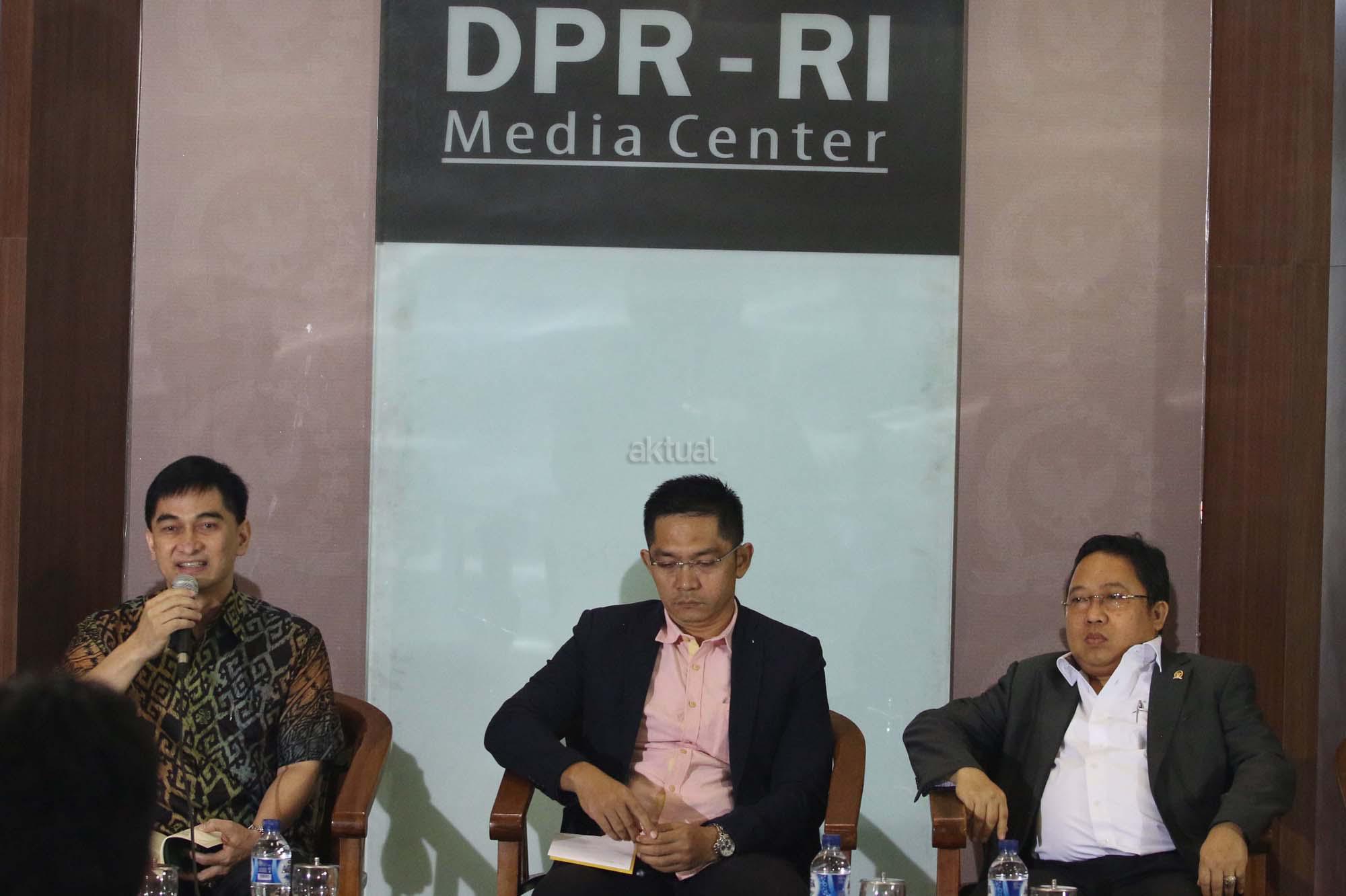 Dualisme Partai Ka'bah: Wakil Sekretaris Jenderal DPP PPP hasil Muktamar Bandung Syaifullah Tamliha (kanan) bersama Anggota Komisi III yang juga Sekretaris Jenderal PPP hasil Muktamar Jakarta Dimyati Natakusuma (kiri) dan Direktur Eksekutif Konstituen Indonesia Yusuf Warsyim (tengah) menjadi pembicara dalam diskusi Dialektika Demokrasi di Komplek Parlemen Senayan, Jakarta, Kamis (18/2). Diskusi tersebut membahas dualisme peta politik partai Kabah di Parlemen dan Nasional pasca keputusan Menteri Hukum dan Hak Asasi Manusia (Menkumham) Yasonna H Laoly yang memperpanjang kepengurusan PPP hasil muktamar Bandung. Foto : Junaidi/Aktual.com
