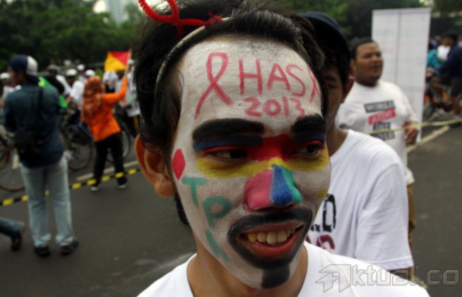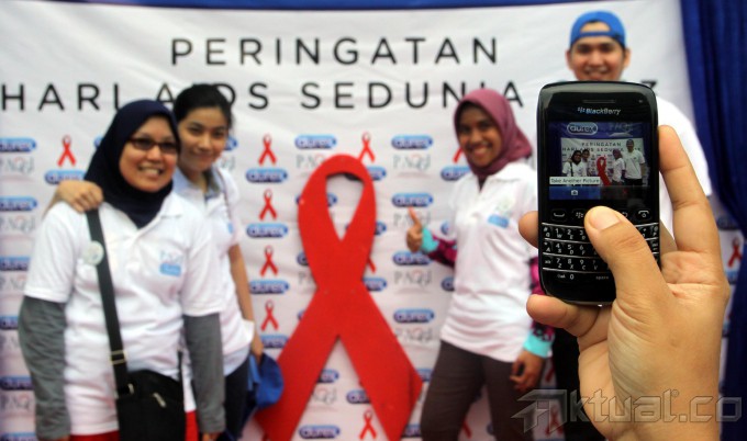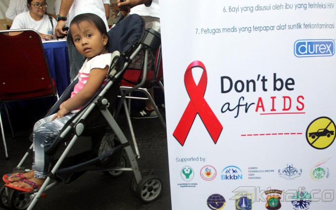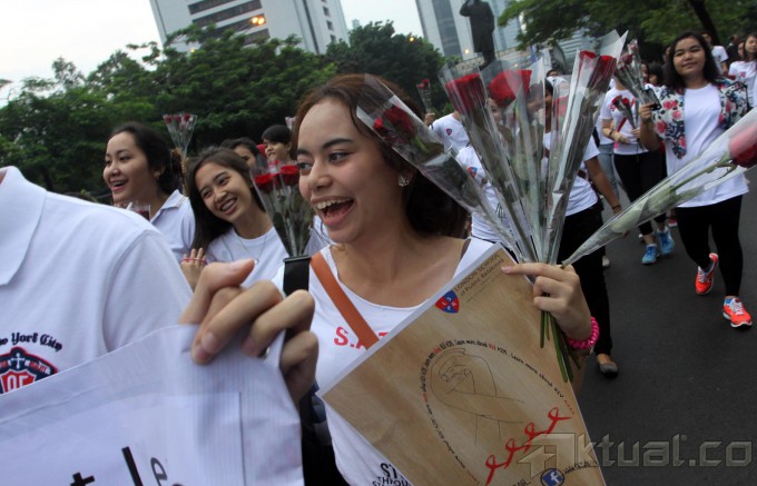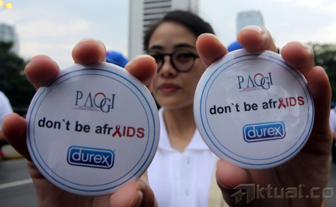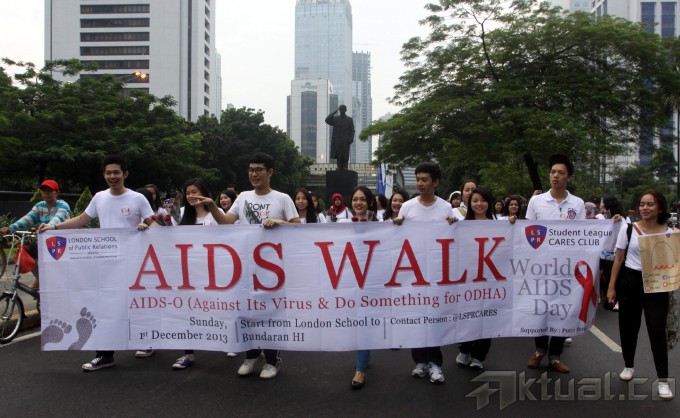 Sejumlah Masyarakat melakukan kampanye saat memperingati Hari AIDS Sedunia di Jalan Sudirman, Jakarta, Minggu (1/12/2013). Persatuan Anggota Muda Obstetri dan Ginekologi (PAOGI) Fakultas Kedokteran Universitas Indonesia menggelar berbagai acara seperti pemeriksaan kesehatan gratis kepada masyarakat umum dan pengumpulan donasi untuk program pencegahan dan penanganan HIV/AIDS. Aktual/Tino Oktaviano