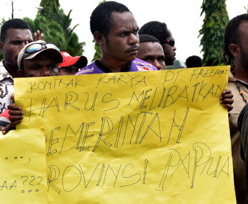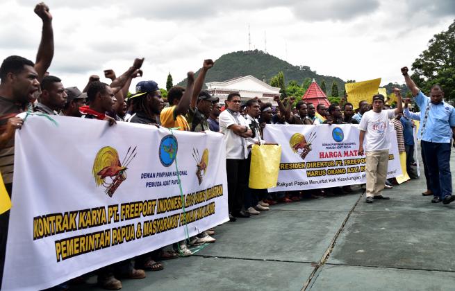 Seorang pengunjuk rasa memegang pamflet dalam aksinya di halaman kantor Gubernur Provinsi Papua, Jayapura, Rabu (18/2). Selain protes soal kontrak karya, massa juga menuntut agar PT Freeport Indonesia berkantor di Papua, serta Direktur Utama PT Freeport Indonesia wajib orang asli Papua. ANTARA FOTO/Indrayadi TH/pd/16