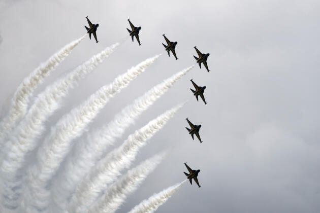 Tim aerobatik Black Eagles dari Angkatan Udara Republik Korea Selatan melakukan manuver dalam Singapore Airshow 2016 di Changi, Singapura, Kamis (18/2). Kegiatan kedirgantaraan yang diikuti lebih dari 60 dari 100 perusahaan di dunia tersebut berlangsung dari 16 hingga 21 Februari 2016. ANTARA FOTO/Sigid Kurniawan/aww/16.