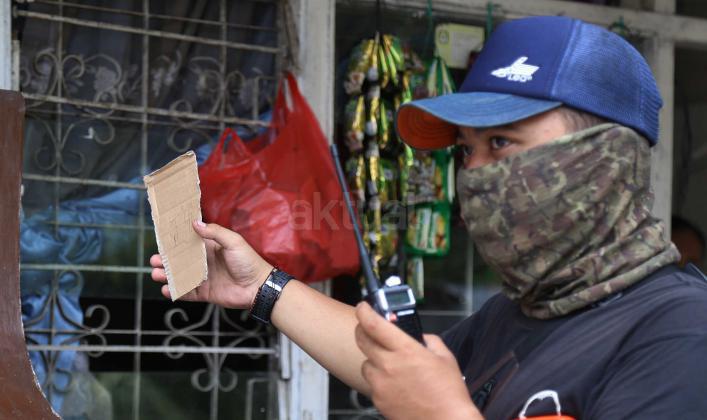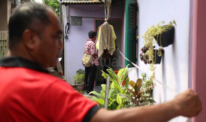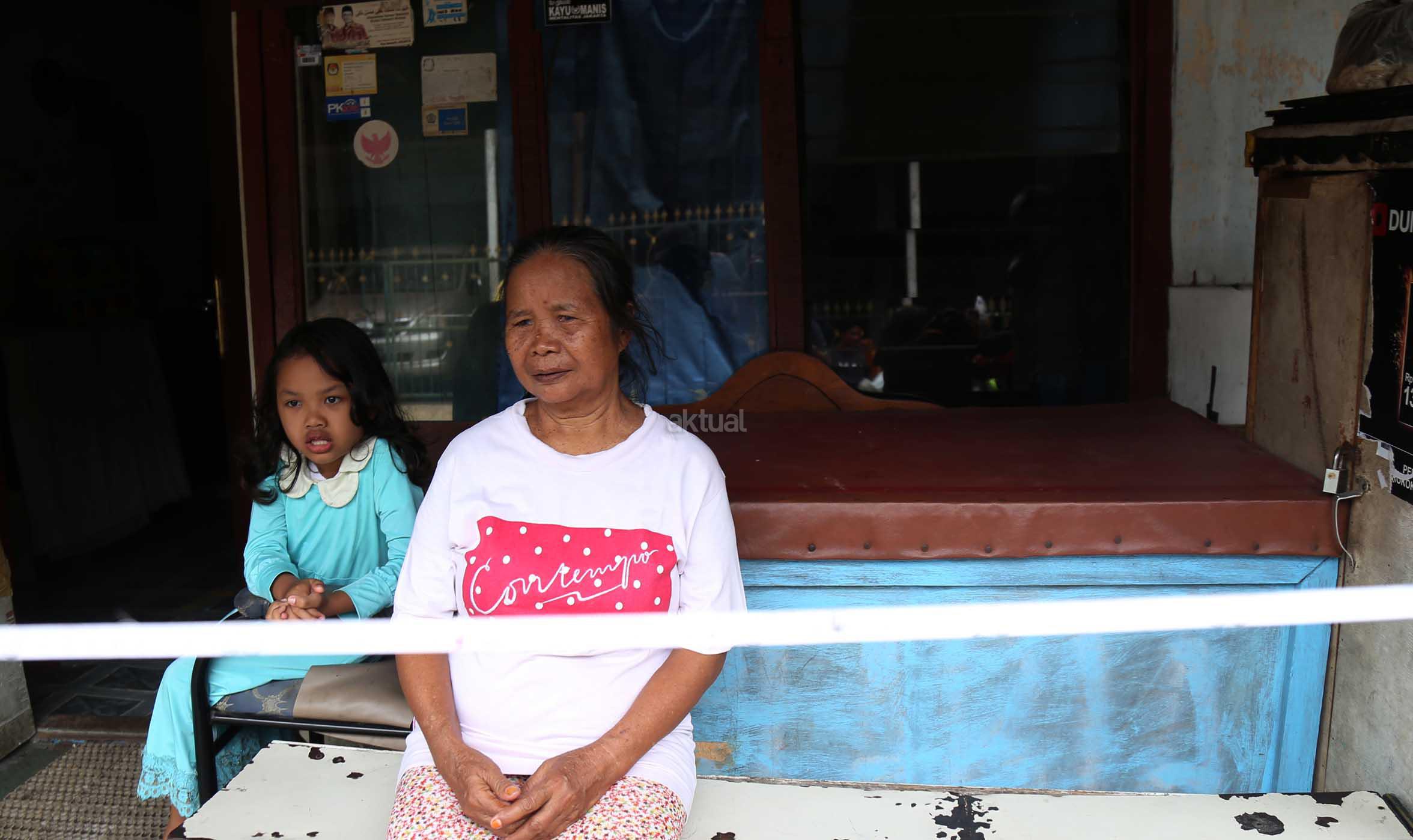 Warga duduk di depan rumahnya saat petugas dari Suku Dinas Perumahan Jakarta Timur melakukan pengukuran dan pendataan warga Jalan Slamet Riyadi yang terletak di bantaran Kali Ciliwung, Kawasan Berlan, Jakarta, Jumat (19/2/2016). Pemprov DKI Jakarta berencana merelokasi ratusan warga yang mendiami 181 rumah dari 6 RT yang tinggal di kawasan tersebut ke rusun Pulo Gebang.