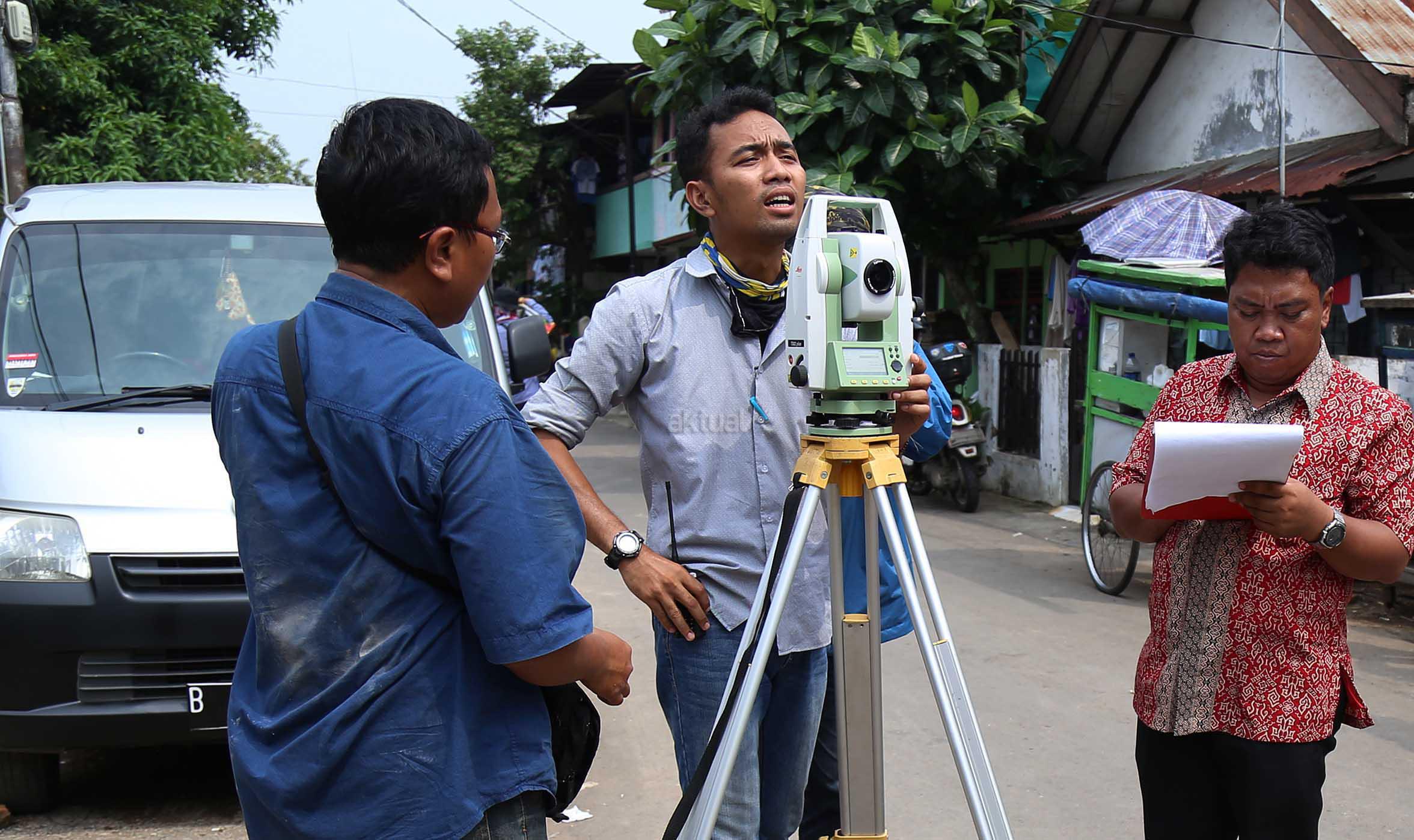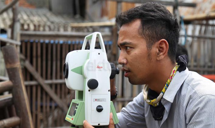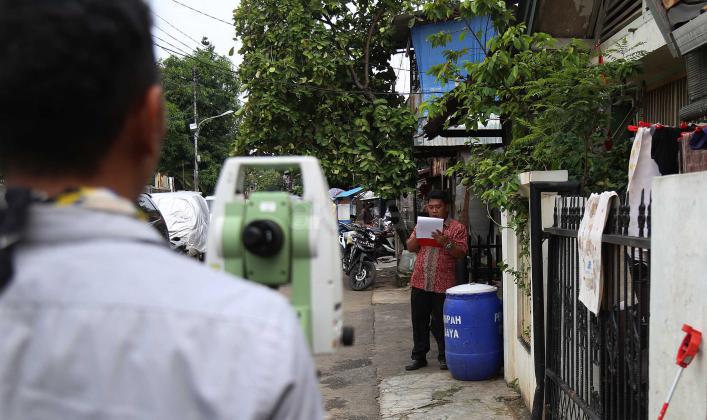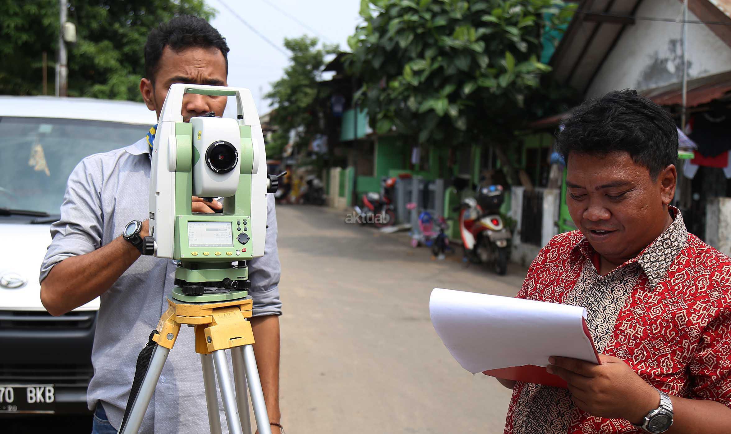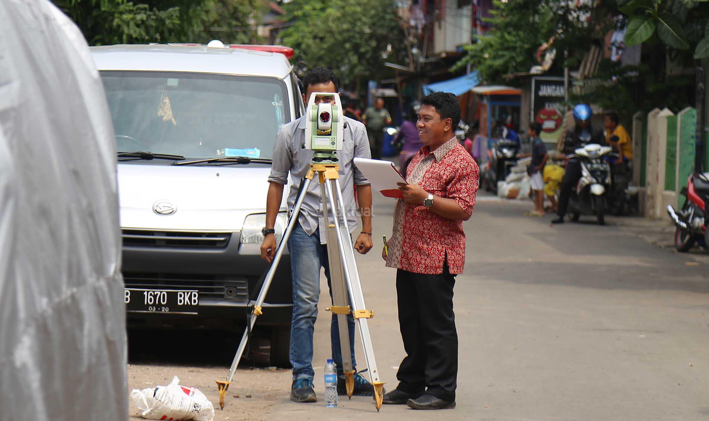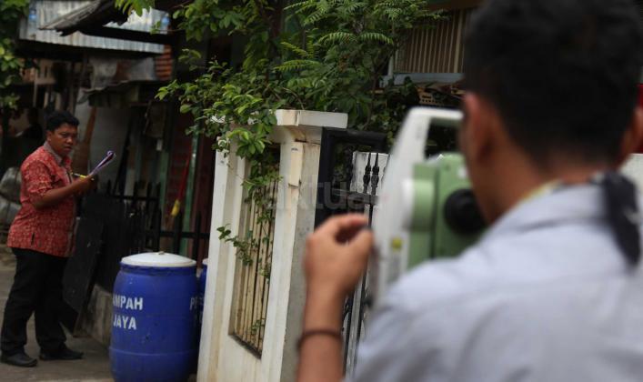 Petugas dari Suku Dinas Perumahan Jakarta Timur melakukan pengukuran dan pendataan warga Jalan Slamet Riyadi yang terletak di bantaran Kali Ciliwung, Kawasan Berlan, Jakarta, Jumat (19/2/2016). Pemprov DKI Jakarta berencana merelokasi ratusan warga yang mendiami 181 rumah dari 6 RT yang tinggal di kawasan tersebut ke rusun Pulo Gebang.