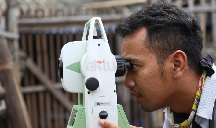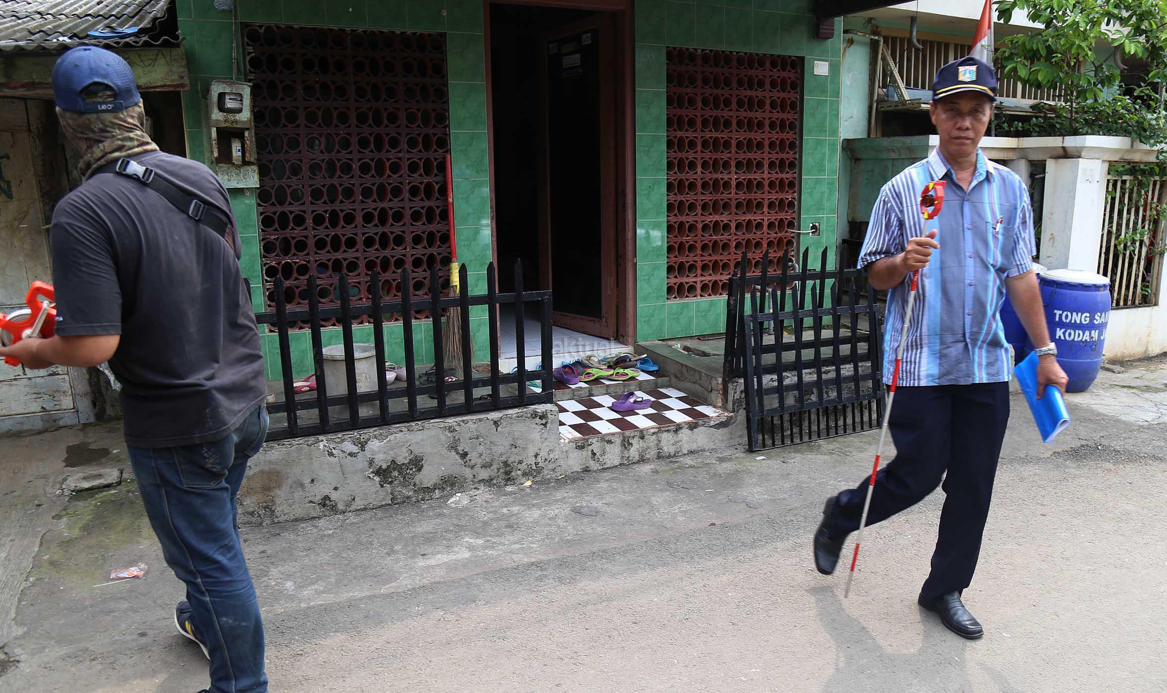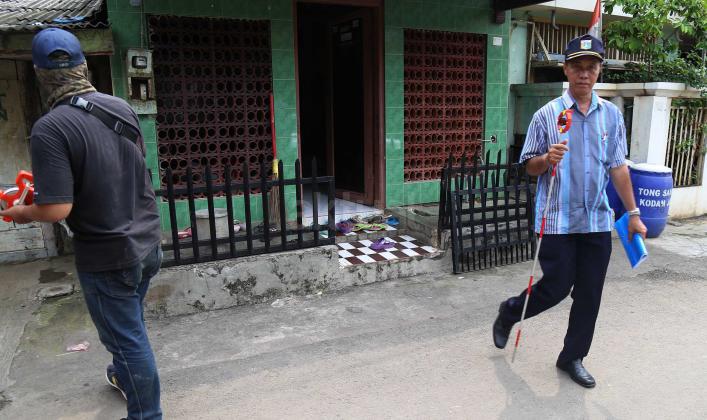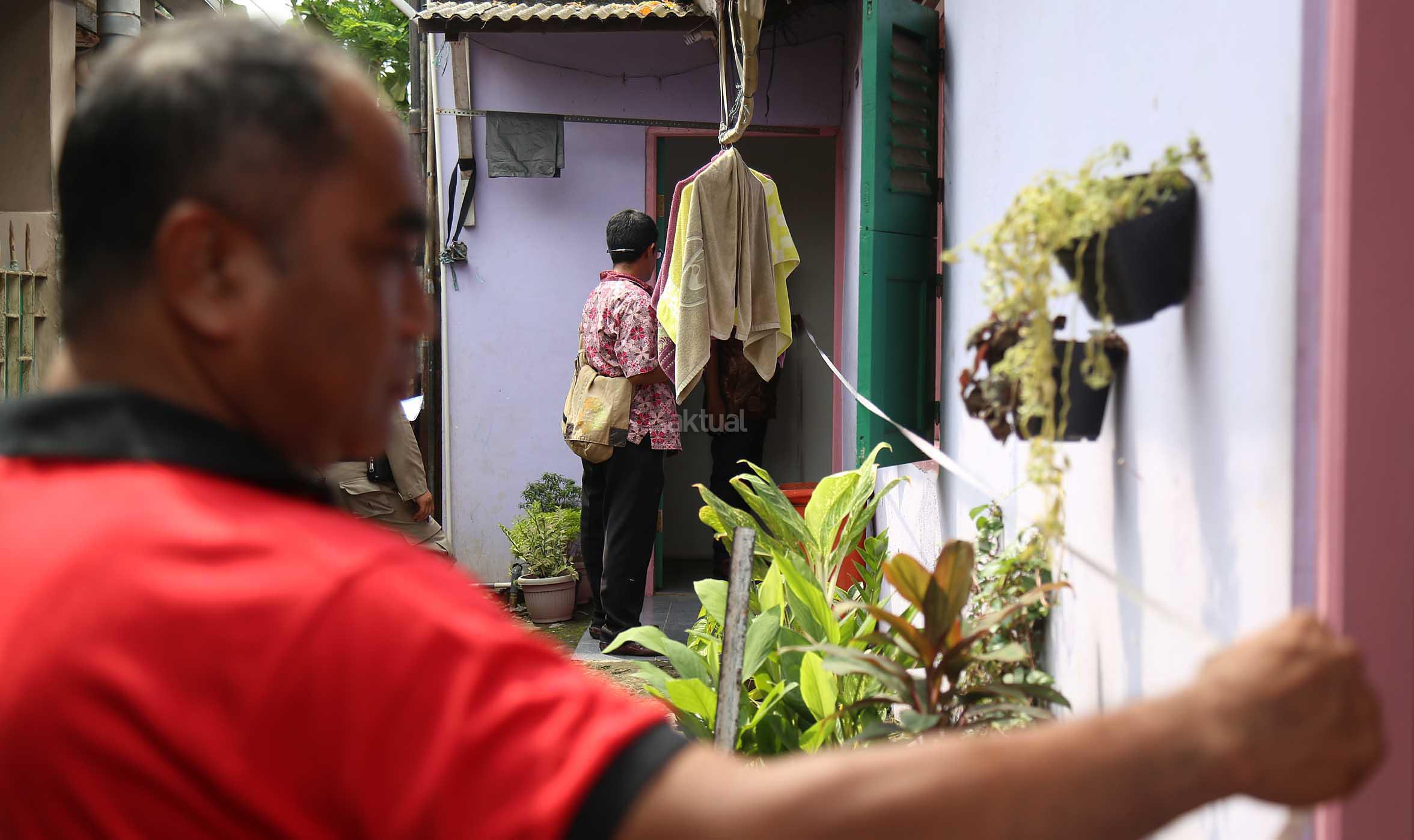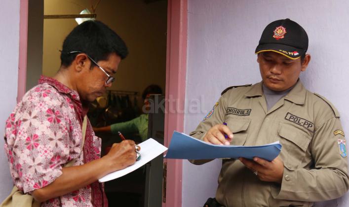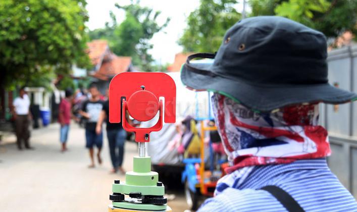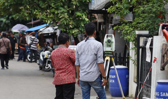 Petugas dari Suku Dinas Perumahan Jakarta Timur melakukan pengukuran dan pendataan warga Jalan Slamet Riyadi yang terletak di bantaran Kali Ciliwung, Kawasan Berlan, Jakarta, Jumat (19/2/2016). Pemprov DKI Jakarta berencana merelokasi ratusan warga yang mendiami 181 rumah dari 6 RT yang tinggal di kawasan tersebut ke rusun Pulo Gebang.