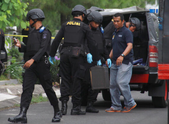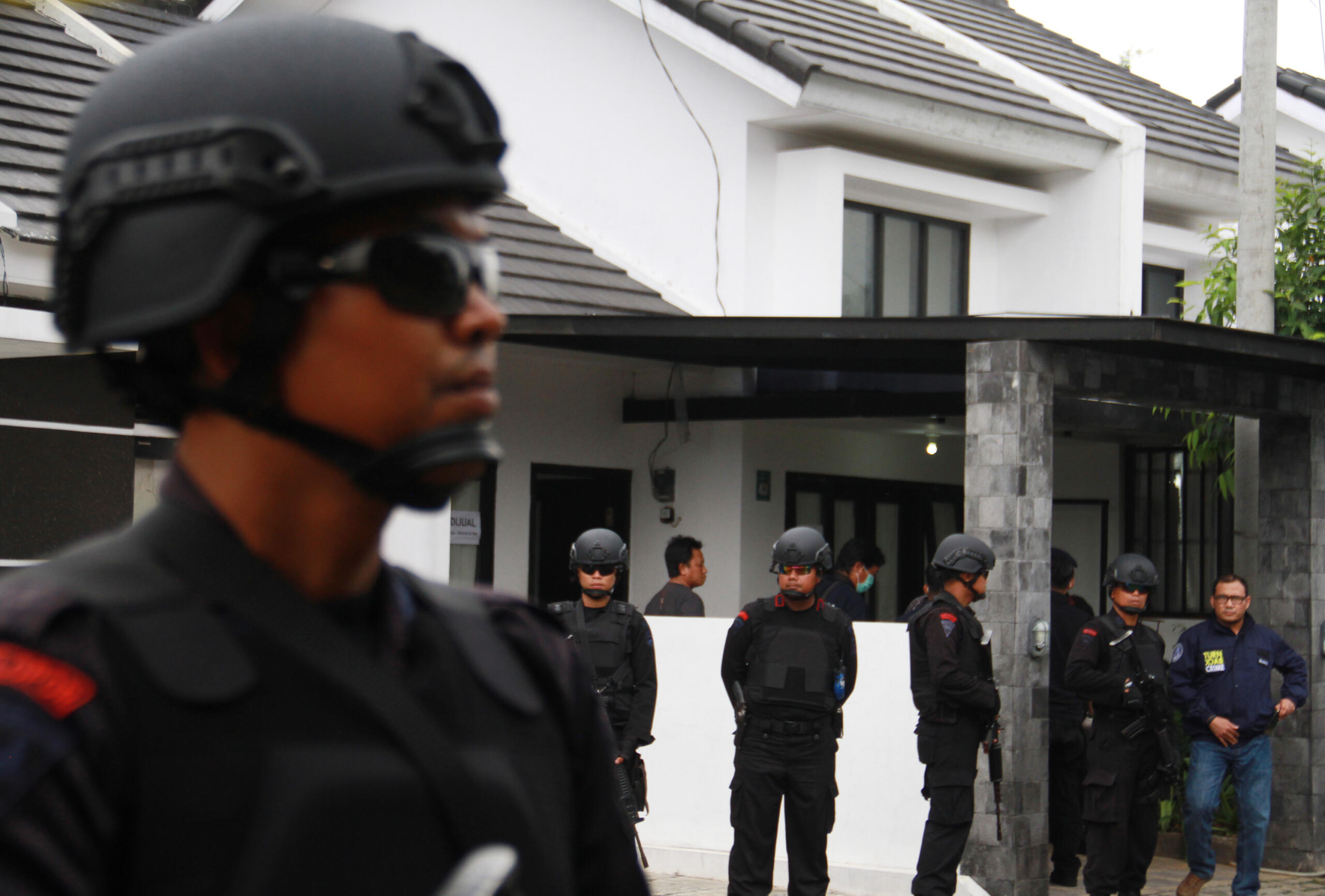 Anggota Detasemen Khusus (Densus) 88 Anti Teror Polri melakukan penggeledahan di sebuah rumah yang digunakan sebagai tempat persembunyian para terduga teroris di Perumahan Greenhill, Ngijo, Karangploso, Malang, Jawa Timur, Sabtu (20/2). Sebelumnya di kawasan tersebut Densus 88 menangkap empat orang terduga teroris di tiga lokasi yang berbeda. ANTARA FOTO/Ari Bowo Sucipto/aww/16.