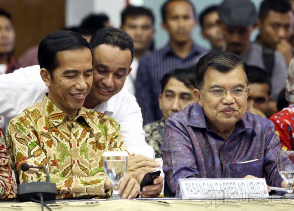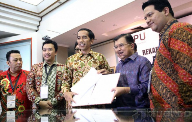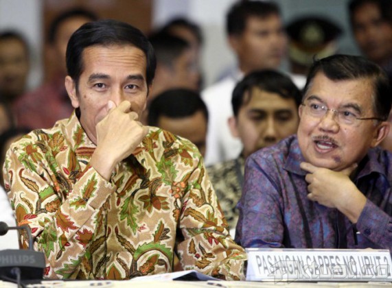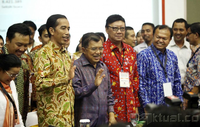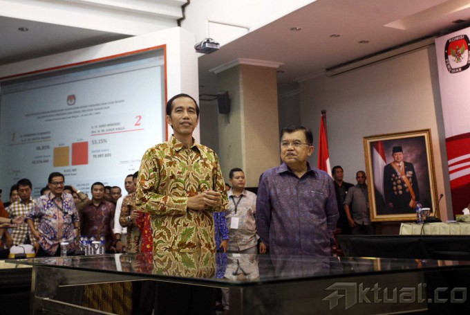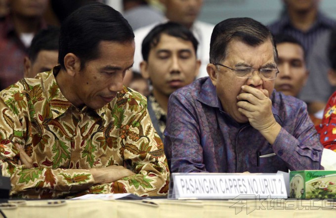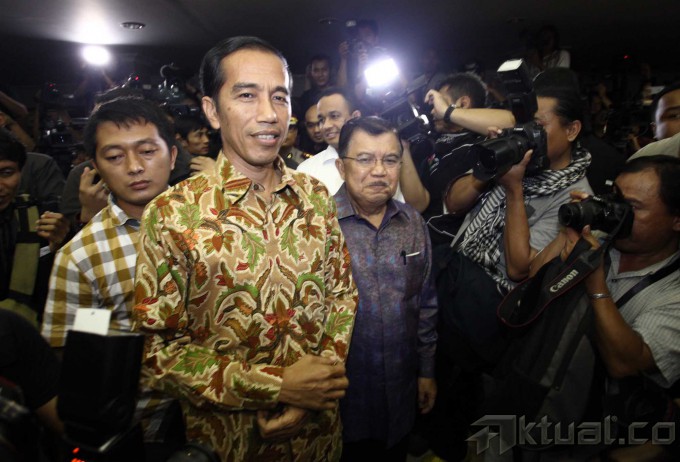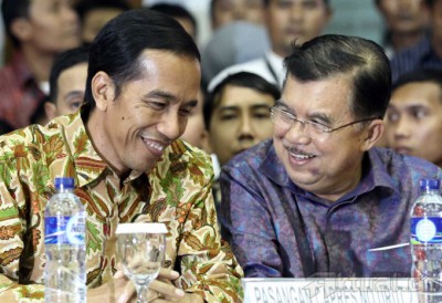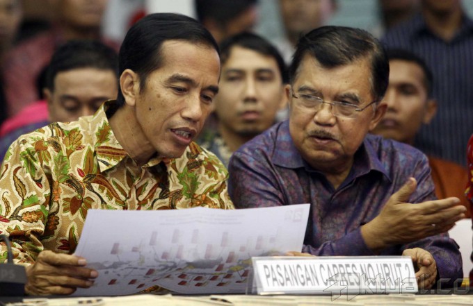 Presiden terpilih Ir.Joko Widodo dan Wapres terpilih Drs.H.Jusuf Kalla berbincang saat datang ke gedung Komisi Pemilihan Umum, Jalan Imam Bonjol. Jakarta, Selasa (22/7/2014) malam. Kehadirannya tersebut merupakan tindak lanjut dari penetapan rekapitulasi suara nasional pemilihan presiden yang menetapkan keduanya sebagai presiden dan wakil presiden terpilih. Aktual/Tino Oktaviano