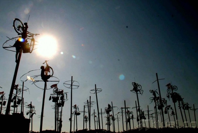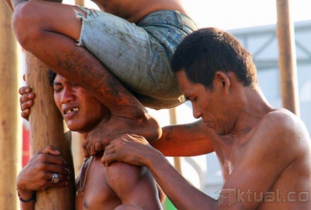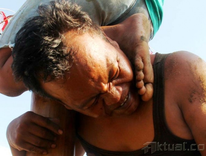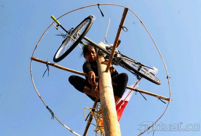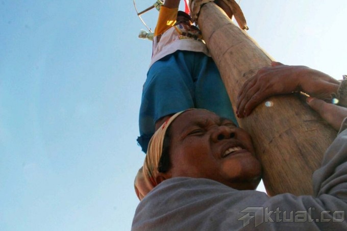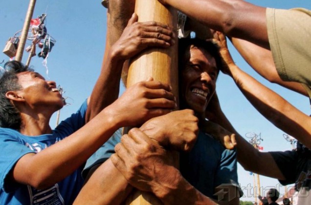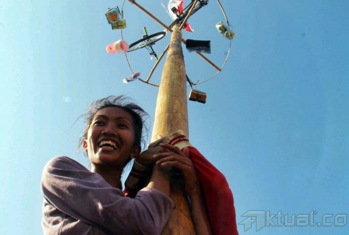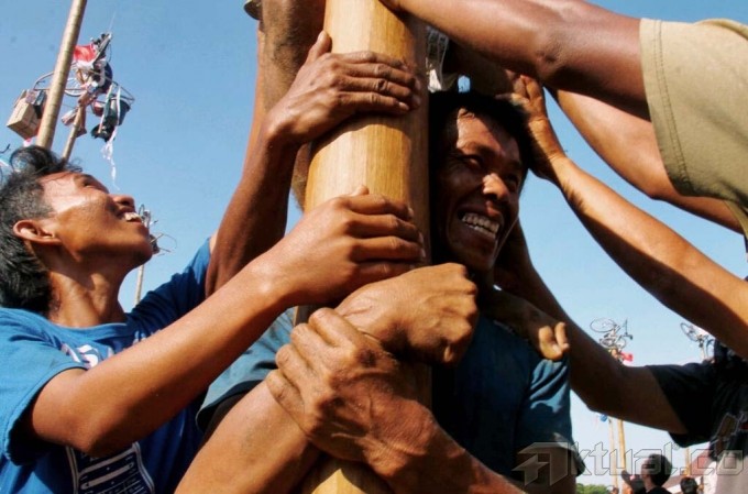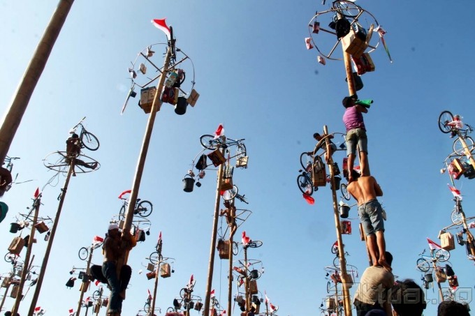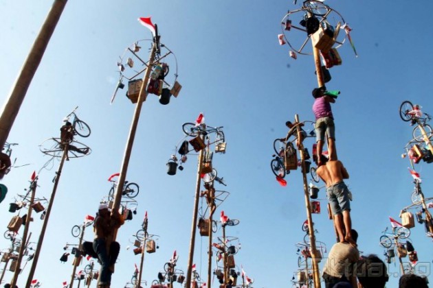 Warga mengikuti lomba panjat pinang dalam rangka HUT ke-68 RI di Pantai Karnaval Ancol, Jakarta, Sabtu (17/8). Dalam even tahunan tersebut, panitia menyediakan 168 batang pohon pinang dengan sejumlah hadiah serta hiburan panggung musik. Aktual/Oke Dwi Atmaja