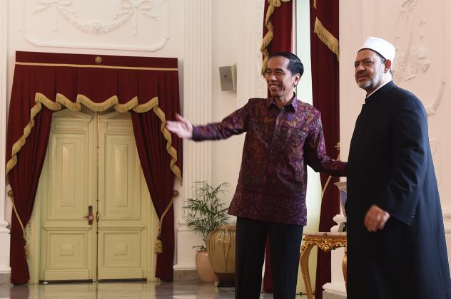 Presiden Joko Widodo (kiri) menerima Grand Syeikh of Al Azhar Ahmed Mohamed Ahmed Eltayeb di Istana Merdeka, Jakarta, Senin (22/2). Pertemuan tersebut diantaranya terkait kerjasama bidang pendidikan dan membahas penyebarluasan ajaran Islam yang moderat. ANTARA FOTO/Puspa Perwitasari/aww/16.