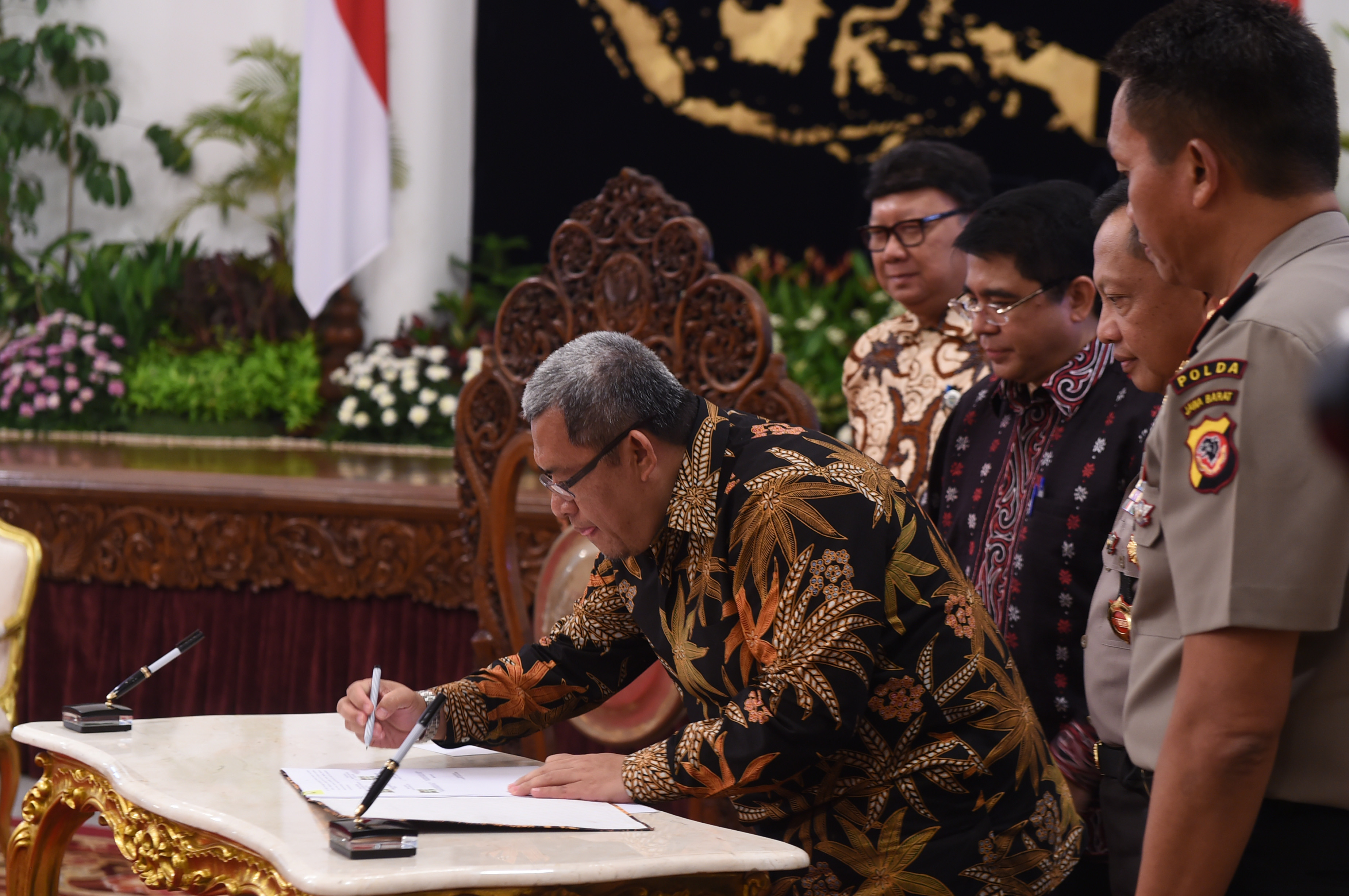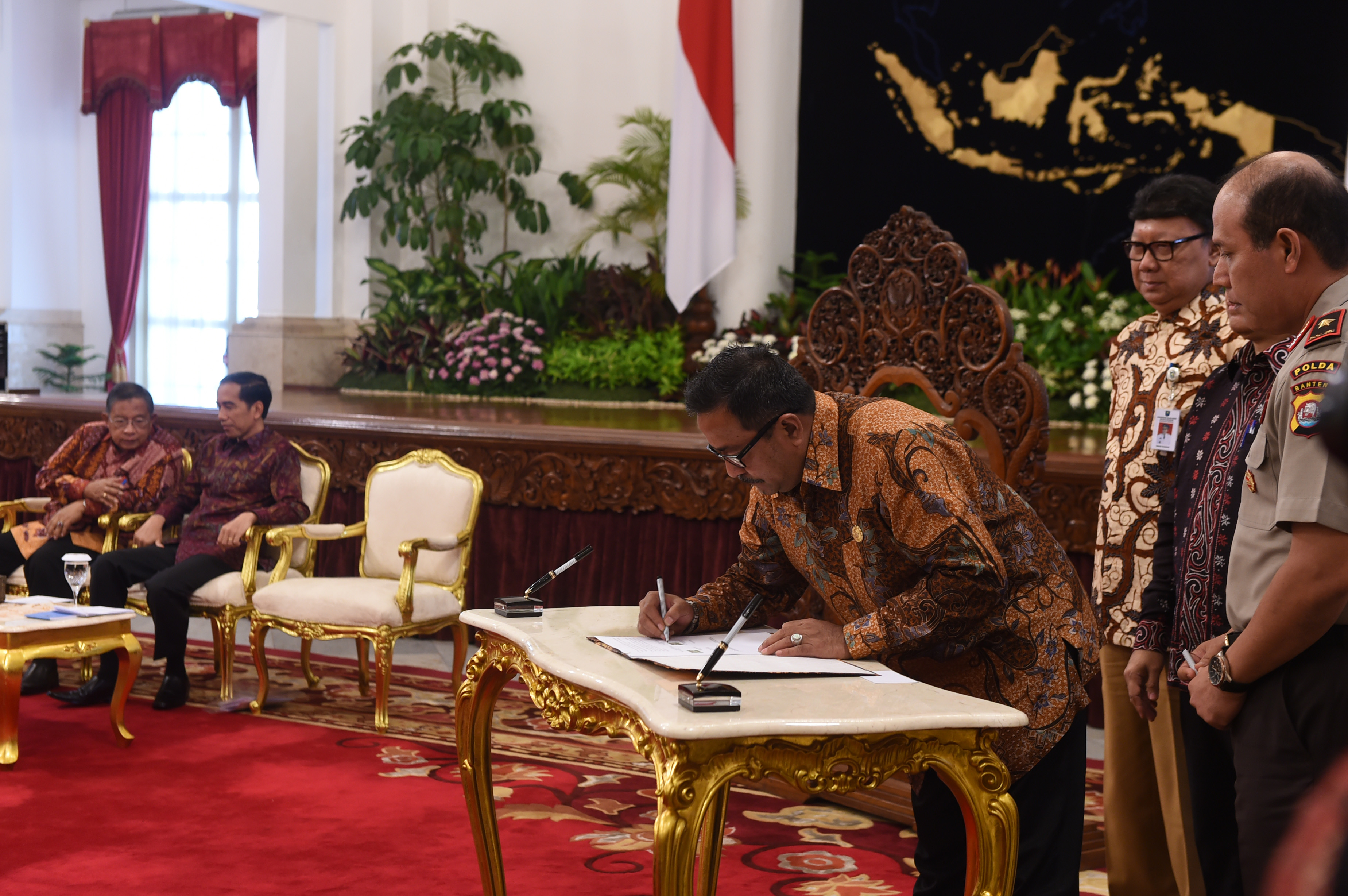 Gubernur Jawa Barat Ahmad Heryawan disaksikan Kepala BKPM Franky Sibarani (ketiga kanan), Menteri Dalam Negeri Tjahjo Kumolo (keempat kanan) dan Kapolda Metro Jaya Tito Karnavian (kedua kanan) menandatangani kerja sama fasilitas Kemudahan Investasi Langsung Konstruksi (KLIK) di Istana Negara, Jakarta, Senin (22/2). Peluncuran KLIK di kawasan industri serta peningkatan layanan izin investasi tiga jam bidang infrastruktur bertujuan untuk meningkatkan iklim investasi di Indonesia. ANTARA FOTO/Puspa Perwitasari/kye/16