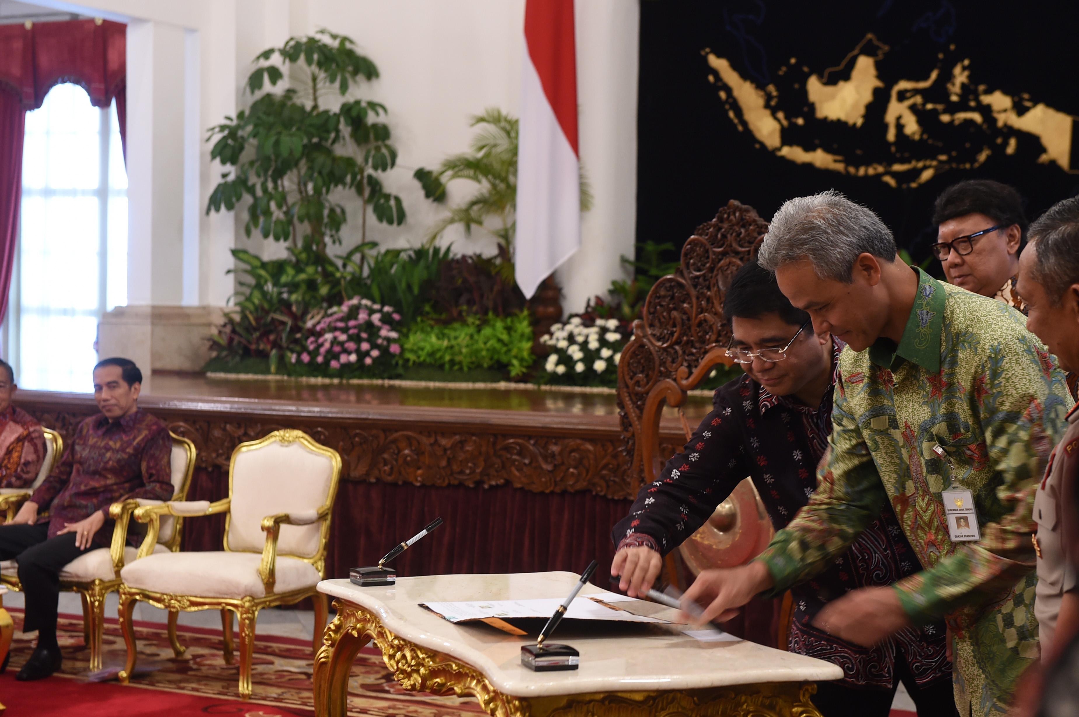 Presiden Joko Widodo (kiri) menyaksikan penandatanganan kerja sama fasilitas Kemudahan Investasi Langsung Konstruksi (KLIK) oleh Gubernur Jawa Tengah Ganjar Pranowo di Istana Negara, Jakarta, Senin (22/2). Peluncuran KLIK di kawasan industri serta peningkatan layanan izin investasi tiga jam bidang infrastruktur bertujuan untuk meningkatkan iklim investasi di Indonesia. ANTARA FOTO/Puspa Perwitasari/kye/16