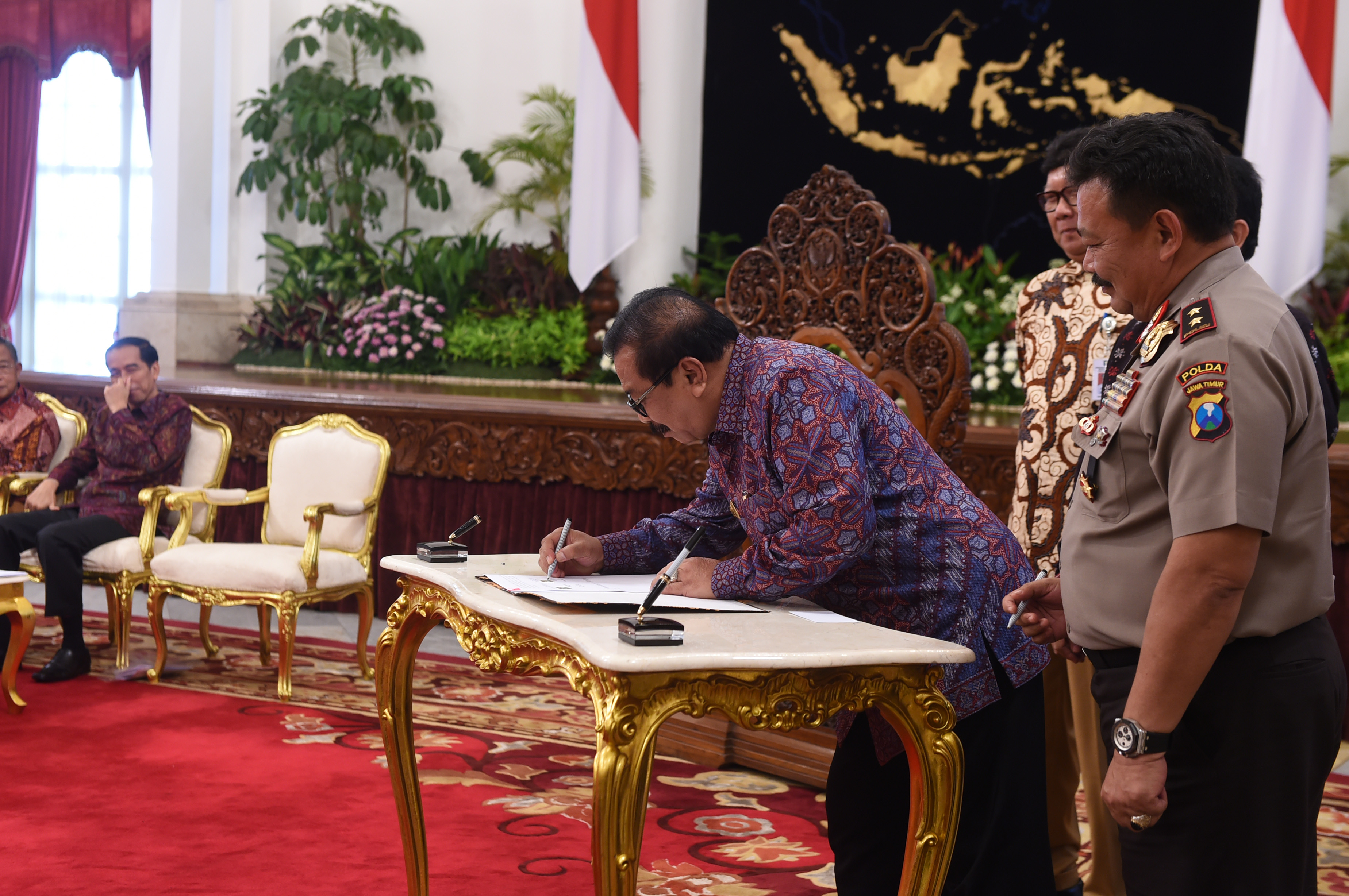 Presiden Joko Widodo (kiri) menyaksikan penandatanganan kerja sama fasilitas Kemudahan Investasi Langsung Konstruksi (KLIK) oleh Gubernur Jawa Timur Soekarwo di Istana Negara, Jakarta, Senin (22/2). Peluncuran KLIK di kawasan industri serta peningkatan layanan izin investasi tiga jam bidang infrastruktur bertujuan untuk meningkatkan iklim investasi di Indonesia. ANTARA FOTO/Puspa Perwitasari/kye/16