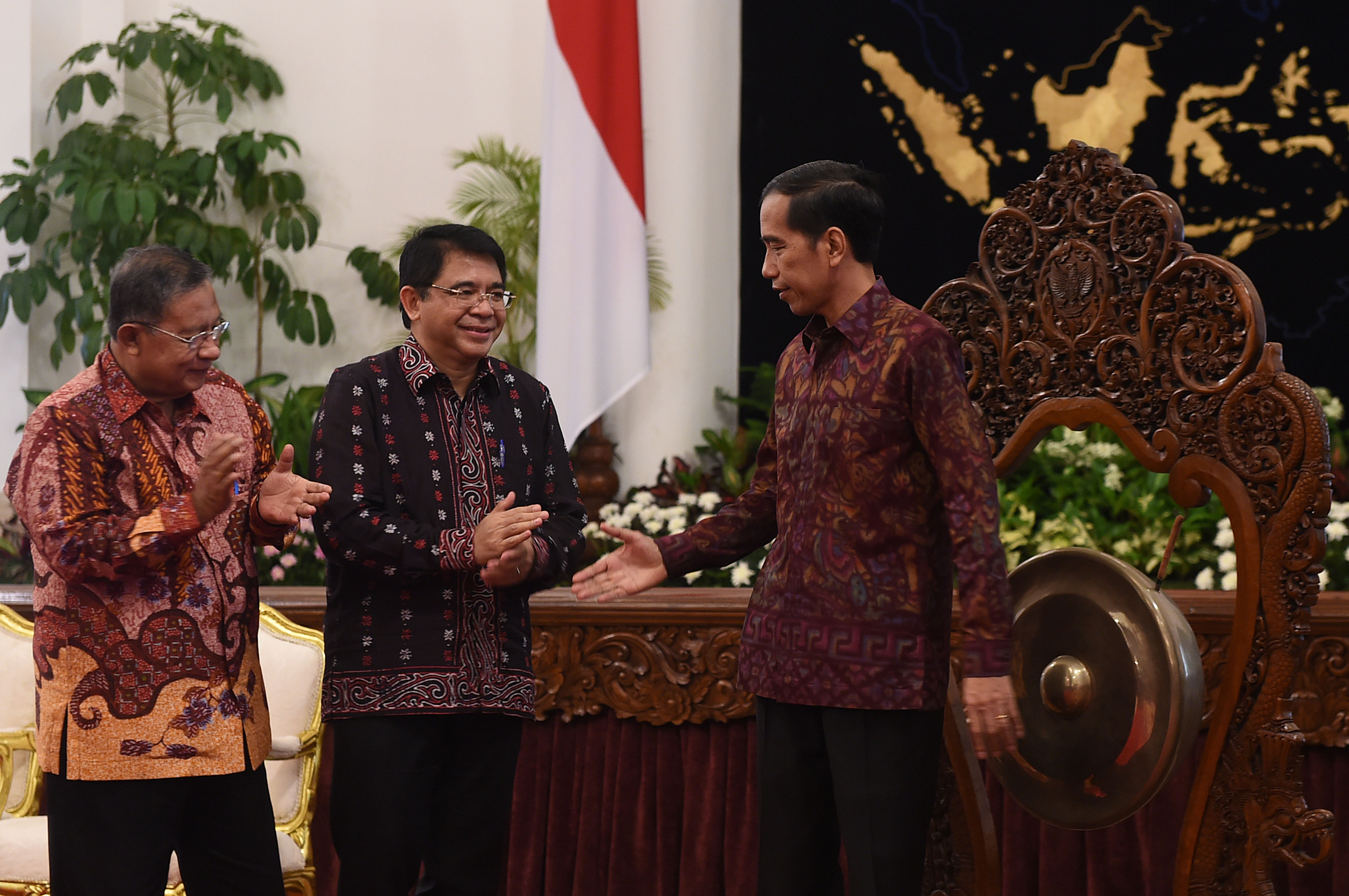 Presiden Joko Widodo (kanan) bersama Kepala BKPM Franky Sibarani (tengah) dan Menko Perekonomian Darmin Nasution (kiri) meresmikan Pembukaan Konsolidasi Perencanaan dan Pelaksanaan Penanaman Modal Nasional (KP3MN) di Istana Negara, Jakarta, Senin (22/2). Dalam kesempatan tersebut, Presiden juga meluncurkan Kemudahan Investasi Langsung Konstruksi di Kawasan Industri serta Peningkatan Layanan Izin Investasi tiga jam Bidang Infrastruktur yang bertujuan meningkatkan iklim investasi di Indonesia. ANTARA FOTO/Puspa Perwitasari/aww/16.