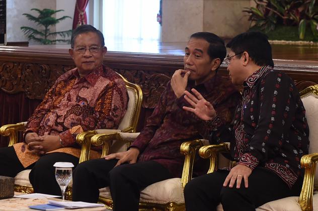 Presiden Joko Widodo (tengah) berbincang dengan Kepala BKPM Franky Sibarani (kanan) dan Menko Perekonomian Darmin Nasution (kiri) di sela-sela peresmian Pembukaan Konsolidasi Perencanaan dan Pelaksanaan Penanaman Modal Nasional (KP3MN) di Istana Negara, Jakarta, Senin (22/2). Dalam kesempatan tersebut, Presiden juga meluncurkan Kemudahan Investasi Langsung Konstruksi di Kawasan Industri serta Peningkatan Layanan Izin Investasi tiga jam Bidang Infrastruktur yang bertujuan meningkatkan iklim investasi di Indonesia. ANTARA FOTO/Puspa Perwitasari/aww/16.