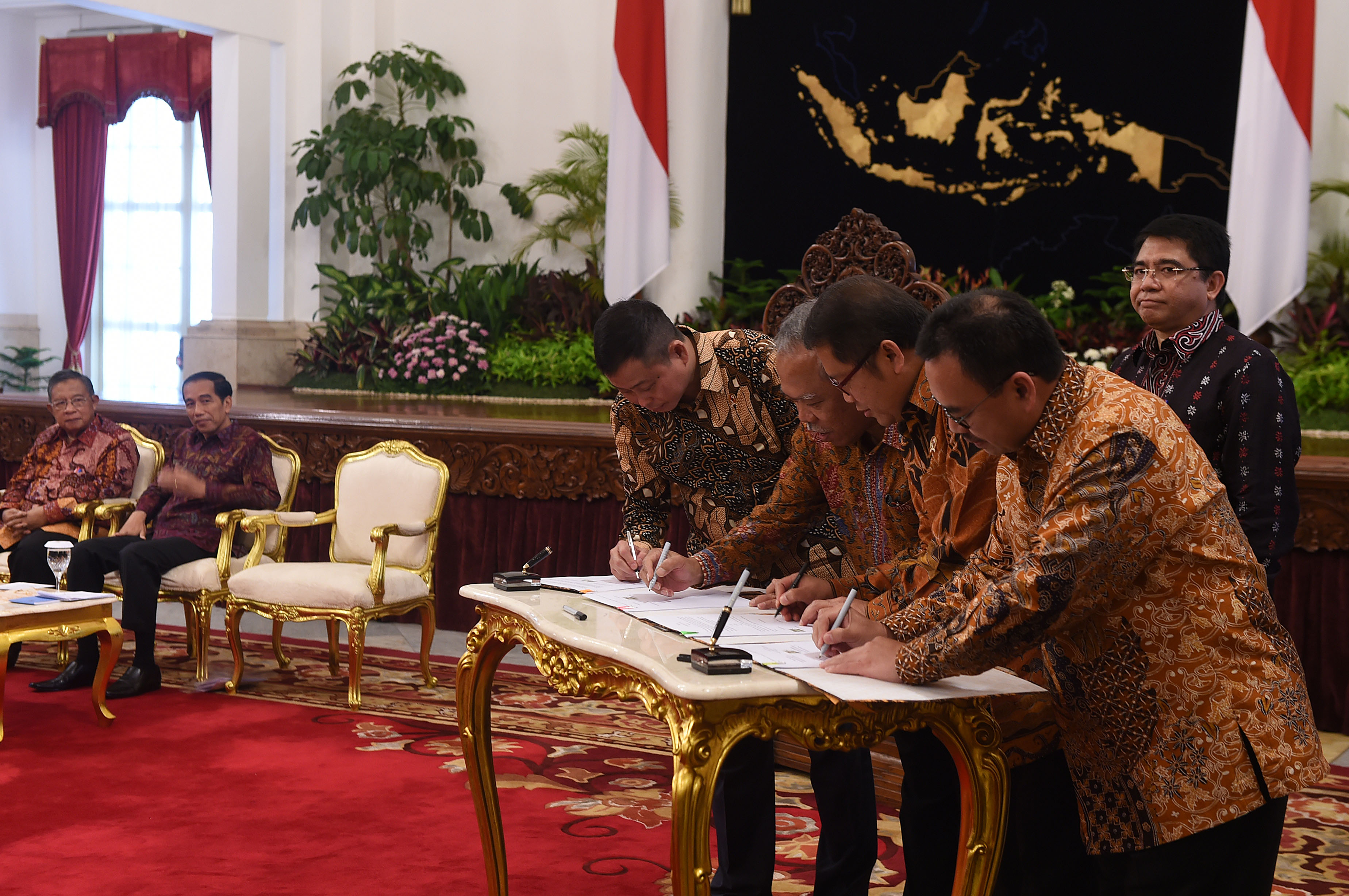 Presiden Joko Widodo (kedua kiri) didampingi Menko Perekonomian Darmin Nasution (kiri), Kepala BKPM Franky Sibarani (kanan) menyaksikan penandatanganan Konsolidasi Perencanaan dan Pelaksanaan Penanaman Modal Nasional (KP3MN) oleh Menteri ESDM Sudirman Said, Menkominfo Rudiantara, Menteri PU dan Perumahan Rakyat Basuki, dan Menteri Perhubungan Ignasius Jonan di Istana Negara, Jakarta, Senin (22/2). Dalam kesempatan tersebut, Presiden juga meluncurkan Kemudahan Investasi Langsung Konstruksi di Kawasan Industri serta Peningkatan Layanan Izin Investasi tiga jam Bidang Infrastruktur yang bertujuan meningkatkan iklim investasi di Indonesia. ANTARA FOTO/Puspa Perwitasari/aww/16.