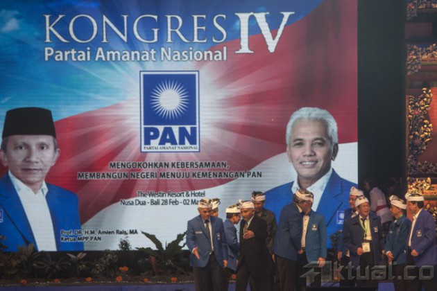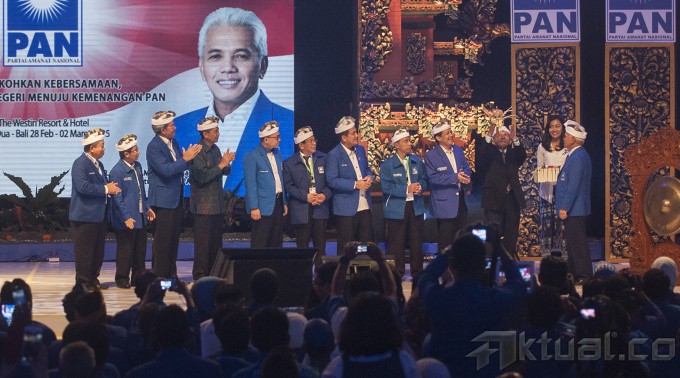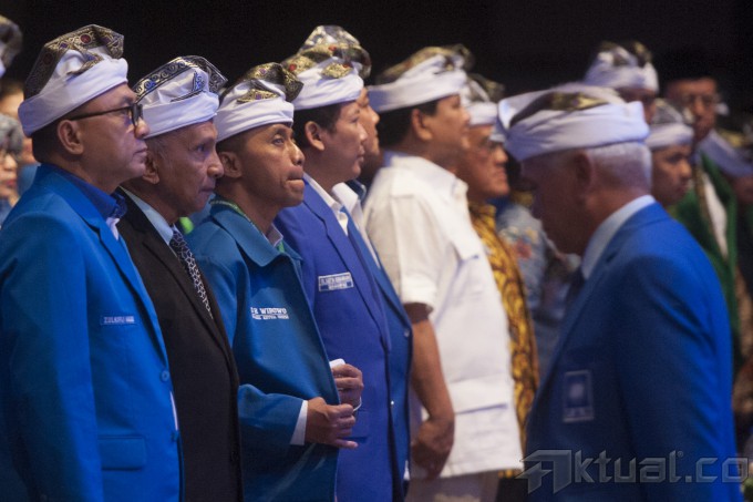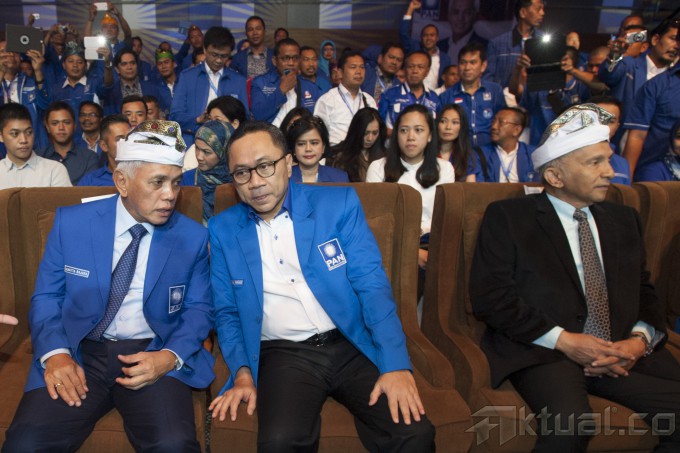 Ketua Umum PAN Hatta Rajasa (kiri) berbincang dengan Ketua DPP PAN Zulkifli Hasan (tengah) bersama Ketua Majelis Pertimbangan Partai (MPP) PAN Amien Rais (kanan) dalam pembukaan Kongres IV Partai Amanat Nasional (PAN), Bali, Sabtu (28/2). Kongres tersebut dijadwalkan berlangsung hingga 2 Maret 2015 dengan salah satu agenda pentingnya yaitu pemilihan ketua umum PAN periode 2015-2020. ANTARA FOTO/Rosa Panggabean
