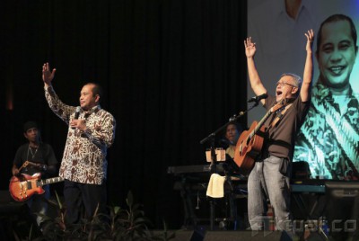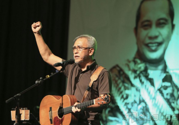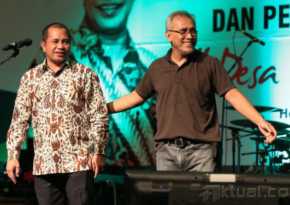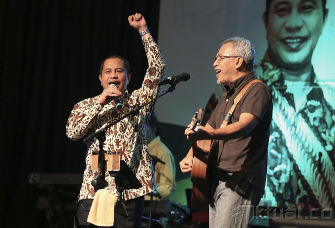 Musisi Iwan Fals bernyanyi bersama bersama Menteri Desa, Pembangunan Daerah Tertinggal dan Transmigrasi Marwan Jafar saat Peresmian Pendampingan Desa di Hotel Bidakara, Jakarta, Selasa (31/3/2015). Iwan Fals menjadi Duta Desa Kementerian Desa, Pembangunan Daerah Tertinggal dan Transmigrasi dan akan berkeliling desa-desa untuk mengisnpirasi warga desa untuk membangun desa. AKTUAL/TINO OKTAVIANO
