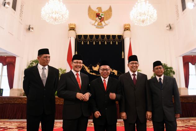 Presiden Joko Widodo (kedua kiri) bersiap melantik direksi dan dewan pengawas BPJS Kesehatan serta BPJS Ketenagakerjaan di Istana Negara, Jakarta, Selasa (23/2). Presiden melantik Fachmi Idris sebagai Direktur Utama Badan Penyelenggara Jaminan Sosial (BPJS) Kesehatan 2016-2021 dan Agus Susanto sebagai Direktur Utama BPJS Ketenagakerjaan masa jabatan 2016-2021. ANTARA FOTO/Puspa Perwitasari/aww/16.