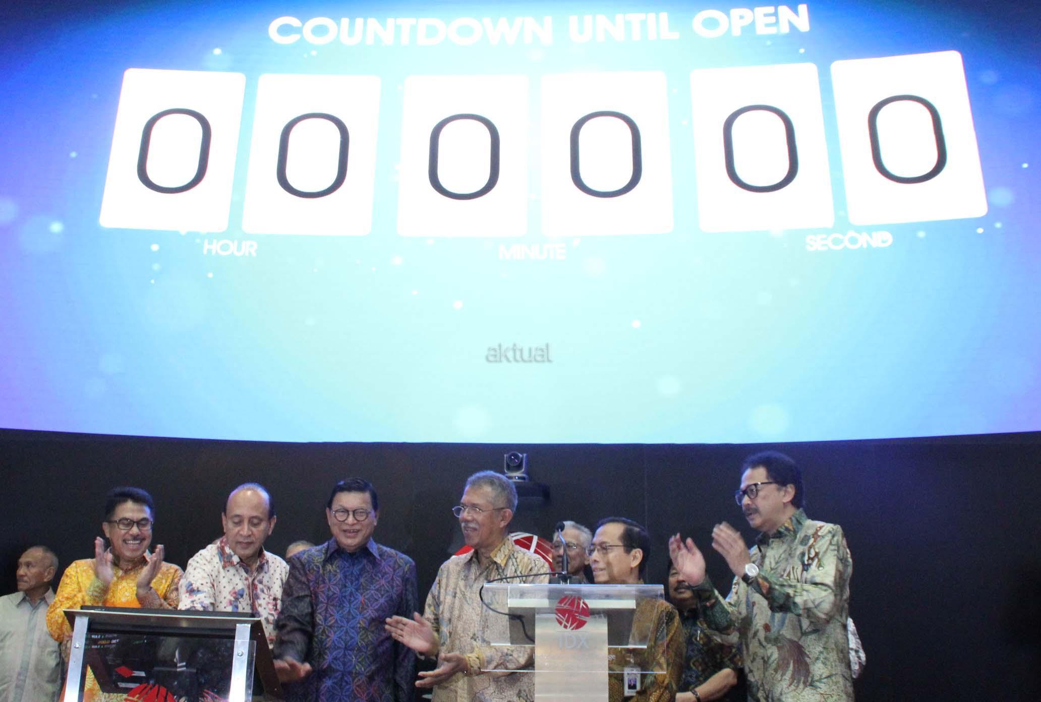 Fuad Bawazier Mantan Menteri Keuangan didampingi Mantan Komisaris dan Direksi Bursa periode terdahulu juga Direktur Utama Bursa Efek Indonesia (BEI) Tito Sulistio menekan tombol pembukaan perdagangan di Bursa Efek Indonesia, Jakarta, Kamis (13/7). Swastanisasi Bursa Efek Indonesia yang ke 25 tahun dihadiri para mantan komisaris dan direksi sebelumnya dirayakan dengan melihat kilas balik sejak berdirinya pasar modal indonesia. AKTUAL/Eko S Hilman