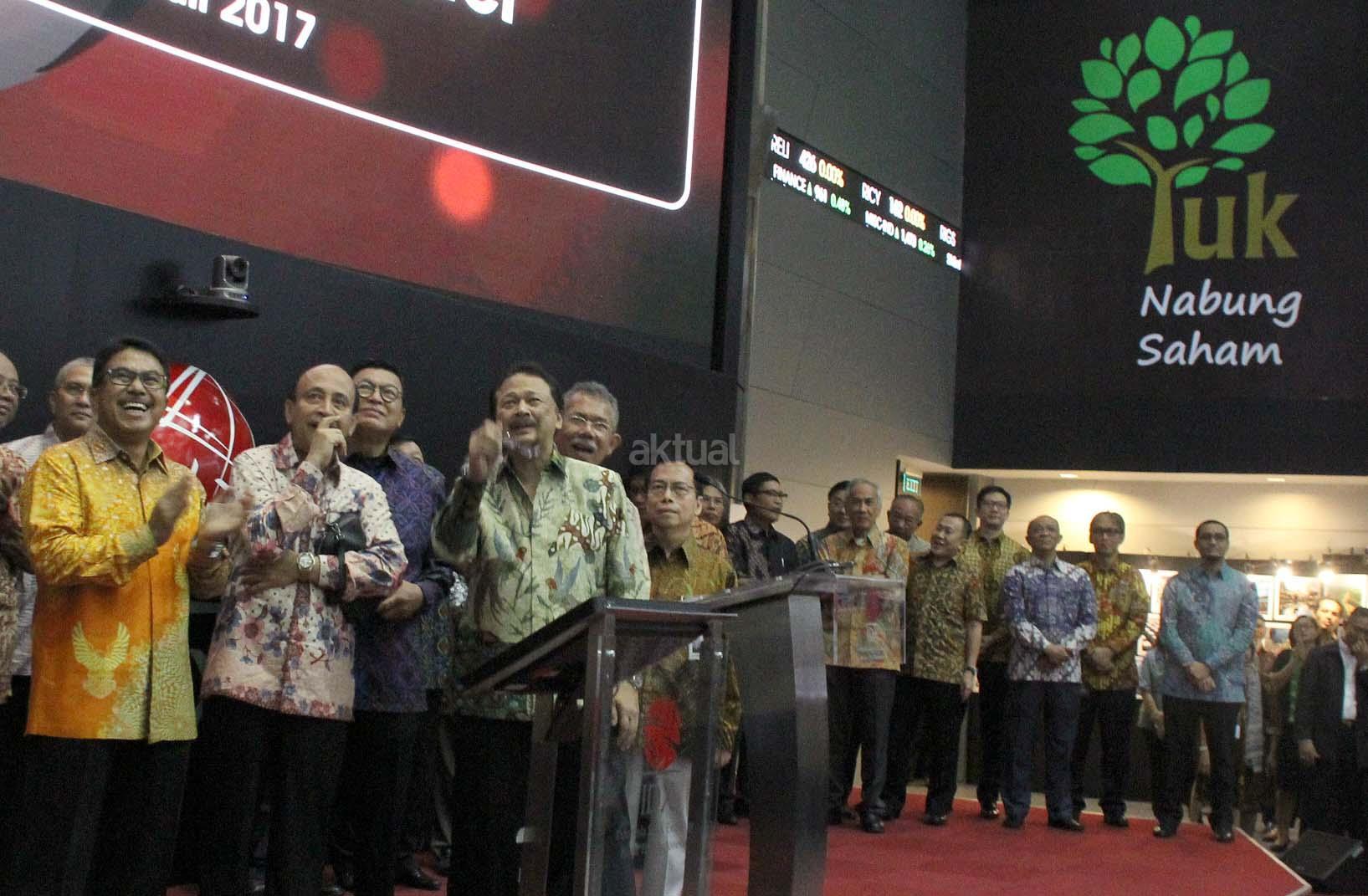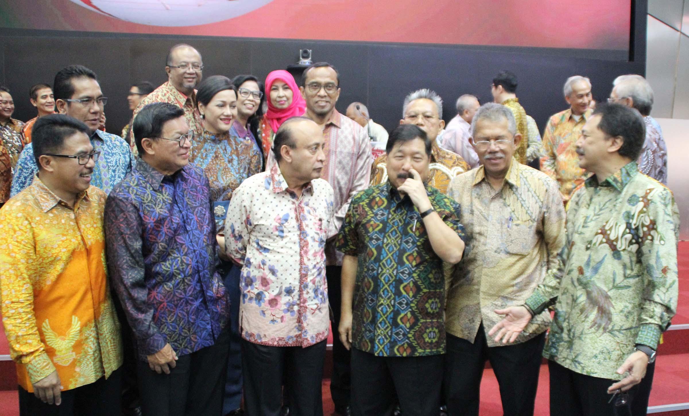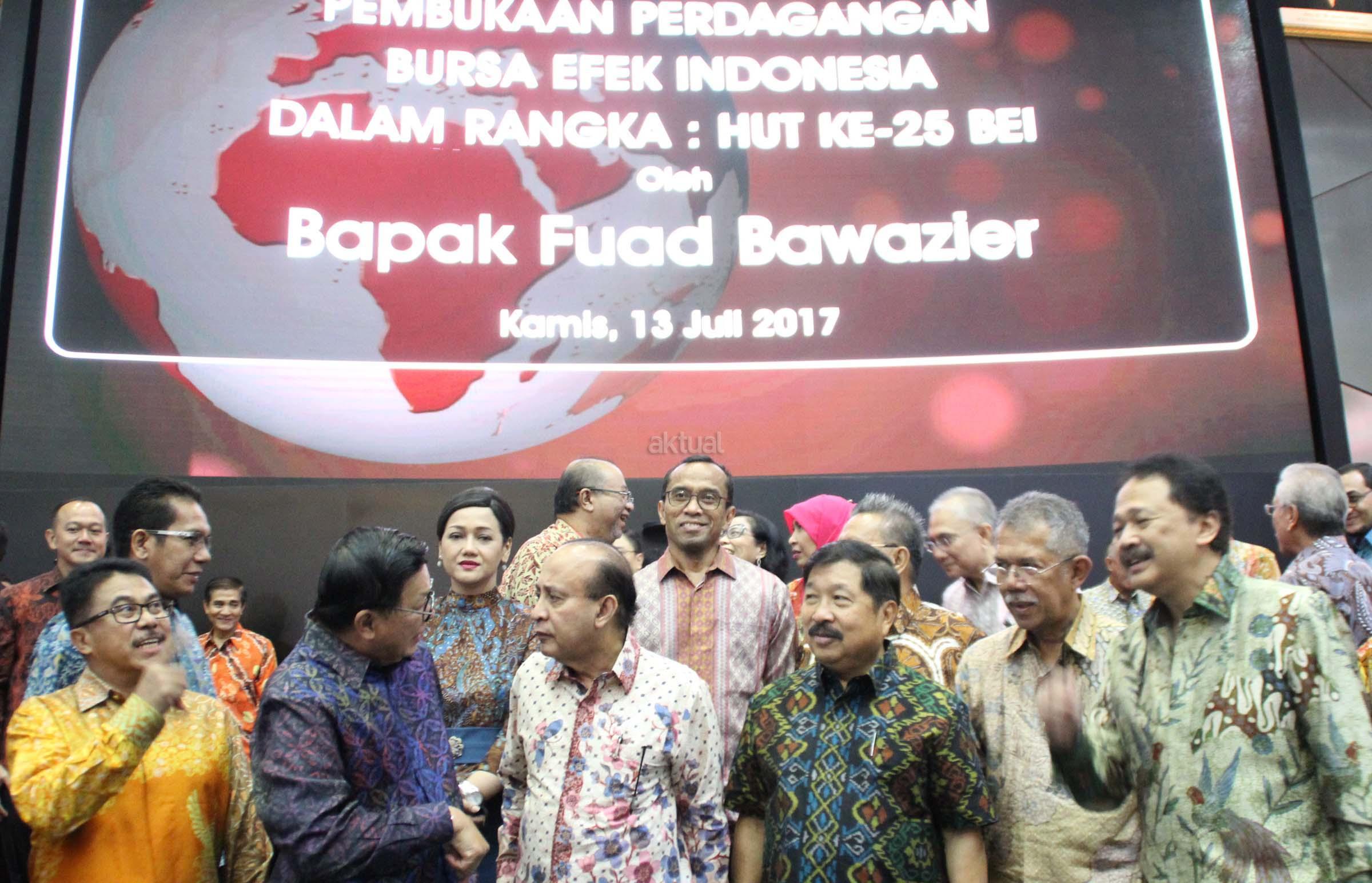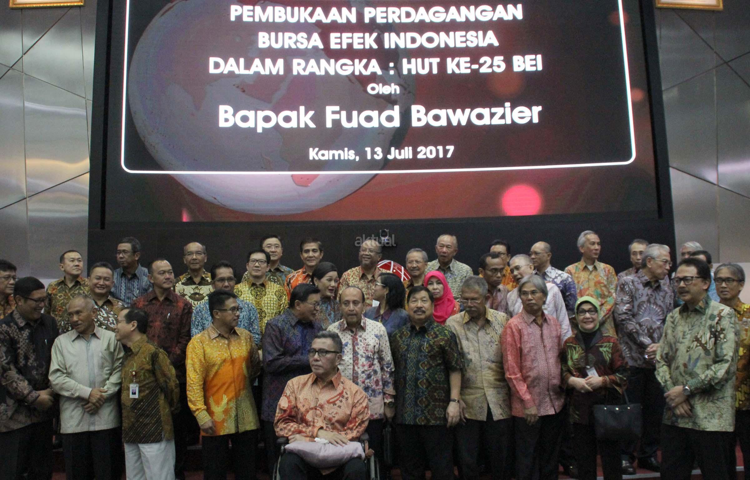 Fuad Bawazier Mantan Menteri Keuangan didampingi Mantan Komisaris dan Direksi Bursa periode terdahulu juga Direktur Utama Bursa Efek Indonesia (BEI) Tito Sulistio saat menhadiri pembukaan di Bursa Efek Indonesia, Jakarta, Kamis (13/7). Swastanisasi Bursa Efek Indonesia yang ke 25 tahun dihadiri para mantan komisaris dan direksi sebelumnya dirayakan dengan melihat kilas balik sejak berdirinya pasar modal indonesia. AKTUAL/Eko S Hilman