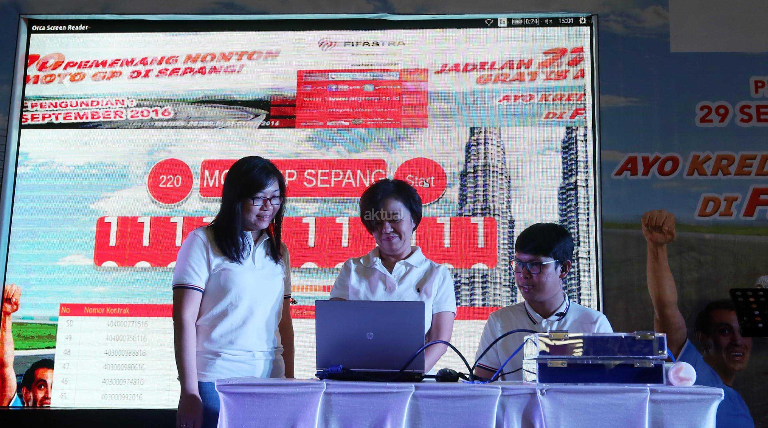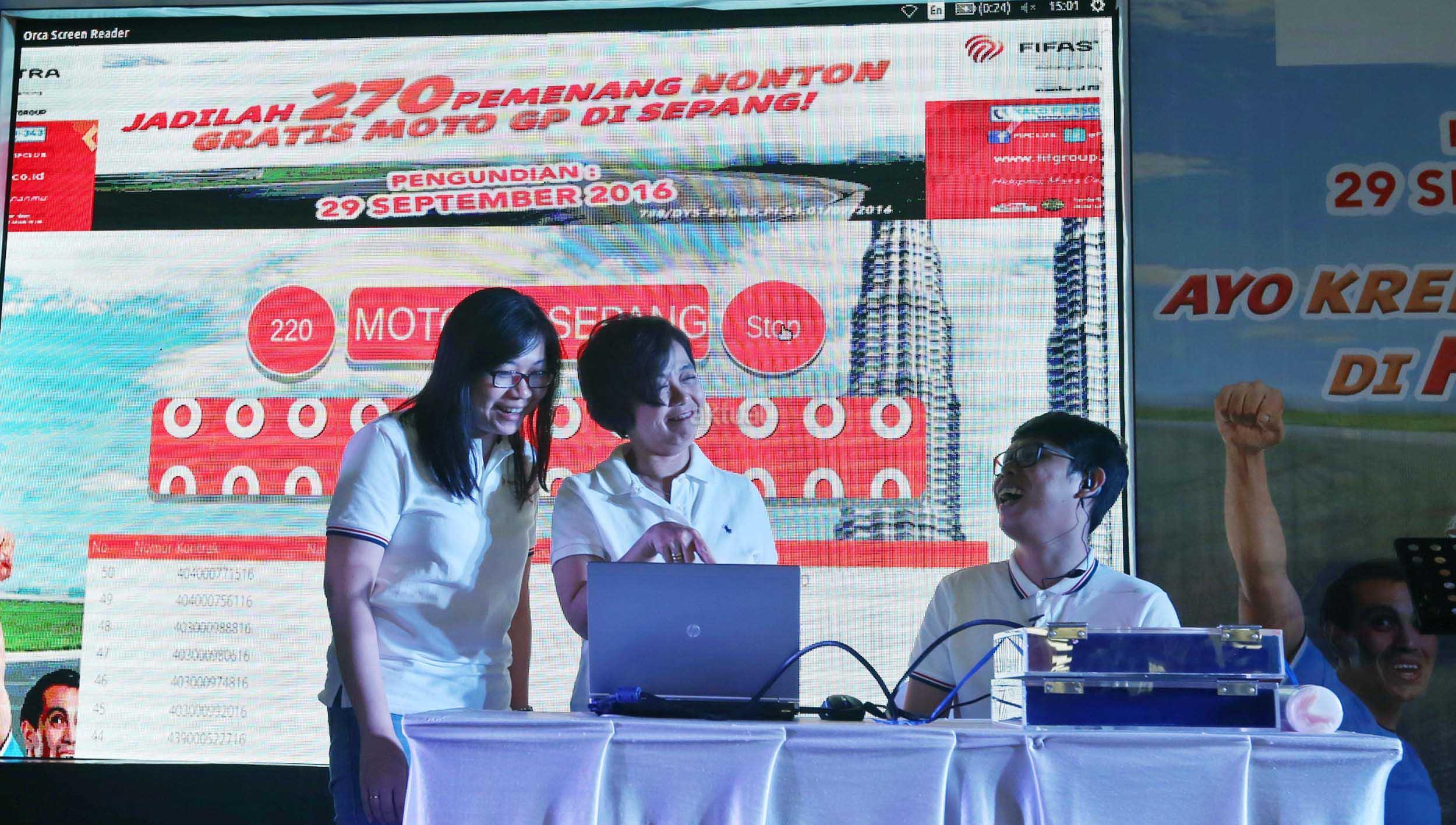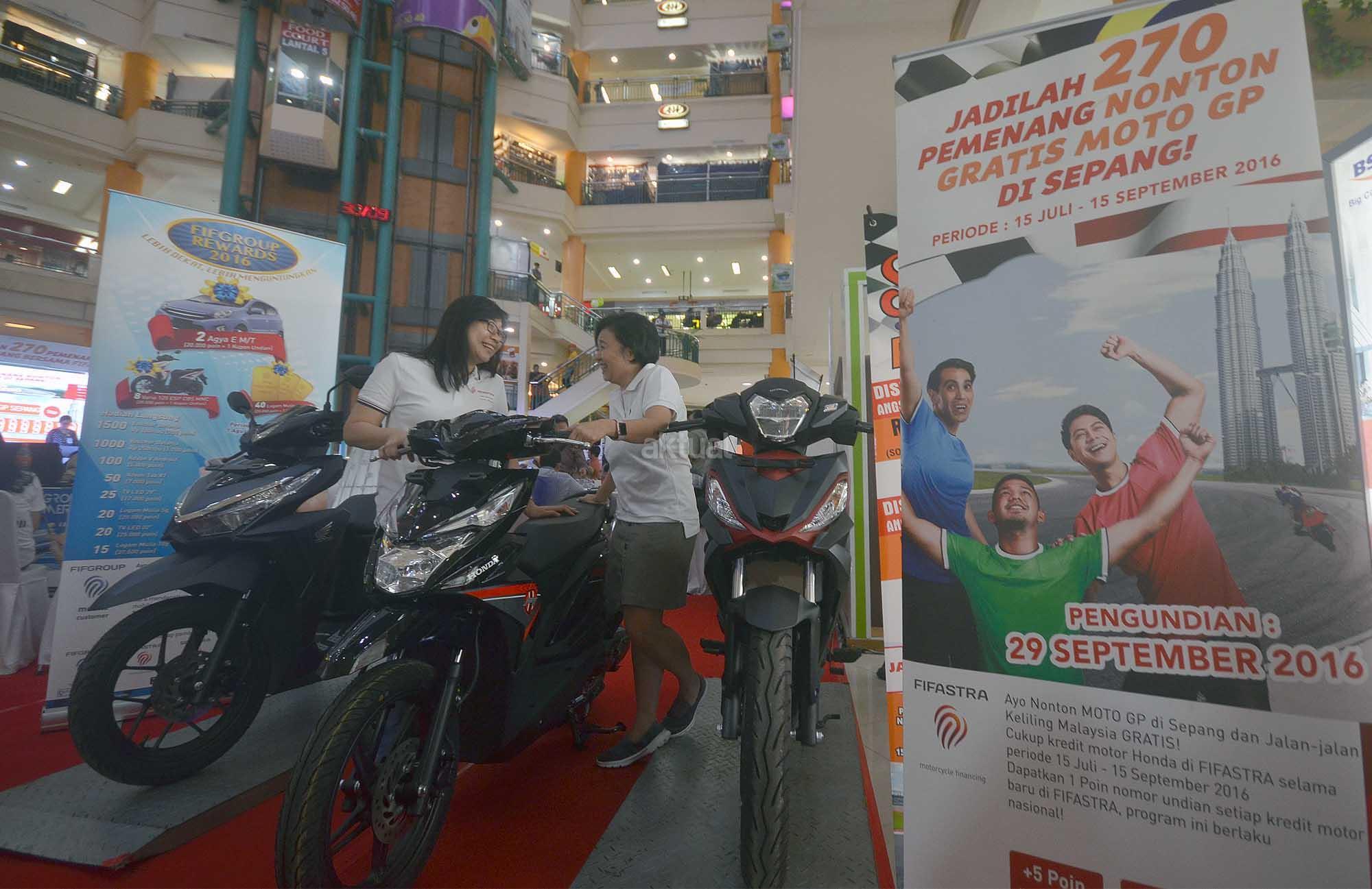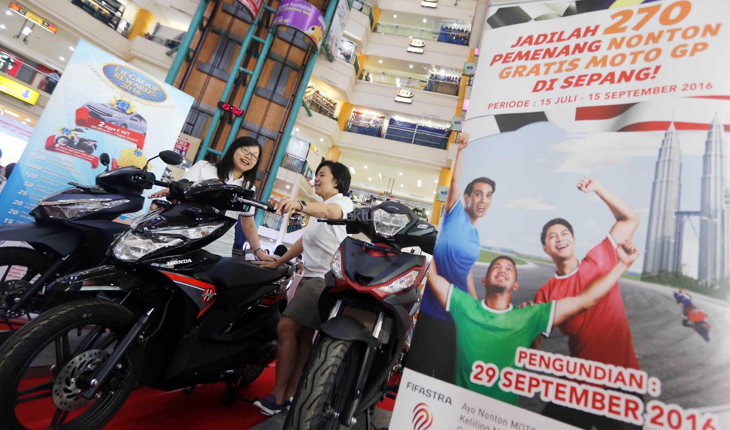 Marketing Head FIFASTRA Rita Sukmawangi (kanan) bersama Marketing Communications Head Theresia Muliani, melihat sejumlah motor yang ditawarkan agar bisa mengikuti undian menonton lomba motoGP di Sepang, Malaysia, di Jakarta, Kamis (29/9). FIFASTRA, perusahaan pembiayaan, memberangkatkan 270 nasabahnya yang memenangkan undian menonton lomba motoGP di Sepang, Malaysia, Oktober 2016 mendatang. Aktual/Eko S Hilman