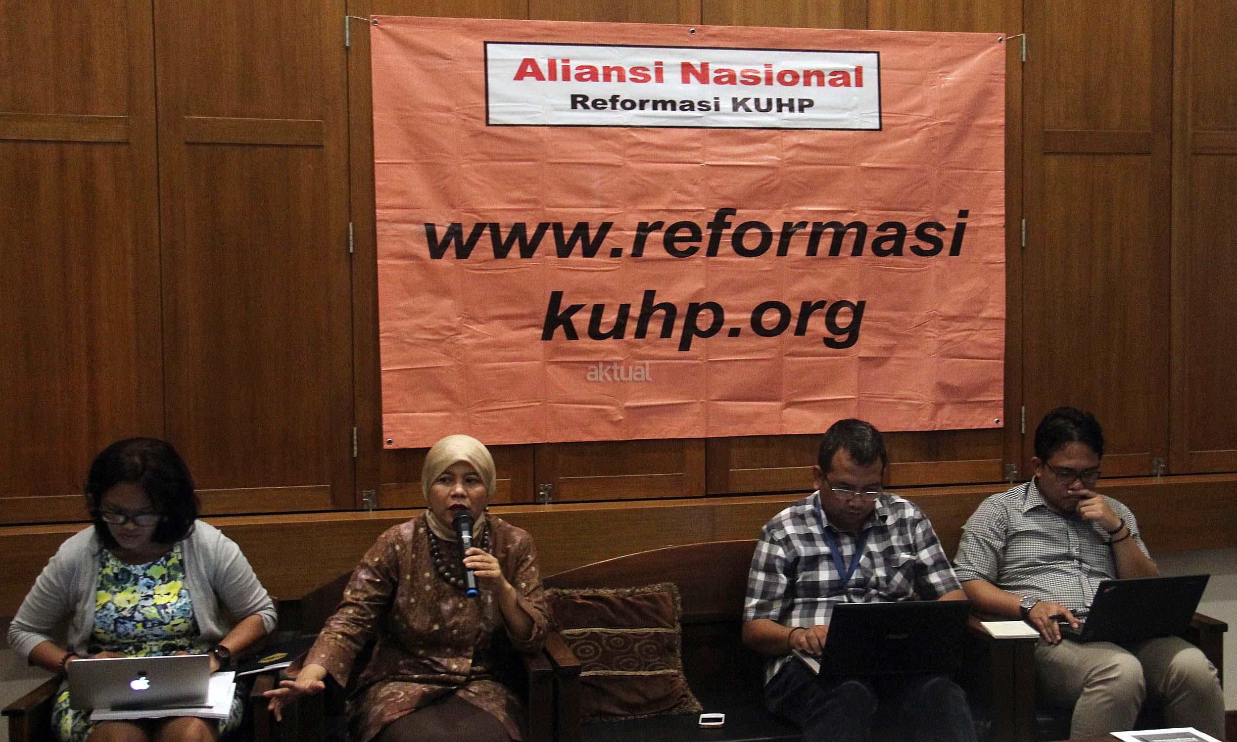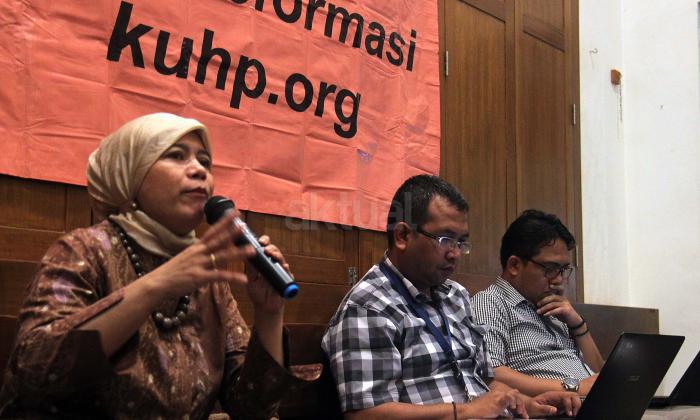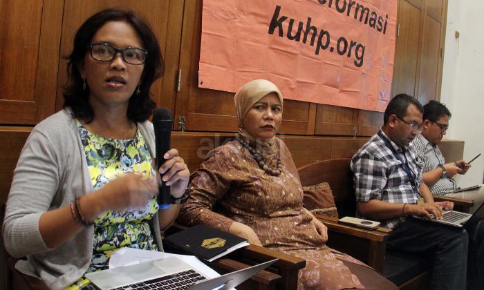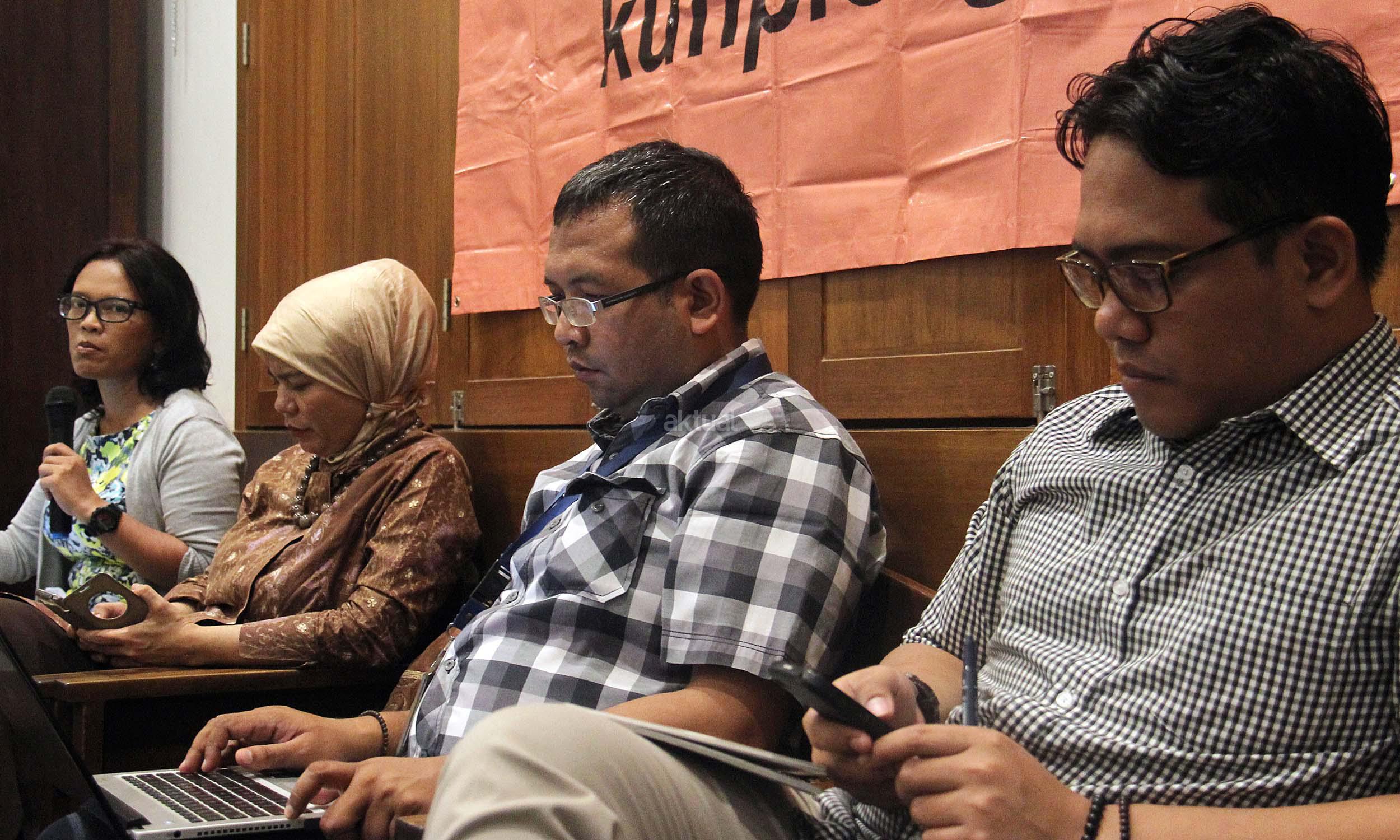 Kiri-kanan; Peneliti LIPI Irene Hiraswari, Komisioner Komnas HAM Roichatul Aswidah, Peneliti ICJR Anggara Suwahju, dan Deputi Direktur ELSAM Wahyudi Djafar hadir dalam diskusi "Kebebasan Berekpresi Pasca Reformasi Sampai Hari Ini Dalam Rancangan KUHP", di Jakarta, Senin (23/5/2016). Diskusi tersebut dilatari dengan tren kebebasan berekspresi sejak era reformasi 1998 hingga saat ini.