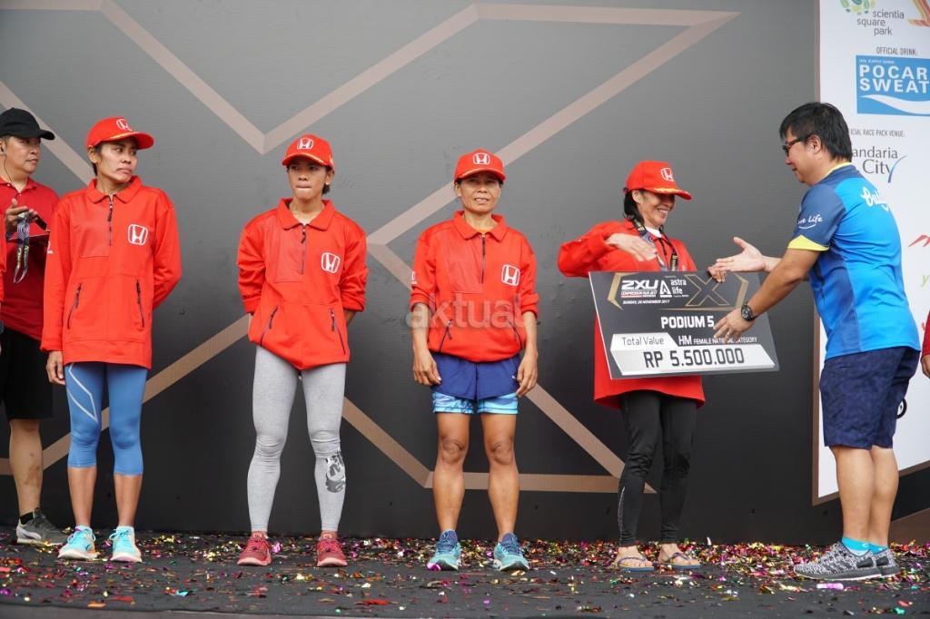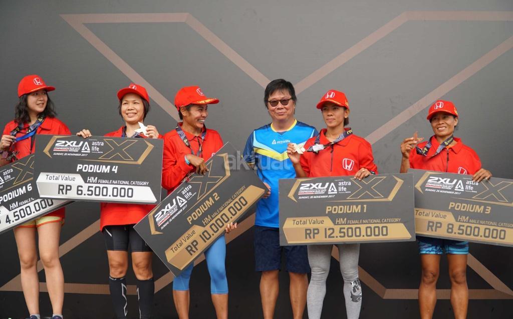 Presdir Astra Life Auddie Wiranata foto bersama dengan pemenang kategori half marathon female 2XU Compression Run Indonesia 2017 usai pemberian medali pemenang & simbolis hadiah berupa uang tunai bernilai jutaan rupiah dari berbagai sponsor di kawasan Scientia Square Park, Summarecon Serpong, Minggu (26/11/2017). AKTUAL/Eko S Hilman
