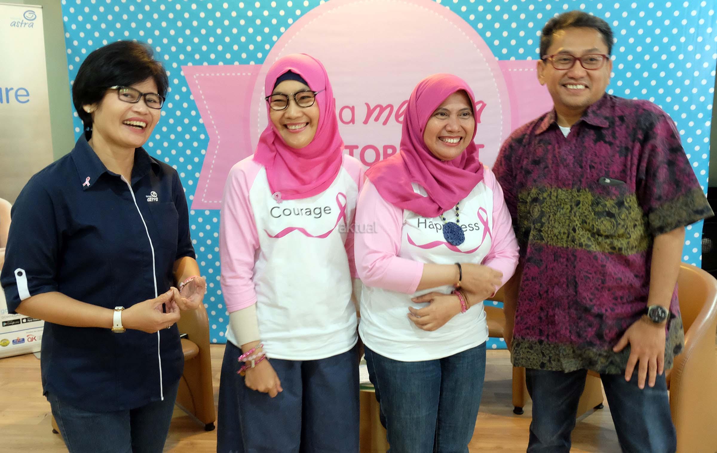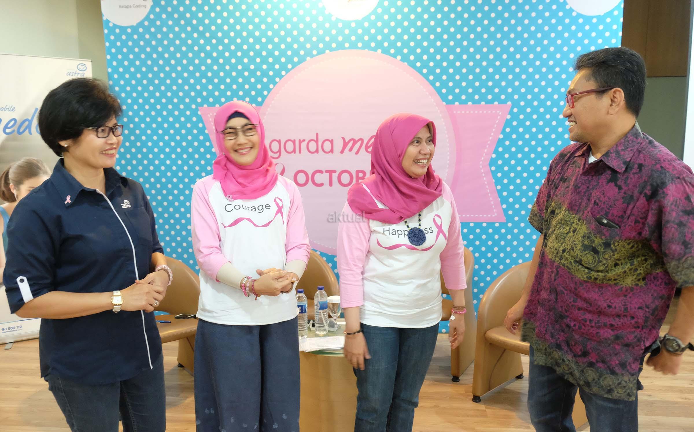 VP Health Bussiness Asuransi Astra, Sri Rochyani Andarwati (kiri) bersama Ahli medis RS Mitra Keluarga Kelapa Gading, dr.Walta Gautama ,SpB(K) Onk (kanan) berbincang dengan para survivor kanker payudara dari Love Pink disela kegiatan kampanye peduli kanker payudara di rumah sakit Mitra Keluarga Kelapa Gading, Sabtu, (22/10). Garda Medika Octobreast adalah kegiatan kampanye peduli kanker payudara yang sudah dilakukan selama empat tahun berturut-turut yang ditujukan untuk semua kalangan masyarakat sebagai bagian dari kegiatan CSR perusahaan. Kegiatan ini bekerja sama dengan Love Pink Indonesia sebagai wadah bagi para penderita kanker payudara. Sebelumnya, rangkaian kegiatan Garda Medika Octobreast jg diadakan dalam format nonton bareng film Pinky Promise (tentang para pejuang kanker payudara) di beberapa kota seperti Jakarta, Makassar, dan Medan. AKTUAL/Eko S Hilman