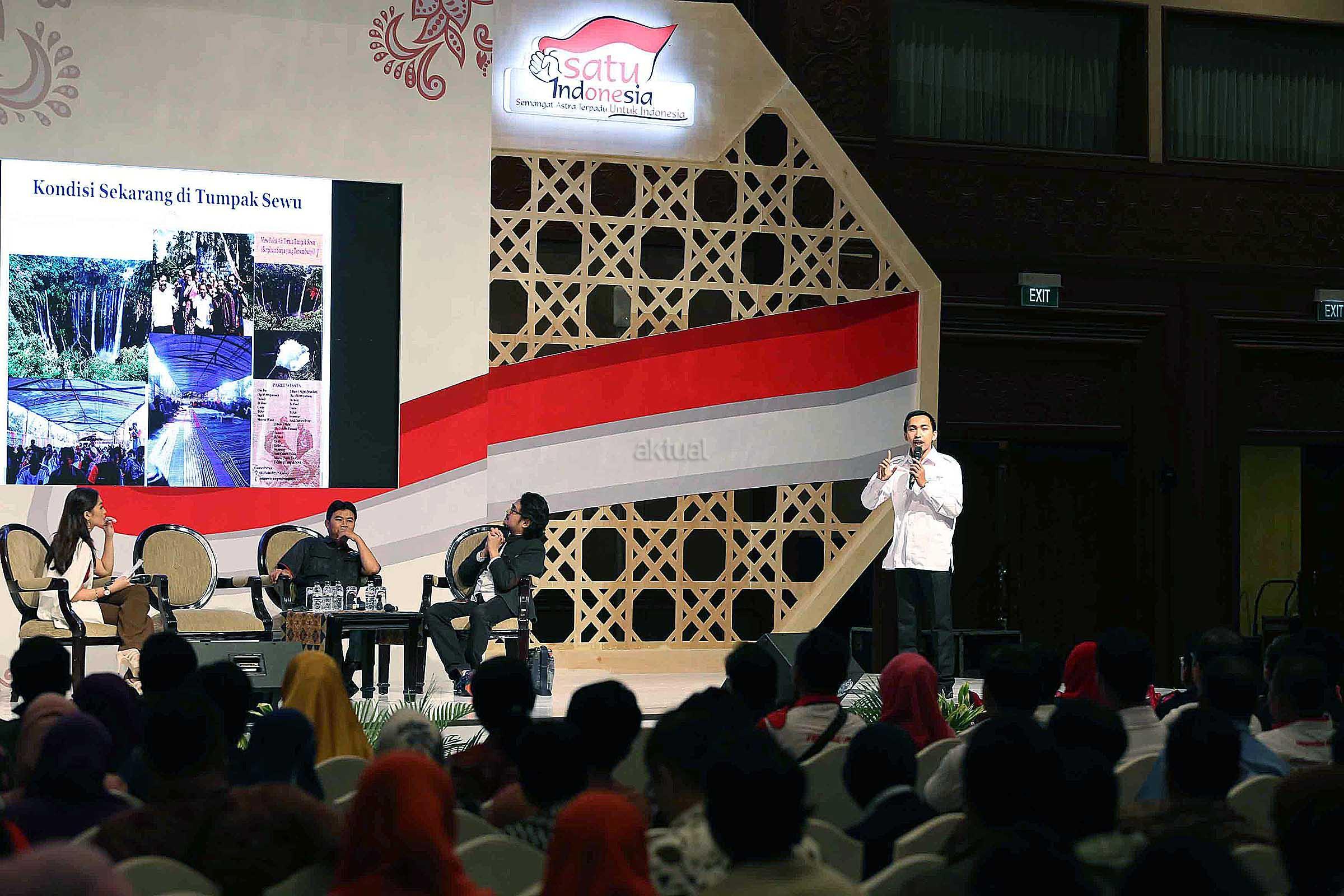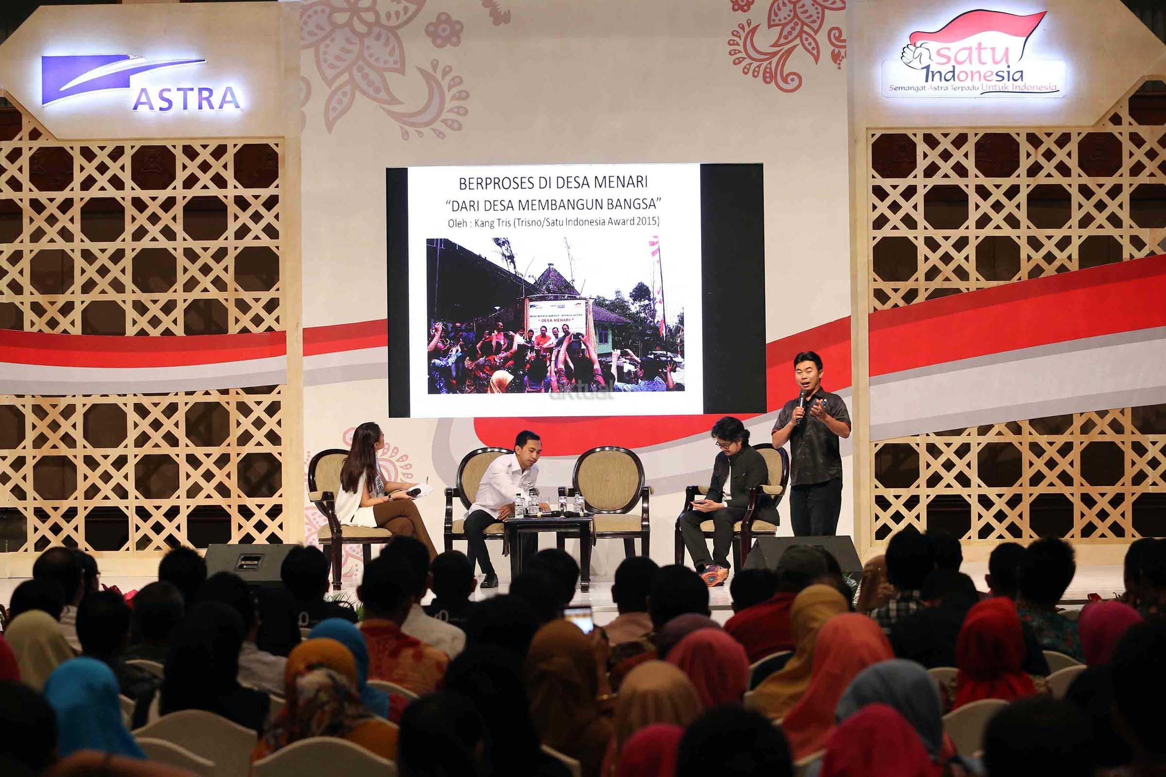 Penerima apresiasi SATU Indonesia Awards 2015 Trisno menceritakan kisahnya membangun “Desa Menari” Dusun Tanon di Kabupaten Semarang di hadapan 300 orang komunitas lingkungan. Selain Trisno hadir juga penerima apresiasi SATU Indonesia Awards 2016 Zainul Arifin (kedua kiri) dan Co-founder Indonesia Berkebun dan Ayah ASI Shafiq Pontoh (kedua kanan) dalam kegiatan Festival Kampung Berseri Astra pada acara Inspirasi 60 Tahun Astra, Jakarta, Minggu (26/2).Grup Astra saat ini memiliki 49 Kampung Berseri Astra (KBA) yang tersebar di 17 provinsi di Indonesia dan diharapkan pada akhir 2018 dapat bertambah menjadi 34 provinsi.KBA merupakan program kontribusi sosial Astra untuk masyarakat dengan konsep pengembangan terintegrasi 4 pilar program CSR yaitu Pendidikan, Kewirausahaan, Lingkungan dan Kesehatan.Program pembinaan dan pemberdayaan yang diterapkan melalui KBA ini juga diharapkan dapat berdampak positif kepada masyarakat, sehingga secara kolektif masyarakat dapat mengambil tindakan inisiatif perubahan untuk mengubah kualitas kehidupan masyarakat baik dari segi pendidikan, kesehatan, lingkungan dan peningkatan standar kesejahteraan. AKTUAL/Eko S HIlman