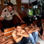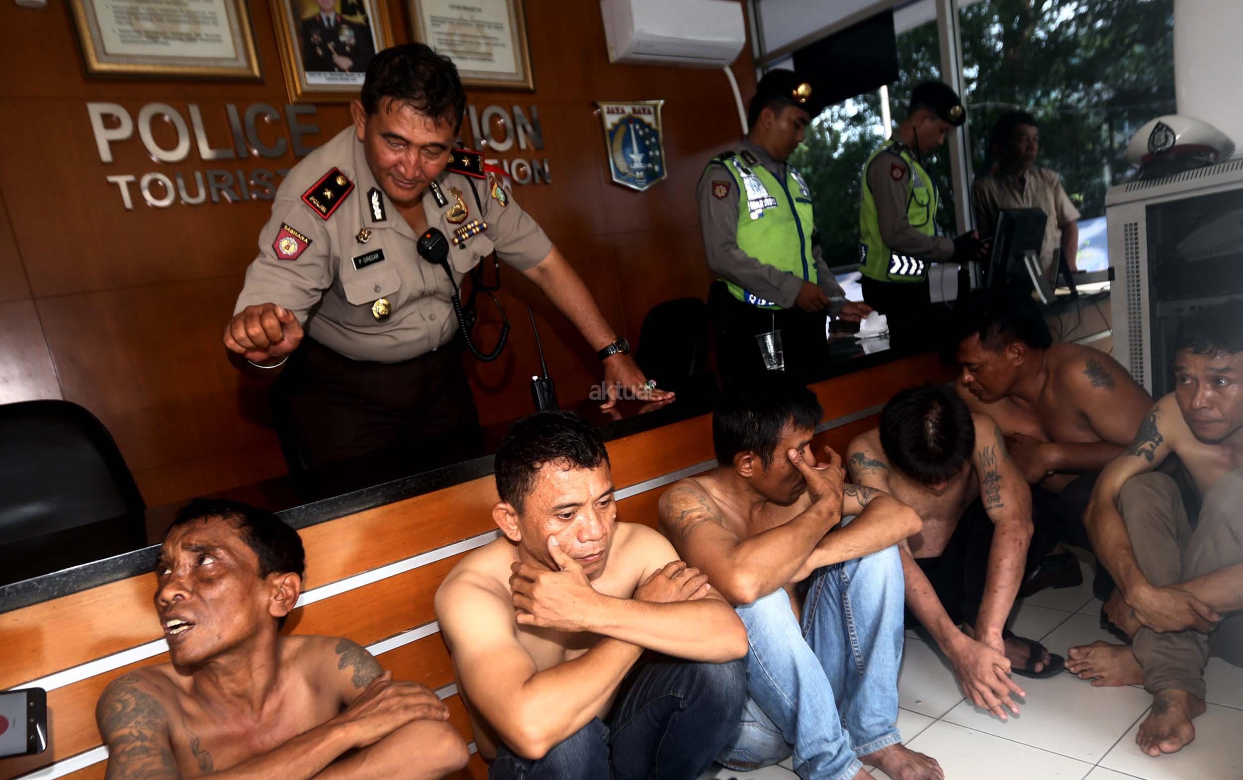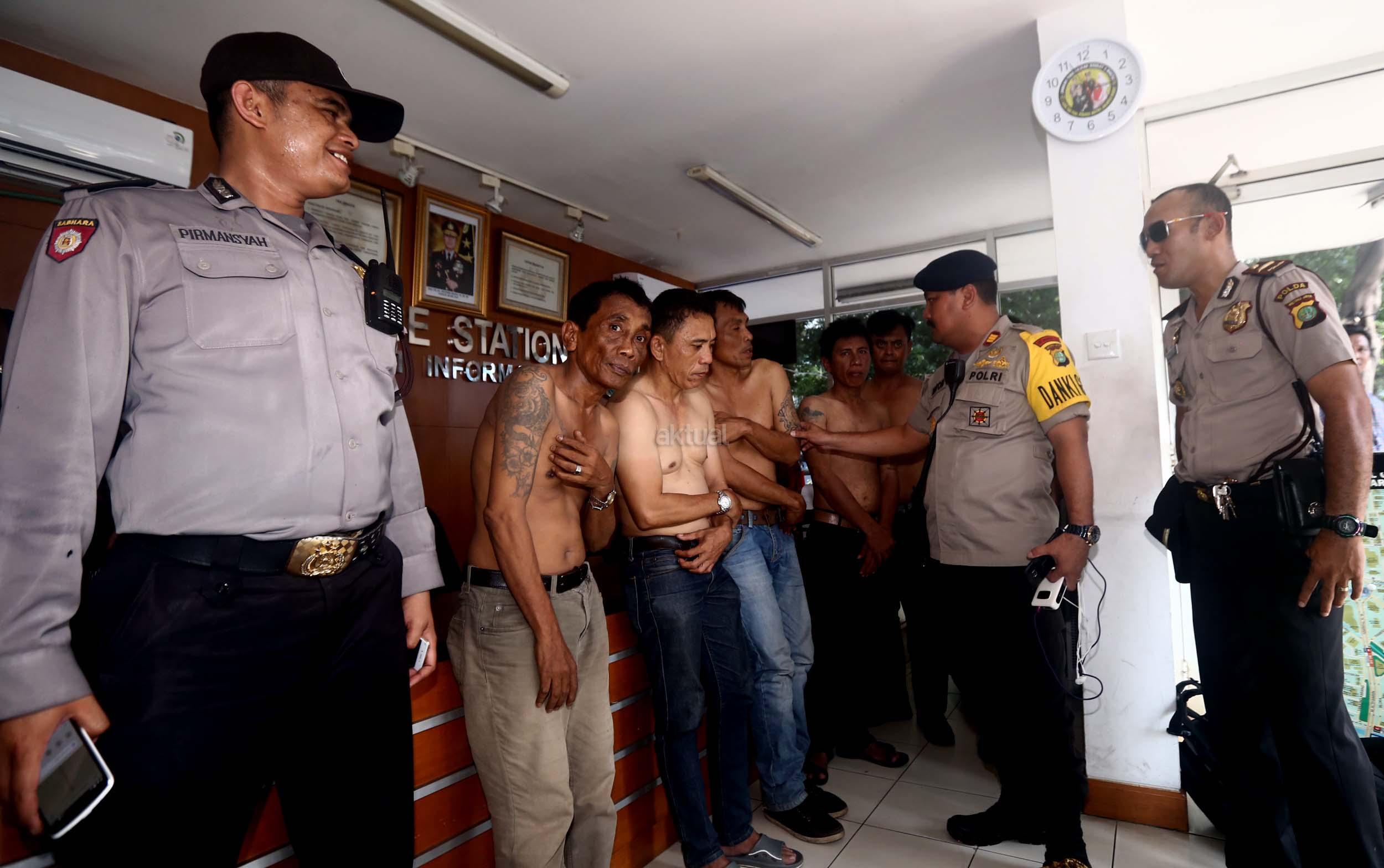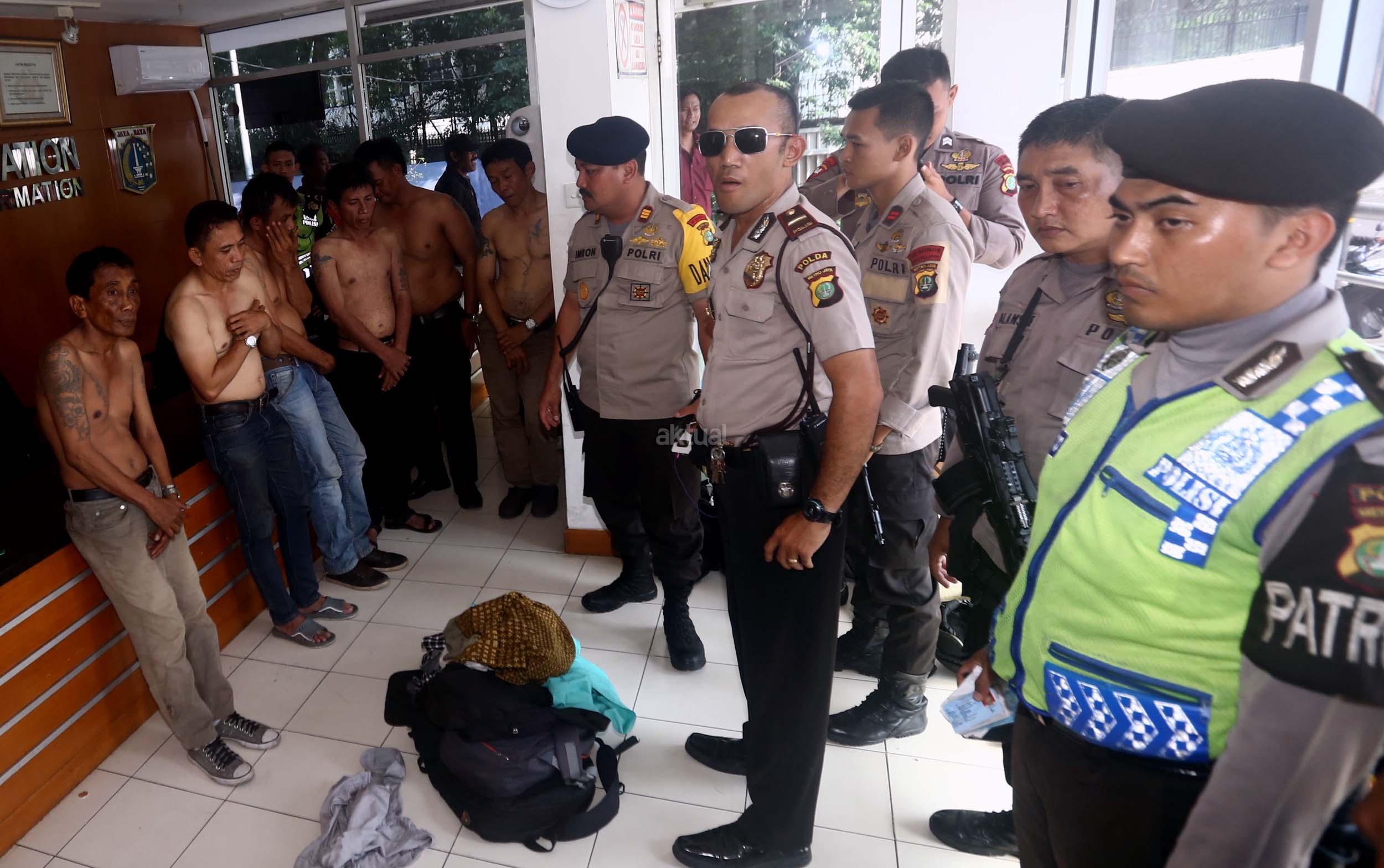 Petugas memeriksa enam tersangka pencopet jaringan Lampung saat diamankan di Bundaran HI, Jakarta, Kamis (2/3/2017). 6 Pencopet jaringan Lampung tertangkap tangan di Metromini. Aksi kelompok pencopet handphone ini berhasil digagalkan penumpang yang berteriak sampai terdengar petugas kepolisian yang sedang melakukan pengamanan kedatangan Raja Arab Saudi di Bundaran HI.