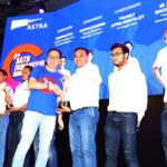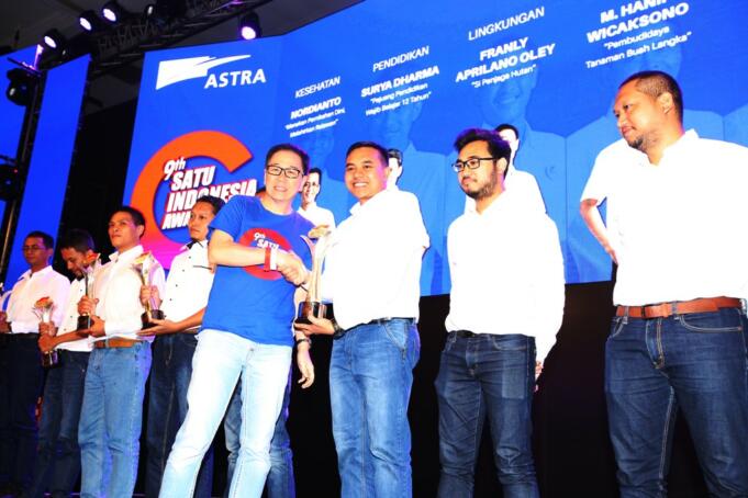Presiden Direktur PT Astra International Tbk Prijono Sugiarto menyerahkan piala kepada salah satu penerima apresiasi 9th SATU Indonesia Awards 2018, Azza Aprisaufa (Teknologi – Aceh) (ketiga kanan) pada malam puncak IdeaFest 2018 di Jakarta, Sabtu (27/10). Selain meraih dana kegiatan sebesar Rp60 juta dan pembinaan kegiatan, Azza juga terpilih sebagai pemenang favorit pilihan publik dan mendapat tambahan hadiah Rp10 juta. AKTUAL/Dok Astra