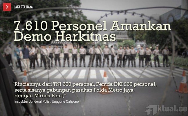 Jakarta, Aktual.co — Sekitar 7.610 personel yang tergabung dari TNI, Polri dan Satpol PP diterjunkan untuk mengamankan jalannya aksi unjuk rasa dalam memperingati Hari Kebangkitan nasional yang jatuh pada hari Rabu (20/5).