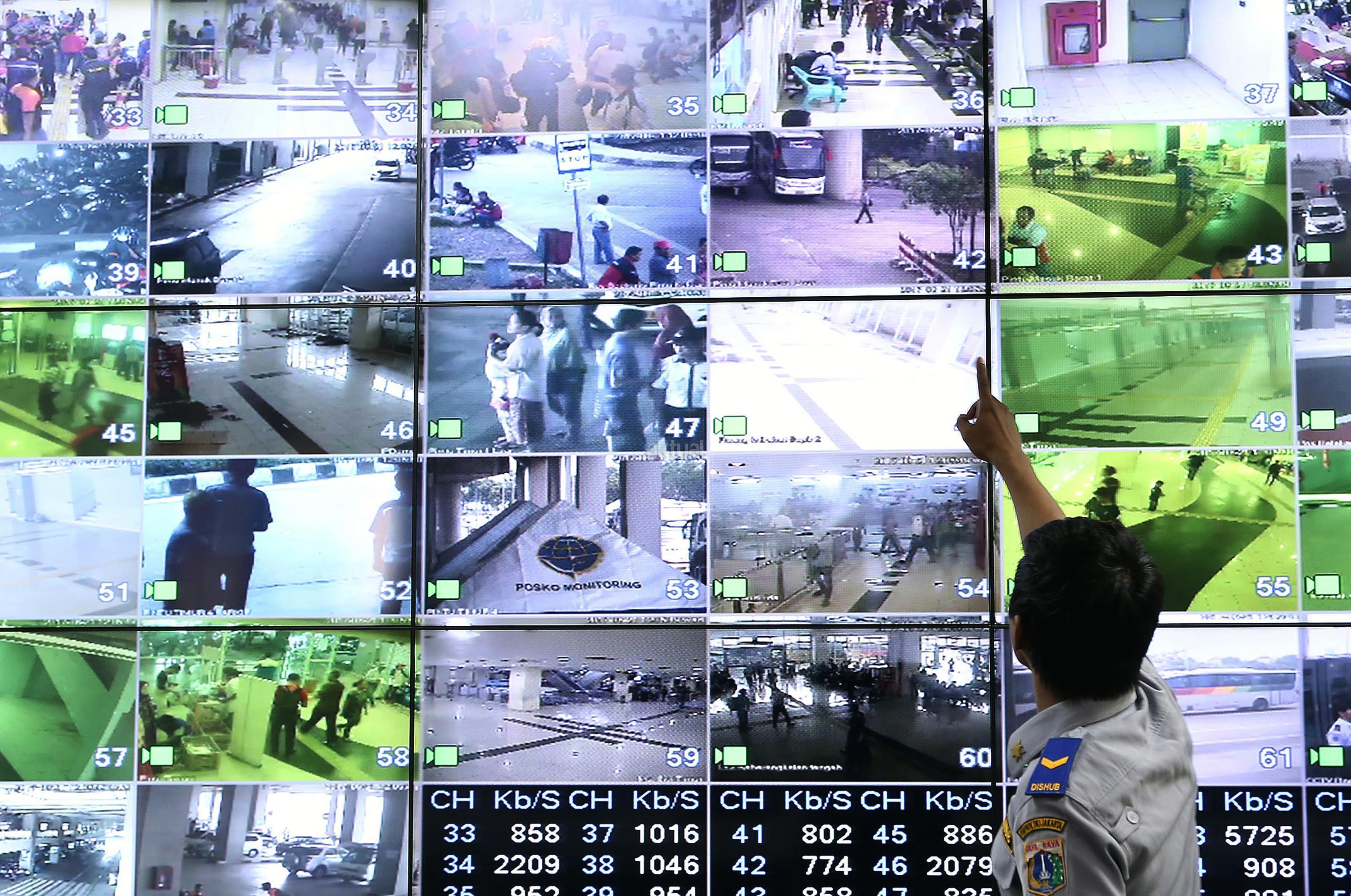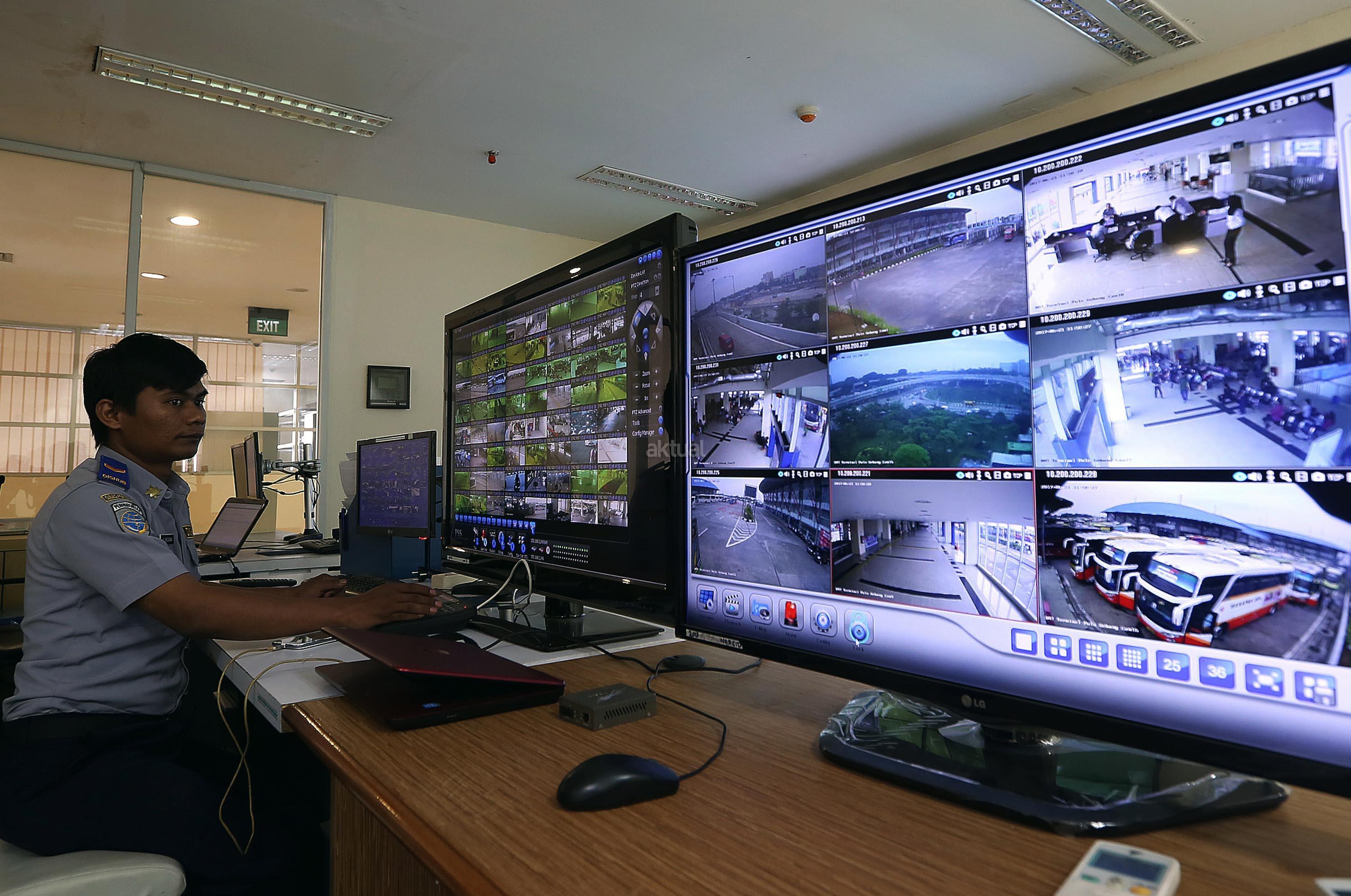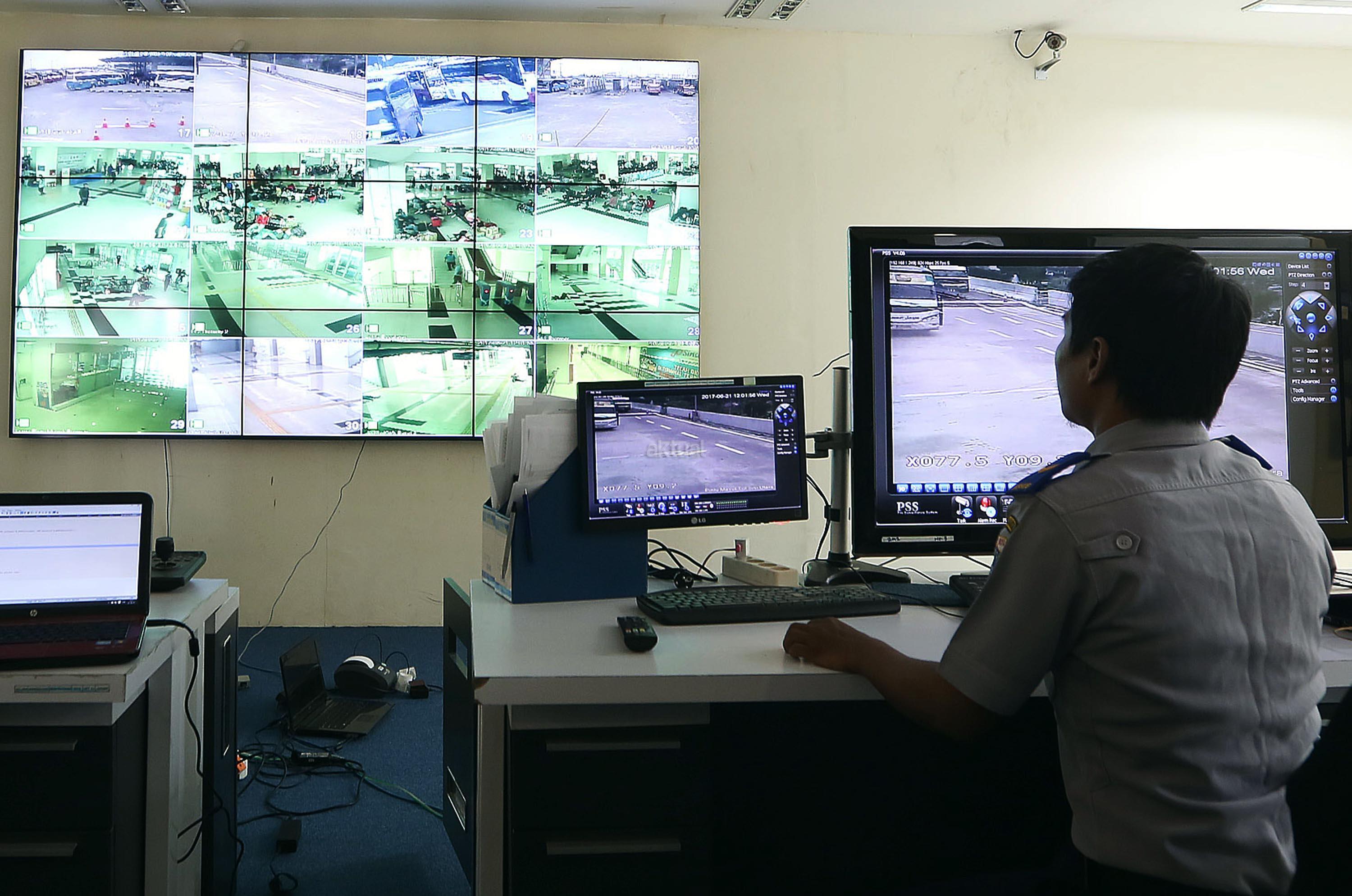 Petugas memantau kegiatan para pemudik dengan melalui CCTV di terminal bus Terpadu Sentra Timur Pulo Gebang, Jakarta Timur, Kamis (22/6/2017). Terdapat 84 CCTV terpasang untuk memantau seluruh kegiatan arus mudik terminal Pulo Gebang. AKTUAL/Munzir
