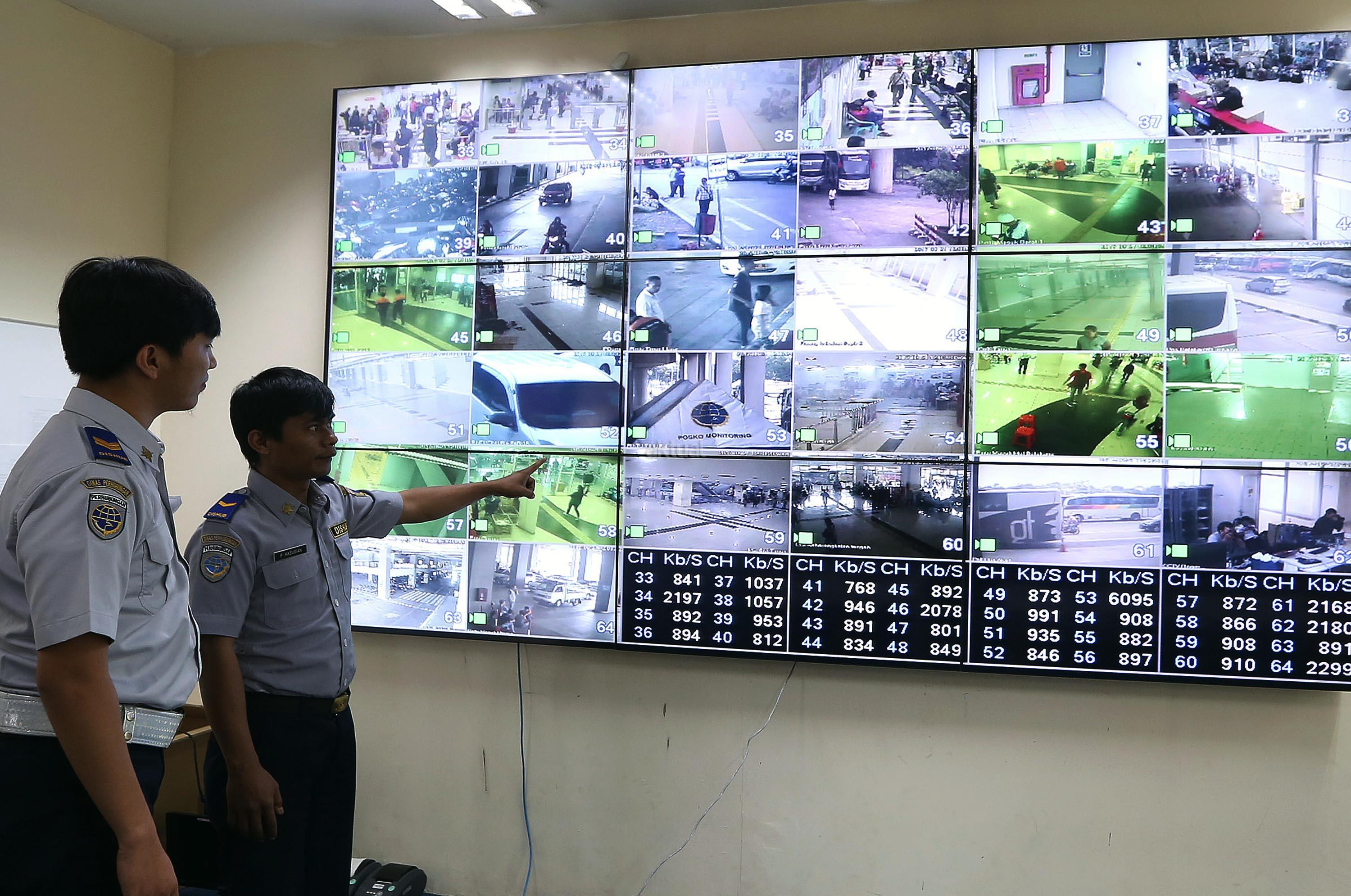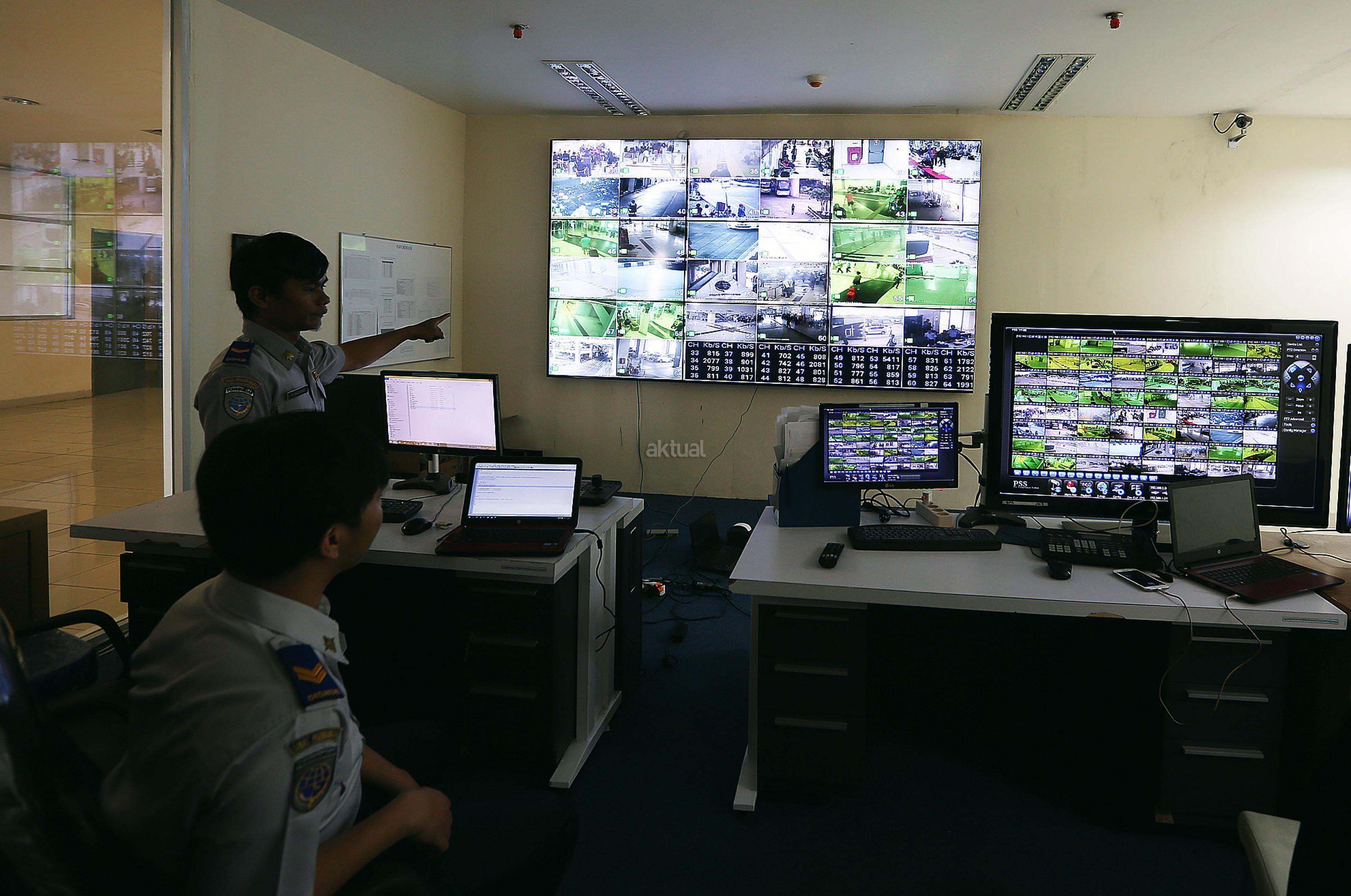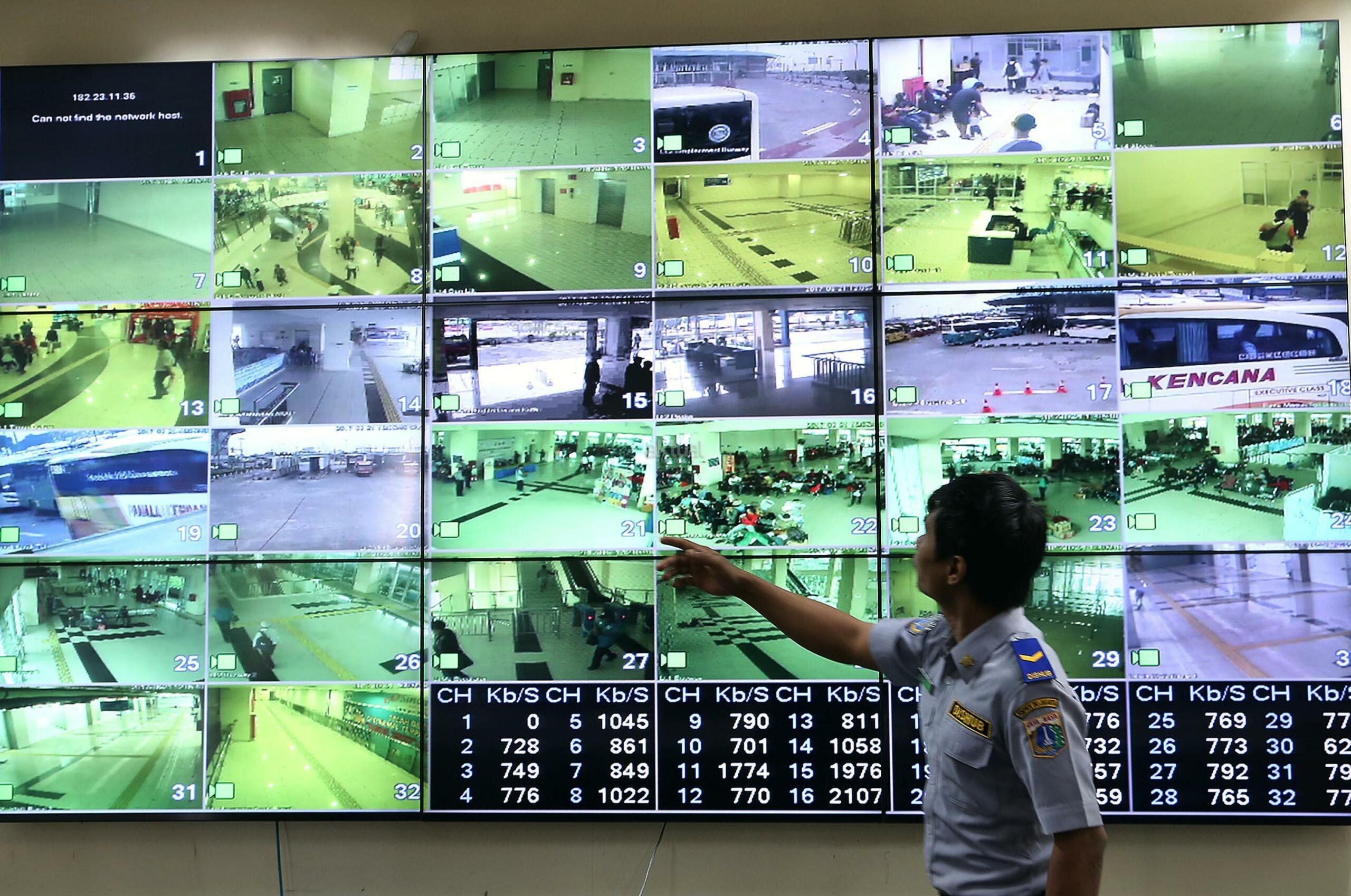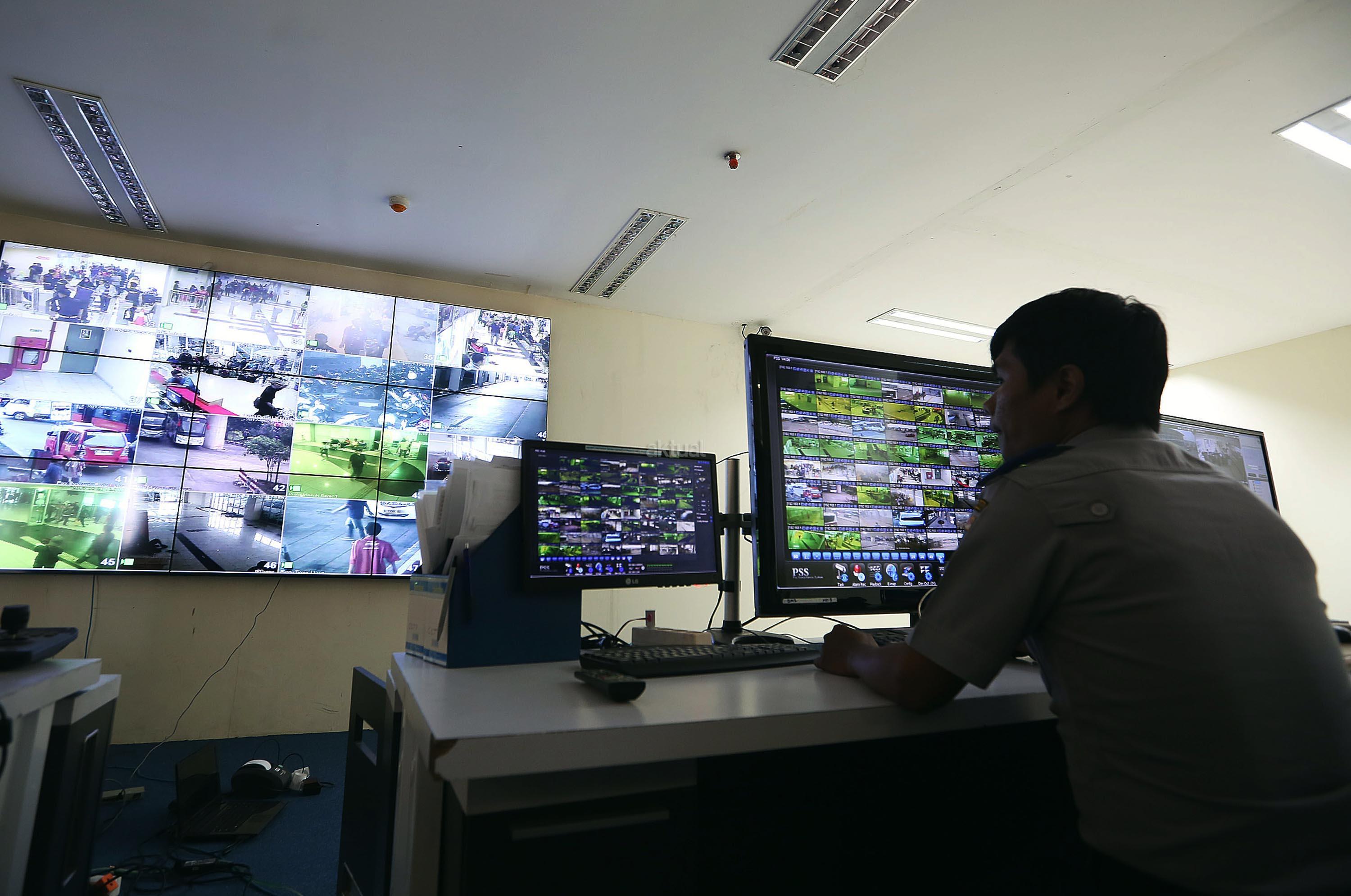 Petugas memantau kegiatan para pemudik dengan melalui CCTV di terminal bus Terpadu Sentra Timur Pulo Gebang, Jakarta Timur, Kamis (22/6/2017). Terdapat 84 CCTV terpasang untuk memantau seluruh kegiatan arus mudik terminal Pulo Gebang. AKTUAL/Munzir