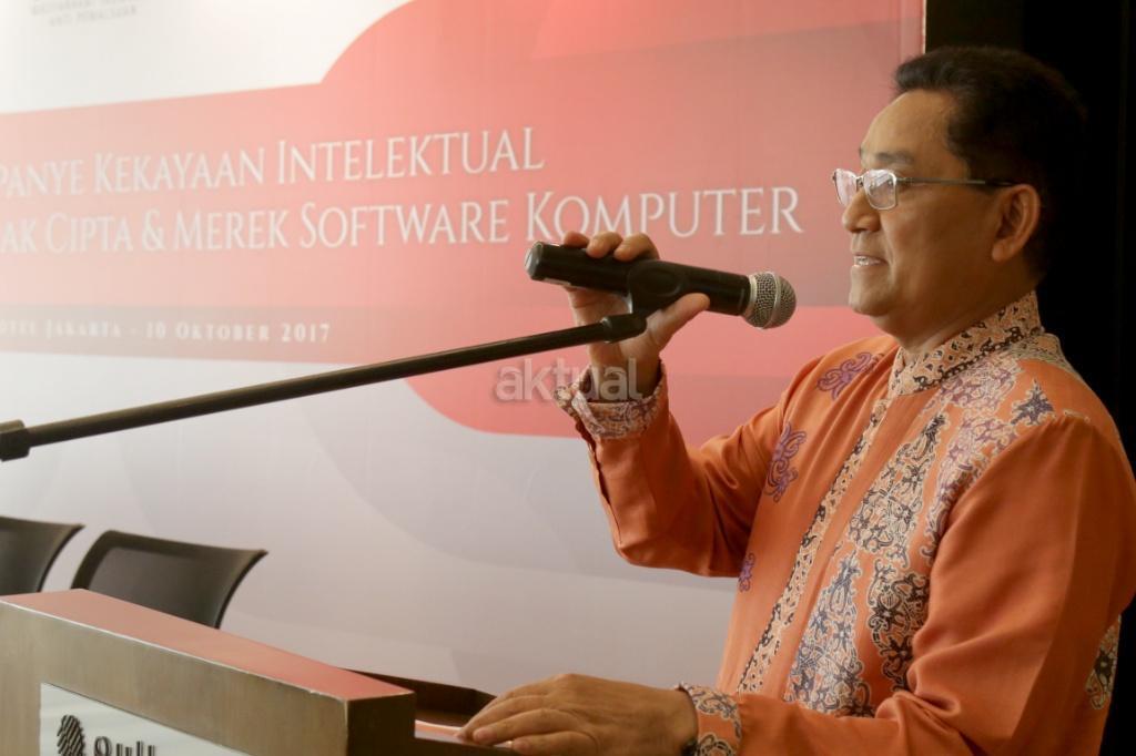 Kepala Departemen Penyidikan Sektor Jasa Keuangan, Otoritas Jasa Keuangan Irjen Pol A Kamil Razak, memberikan sambutan saat Sosialisasi Kampanye Kekayaan Intelektual Terkait Perlindungan Hak Cipta & Merek Software Komputer di Jakarta, Selasa (10/10). Sejalan dengan upaya Masyarakat Indonesia Anti-Pemalsuan (MIAP) dalam mensosialisasikan kampanye perlindungan kakayaan intelektual yang telah berbagi informasi mengenai studi malware terbaru “Cybersecurity Risks from Non-Genuine Software” dengan fokus pada risiko infeksi malware pada perangkat lunak dari pengguna bajakan. 92% laptop & komputer dengan software bajakan di wilayah Asia Pasifik terinfeksi malware berbahaya. AKTUAL/Tino Oktaviano