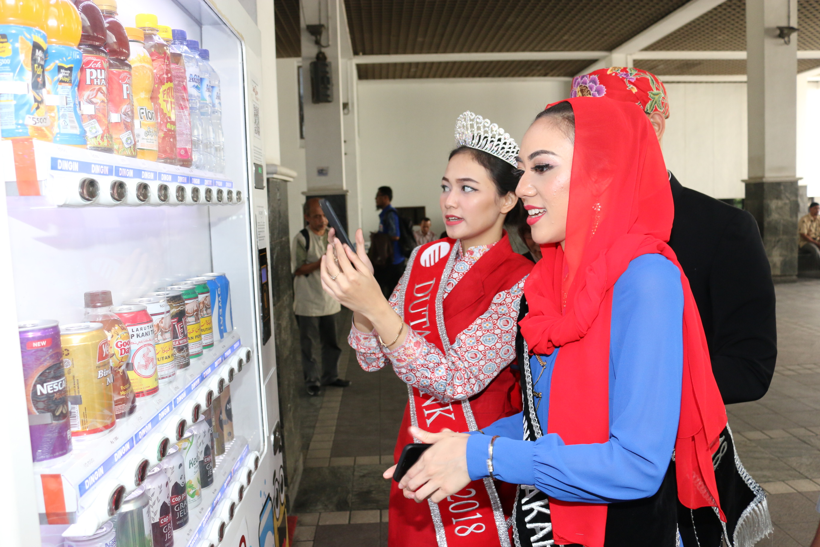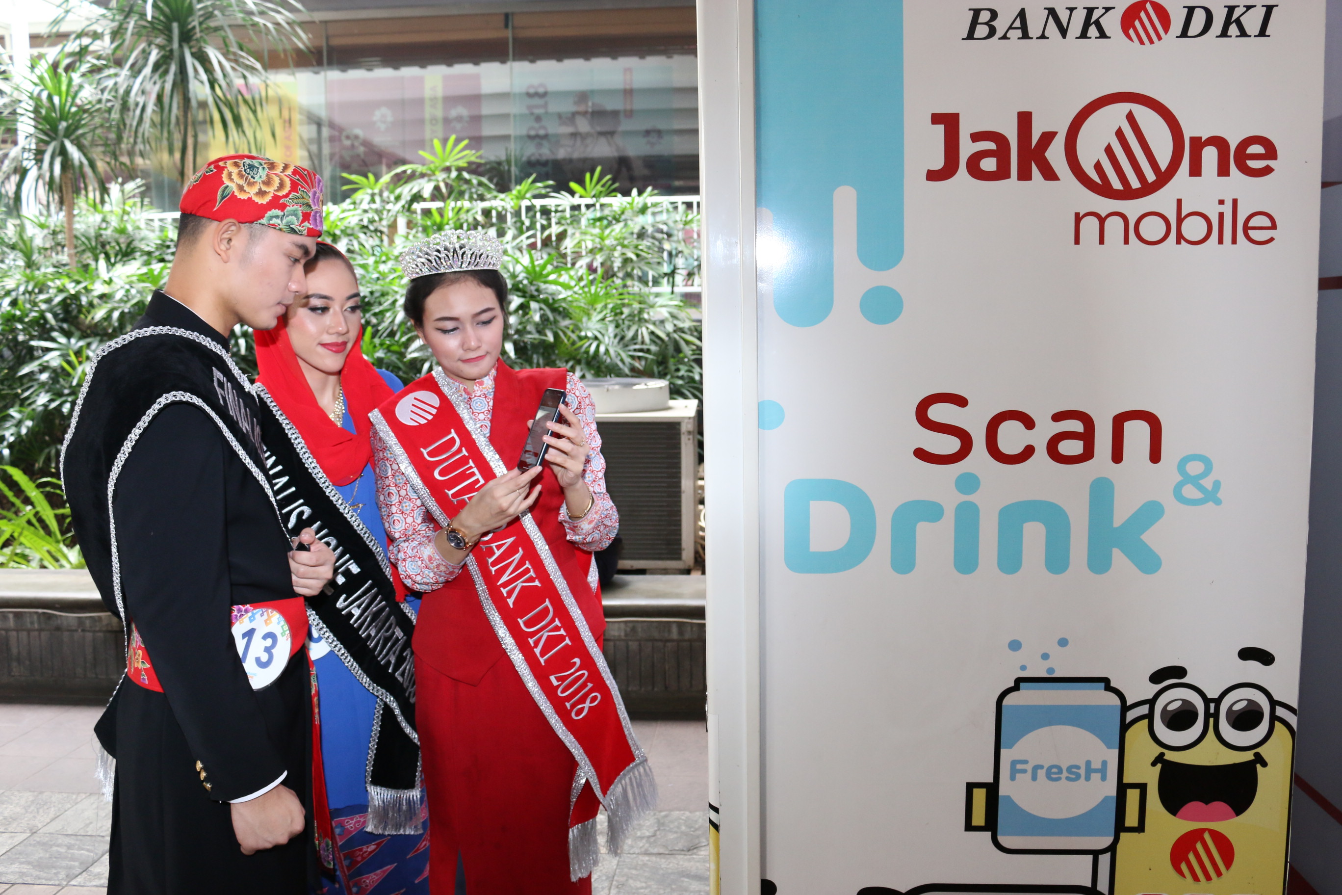 Perwakilan Duta Bank DKI Tahun 2018 Nita Indriani (kiri) sedang mendampingi sekaligus memberikan edukasi layanan transaksi non tunai melalui aplikasi JakOne Mobile kepada sepasang finalis Abang None DKI Jakarta Tahun 2018 di salah satu Vending Machine Bank DKI di Balaikota, Jakarta, Kamis (26/07). Bank DKI turut berpartisipasi sebagai sponsor dalam ajang pemilihan Abang None DKI Jakarta Tahun 2018 yang akan dilaksanakan pada tanggal 27 Juli 2018. AKTUAL/Tino Oktaviano