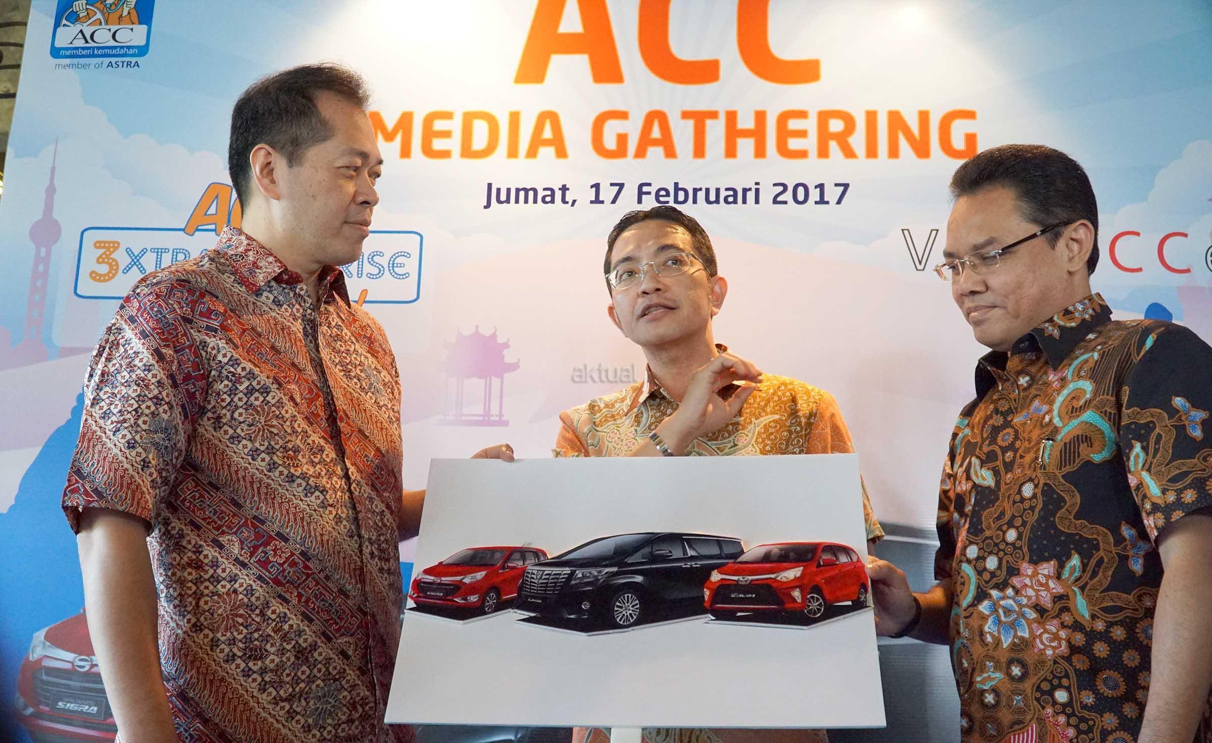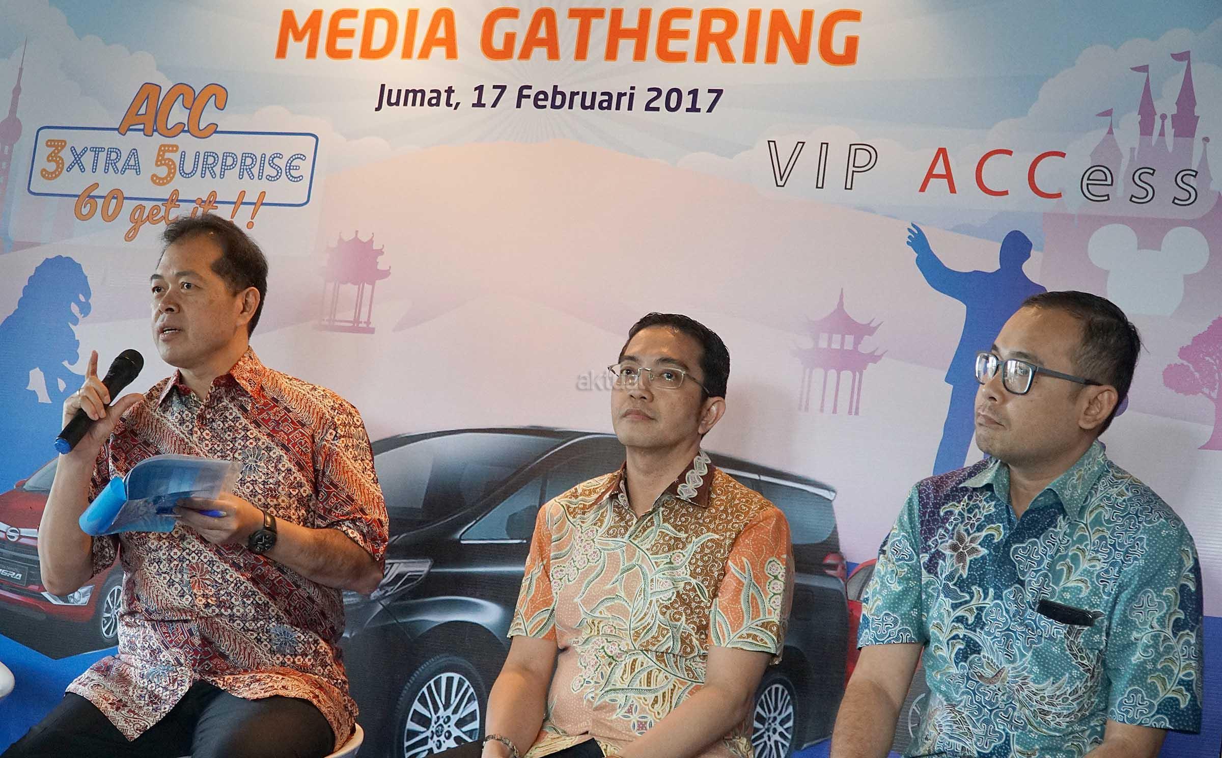 CEO Astra Credit Companies (ACC), Jodjana Jody (kiri) berbincang Deputy Chief Sales Officer ACC, Ezar Kumendong (tengah) serta Retail Sales Division Head ACC, Devy Santoso Jayadi (kanan) disela kegiatan peluncuran 3 jurus andalan ACC sambut usia 35 tahun dan HUT astra ke 60 Tahun di Jakarta,Jumat (17/2). ACC,perusahaan pembiayaan pertama Astra meluncurkan 3 program anatara lain VIP Access,Program Undian Berhadiah 3xtra 5urprise,60 Get It serta Loyalty Customer Gathering dalam bentuk bazaar kendaraan produk Astra. Ketiga program atau jurus andalan ACC ini diharapkan semakin memberikan nilai tambah bagi pelanggan setia dengan bunga yang kompetitif,proses yang cepat, mudah dan pelayanan prima. AKTUAL/Eko S Hilman