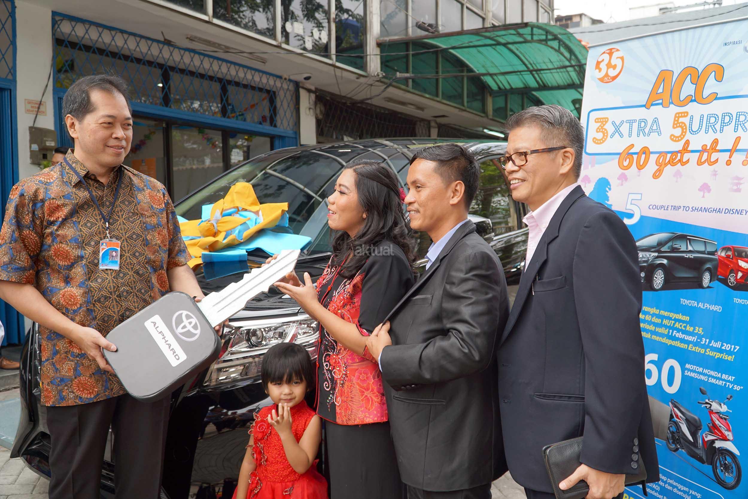 CEO Astra Credit Companies (ACC) Jodjana Jody (kanan), didampingi CFO Samuel Manasseh (kiri), secara simbolis menyerahkan hadiah utama mobil Alphard kepada pemenang program undian ACC 3XTRA Surprise, di Jakarta, Senin (4/9). Selain di Jakarta, juga diserahkan dua hadiah mobil lainnya kepada pemenang di Malang dan Makassar serta 160 hadiah lain seperti motor, tv dan logam mulia kepada pemenang ACC 3XTRA Surprise di berbagai wilayah di Indonesia, yang penyerahannya dilaksanakan bersamaan dengan perayaan Hari Pelanggan Nasional.ACC, perusahaan pembiayaan pertama yang memiliki cara sendiri untuk merayakan Hari Pelanggan, selain itu juga ACC juga mengeluarkan program program menarik seperti program Gratis biaya admin untuk proses reschedulling, pemberian cash back untuk pembayaran angsuran dan juga pemberian voucher belanja dan surprise gift. AKTUAL/Eko S Hilman