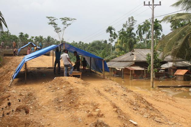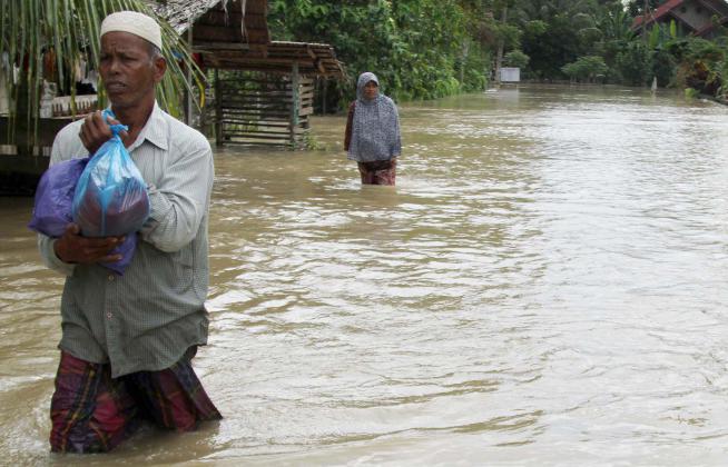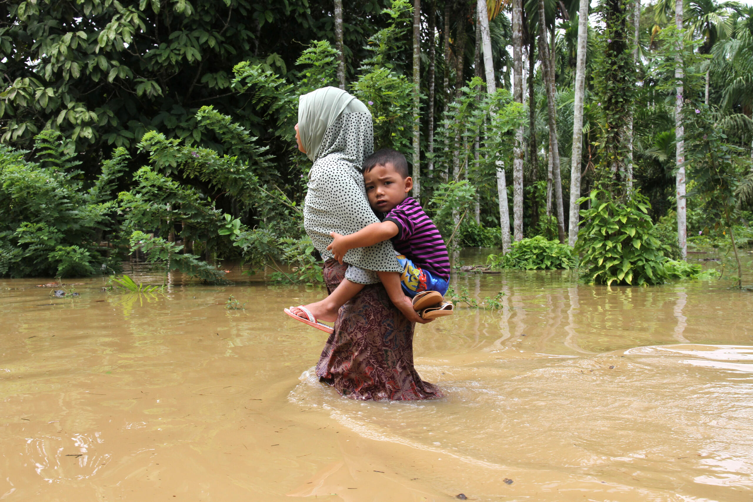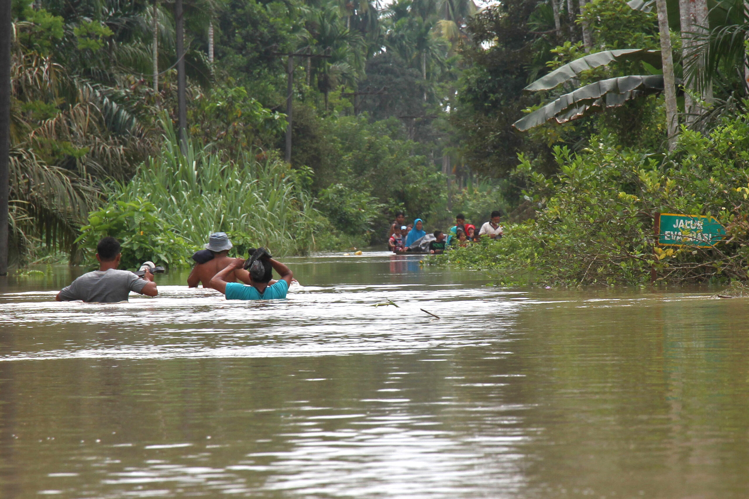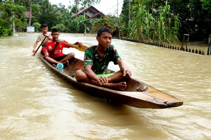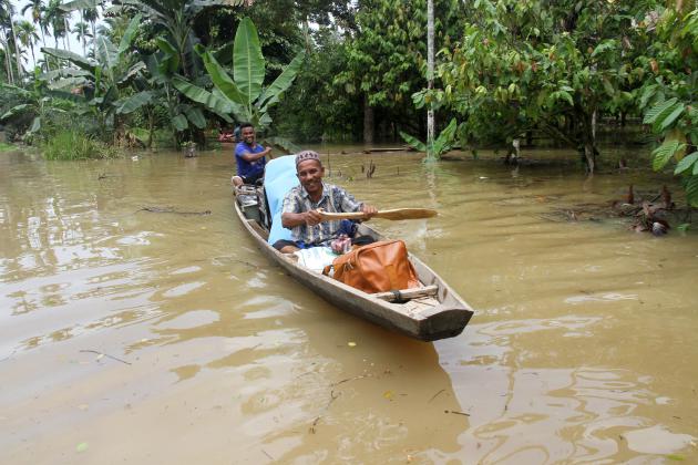 Warga menggunakan perahu keluar dari desanya yang terkepung banjir di Kecamatan Matang Kuli, Aceh Utara, Provinsi Aceh. Senin (8/2). Banjir kiriman ditambah tingginya curah hujan mengakibat empat wilayah Timur Aceh, Bireuen, Langsa, Aceh Timur dan sejumlah kecamatan di Aceh Utara dilanda banjir. ANTARA FOTO/Rahmad/nz/16