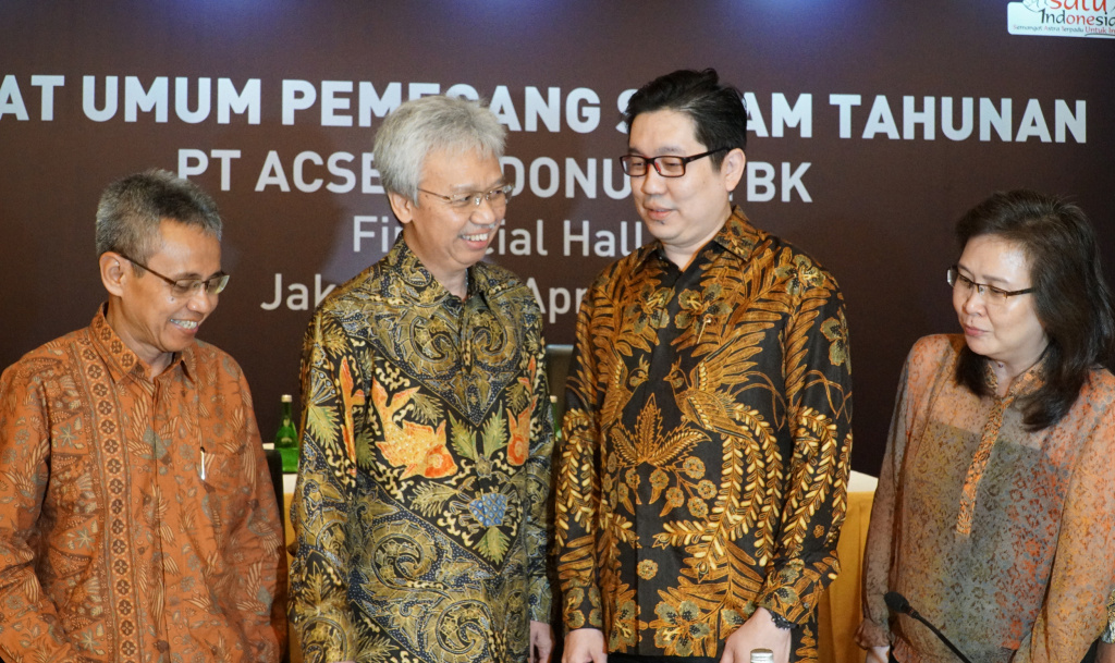 Dari kiri ke kanan, Direktur Independen PT Acset Indonusa Tbk Yohanes Eka Prayuda, Presiden Komisaris Franciscus Xaverius Laksana Kesuma, Presiden Direktur Jeffrey Gunadi Chandrawijaya dan Direktur Ellyjawati, berbincang usai Rapat Umum Pemegang Saham Tahunan (RUPST) di Jakarta, Rabu (10/4). AKTUAL/STR-Eko S Hilman