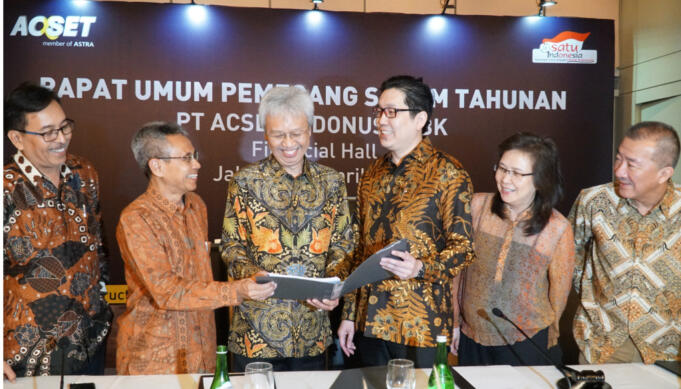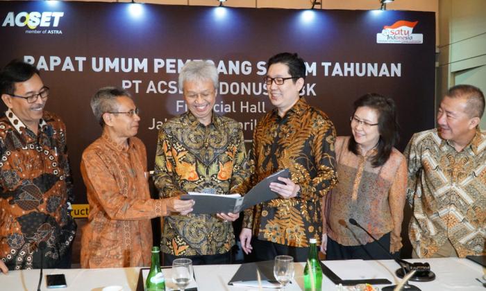 Dari kiri ke kanan, Direktur Independen PT Acset Indonusa Tbk Djoko Prabowo, Direktur Yohanes Eka Prayuda, Presiden Komisaris Franciscus Xaverius Laksana Kesuma, Presiden Direktur Jeffrey Gunadi Chandrawijaya, Direktur Ellyjawati, Direktur Hilarius Arwandhi berbincang usai Rapat Umum Pemegang Saham Tahunan (RUPST) di Jakarta, Rabu (10/4). AKTUAL/STR-Eko S Hilman