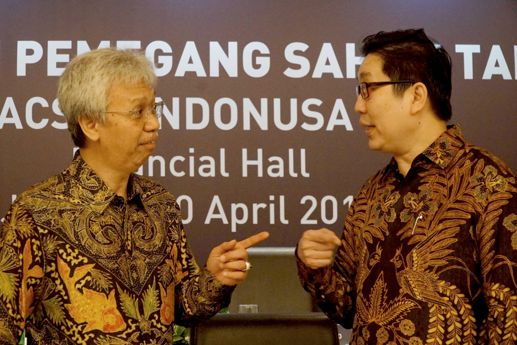 Presiden Komisaris PT Acset Indonusa Tbk Franciscus Xaverius Laksana Kesuma berbincang dengan Presiden Direktur Jeffrey Gunadi Chandrawijaya, usai Rapat Umum Pemegang Saham Tahunan (RUPST) di Jakarta, Rabu (10/4). AKTUAL/STR-Eko S Hilman