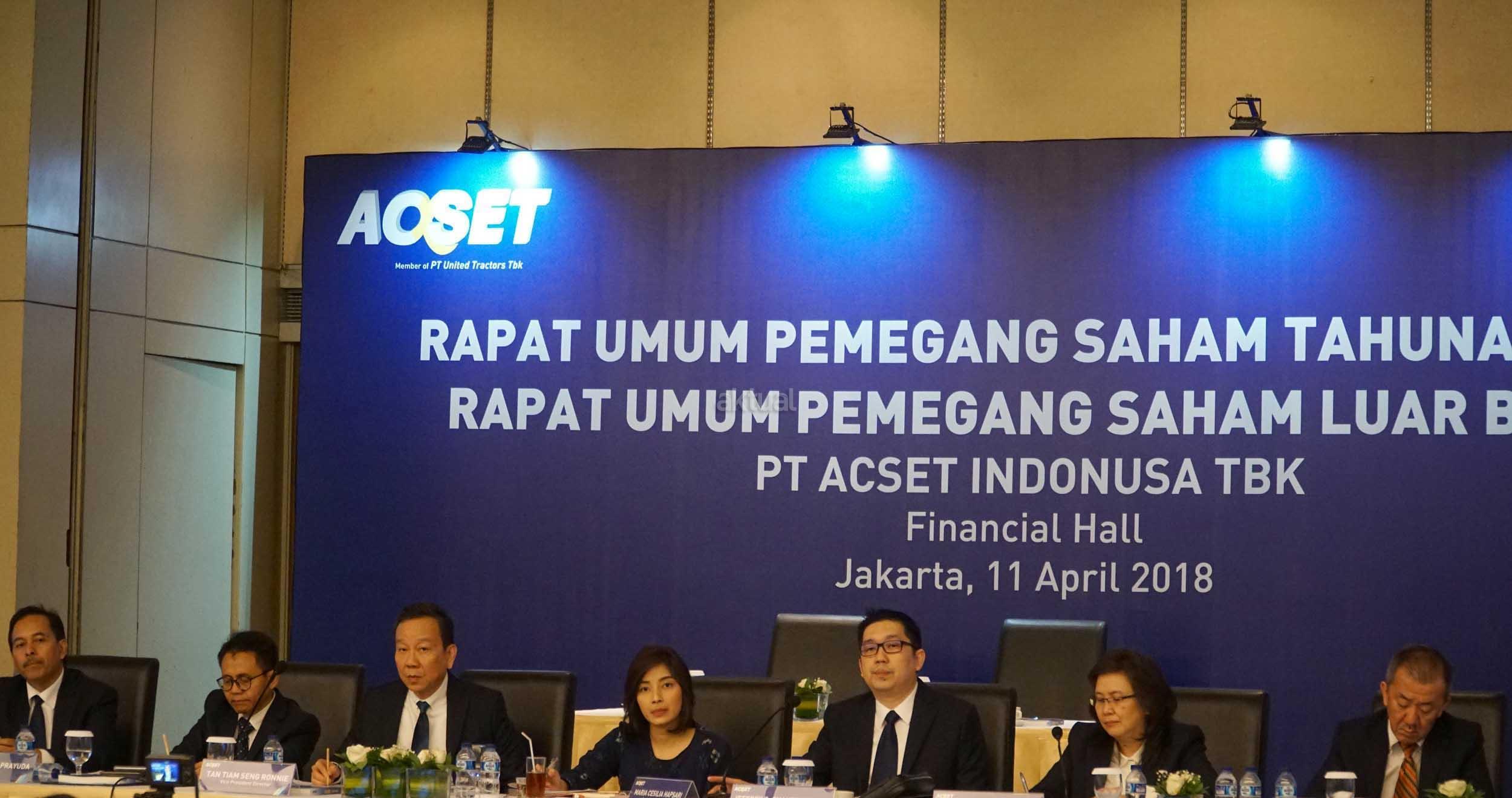 (dari kiri-kanan) Jajaran Direksi dan Komisaris PT Acset Indonusa Tbk (Acset), Yohanes Eka Prayuda (Direktur), Tan Tiam Seng Ronnie (Wakil Presiden Direktur), Gidion Hasan (Presiden Komisaris), Jeffrey Gunadi Chandrawijaya (Presiden Direktur), Ellyjawati (Direktur), dan Hilarius Arwandhi (Direktur) berbincang seusai RUPS Tahunan Dan RUPSLB di Financial Hall,Graha CIMB Niaga,Sudirman,Jakarta,Rabu (11/4).Perusahaan konstruksi spesialis beragam yang unggul di bidang fondasi dan ground engineering tersebut mencatat laba bersih sebesar Rp 154,2 Miliar meningkat sebesar 125,7% dibandingkan pada periode yang sama tahun 2016.Sementara pada Rapat juga disetujui untuk dibagikan sebagai dividen sebesar Rp 58,- per setiap saham, atau setara dengan Rp 40,6 Miliar atau 40% dari total laba bersih. AKTUAL/Eko S Hilman