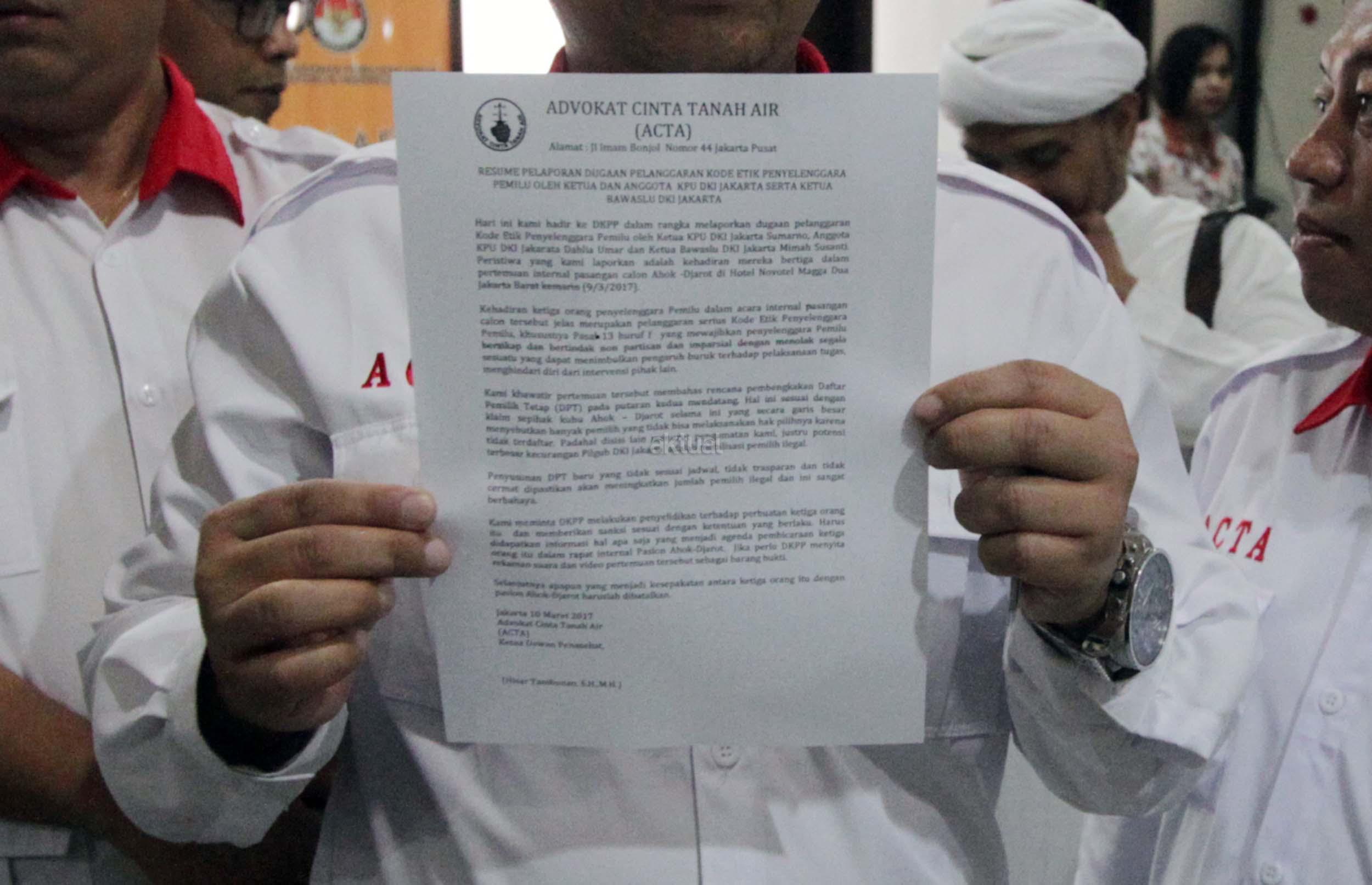 Tim Advokat Cinta Tanah Air (ACTA) melakukan pelaporan di kantor Dewan Kehormatan Penyelenggara Pemilu (DKPP) terkait pertemuan Ketua KPUD DKI Jakarta Sumarno, Anggota KPU DKI Jakarta Dahlia Umar dan Ketua Bawaslu DKI Jakarta Mimih Susanti pada rapat internal tim sukses Ahok-Djarot di Hotel Novotel, Jakarta Barat. AKTUAL/Munzir