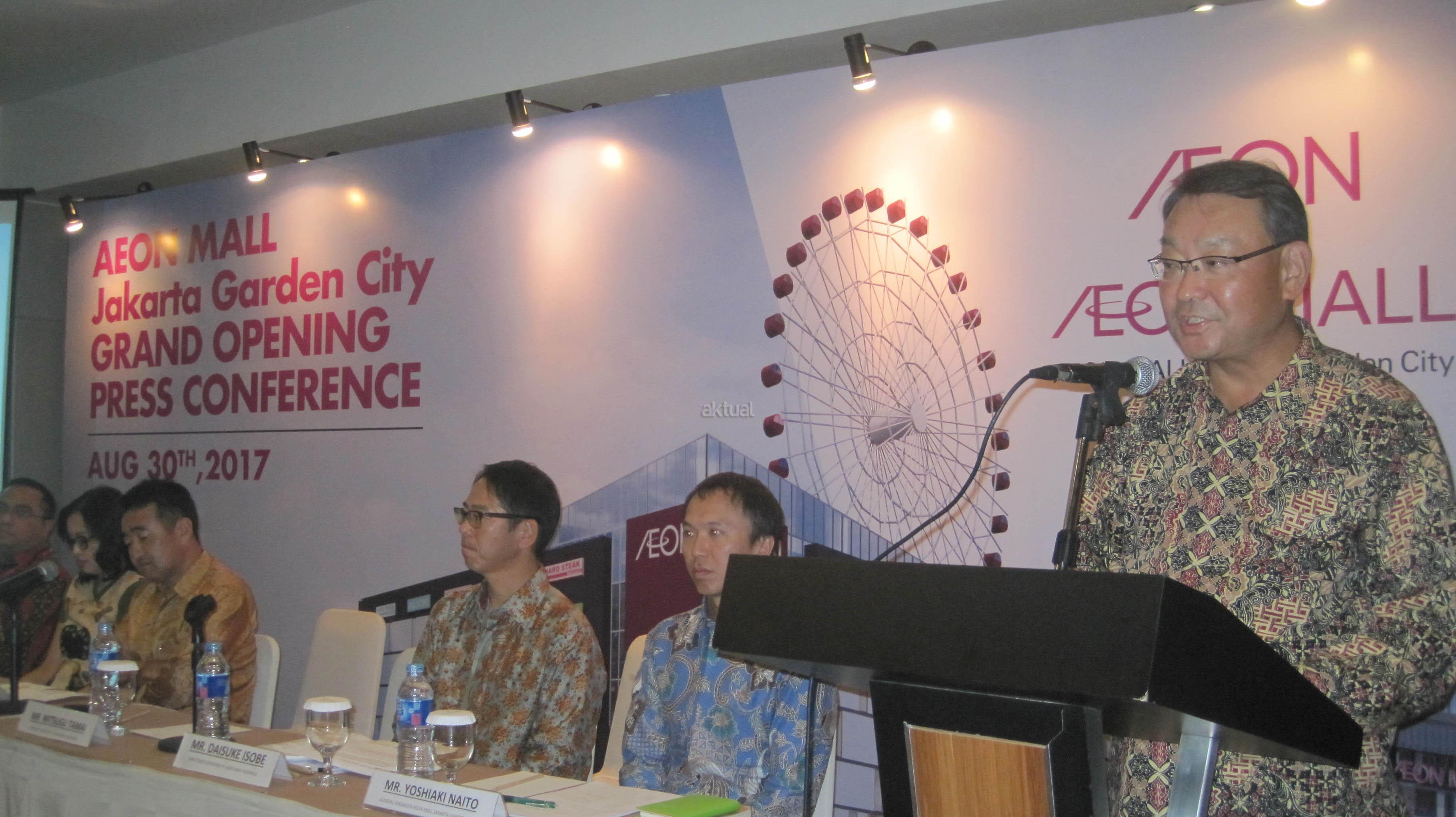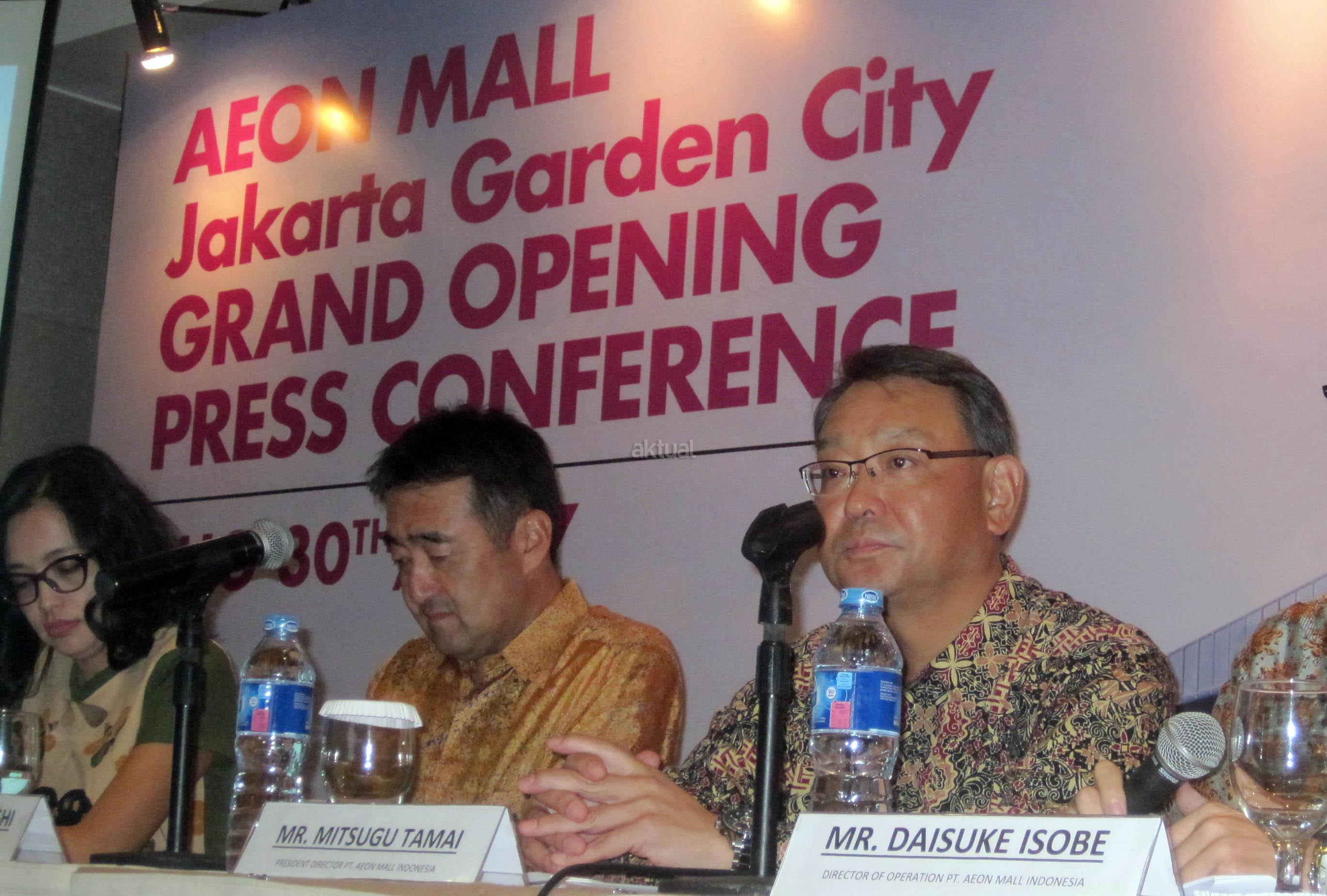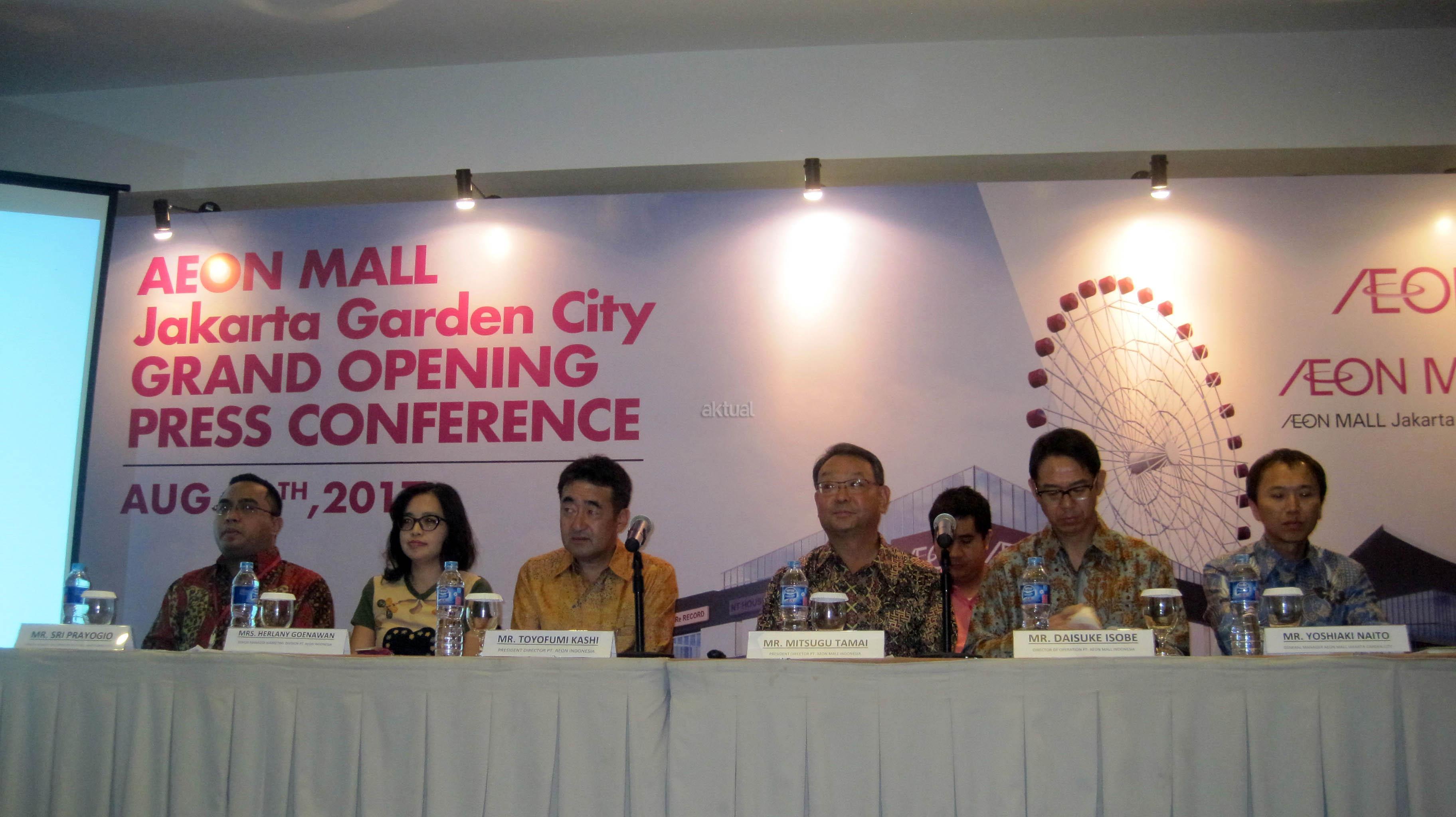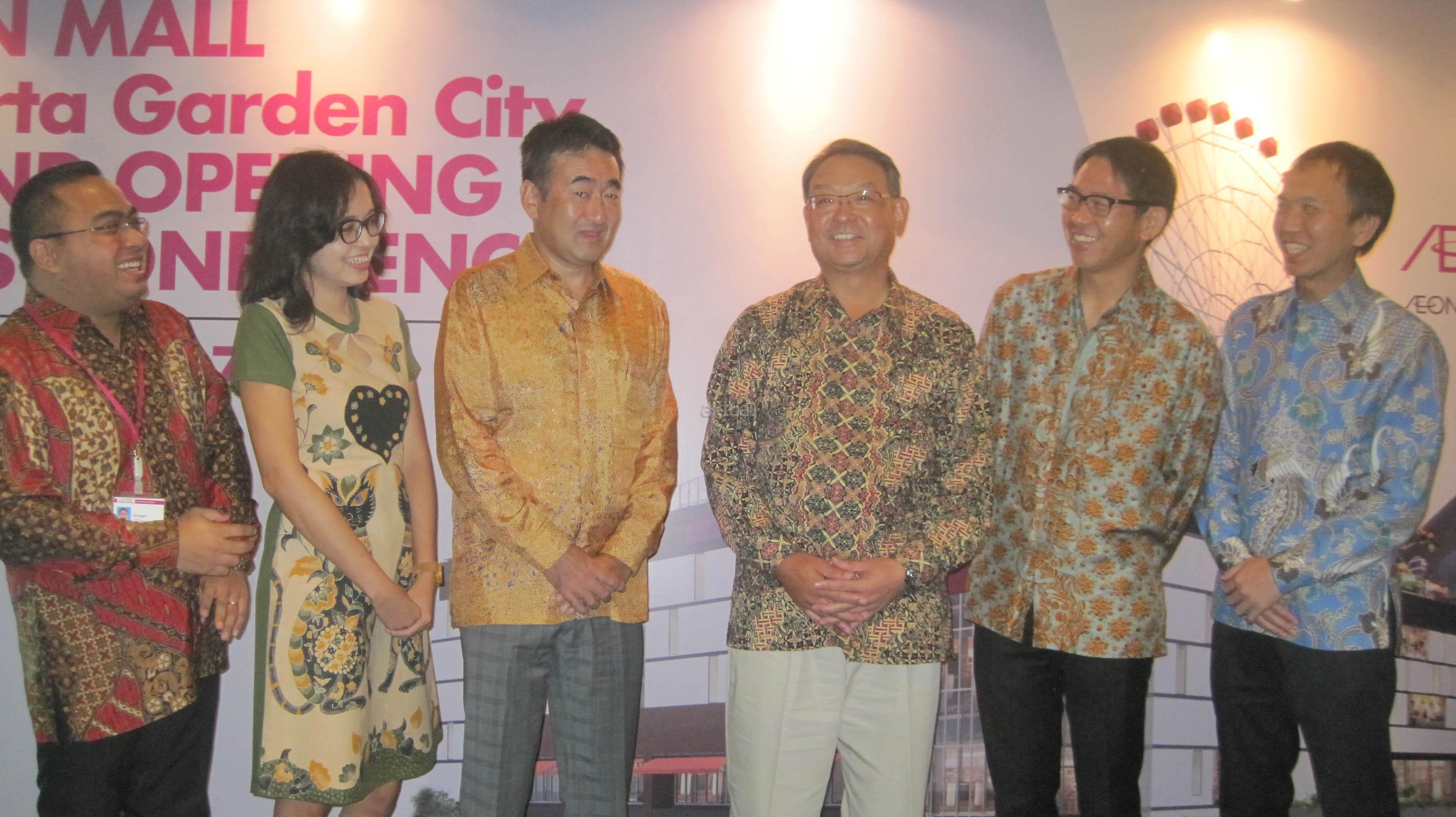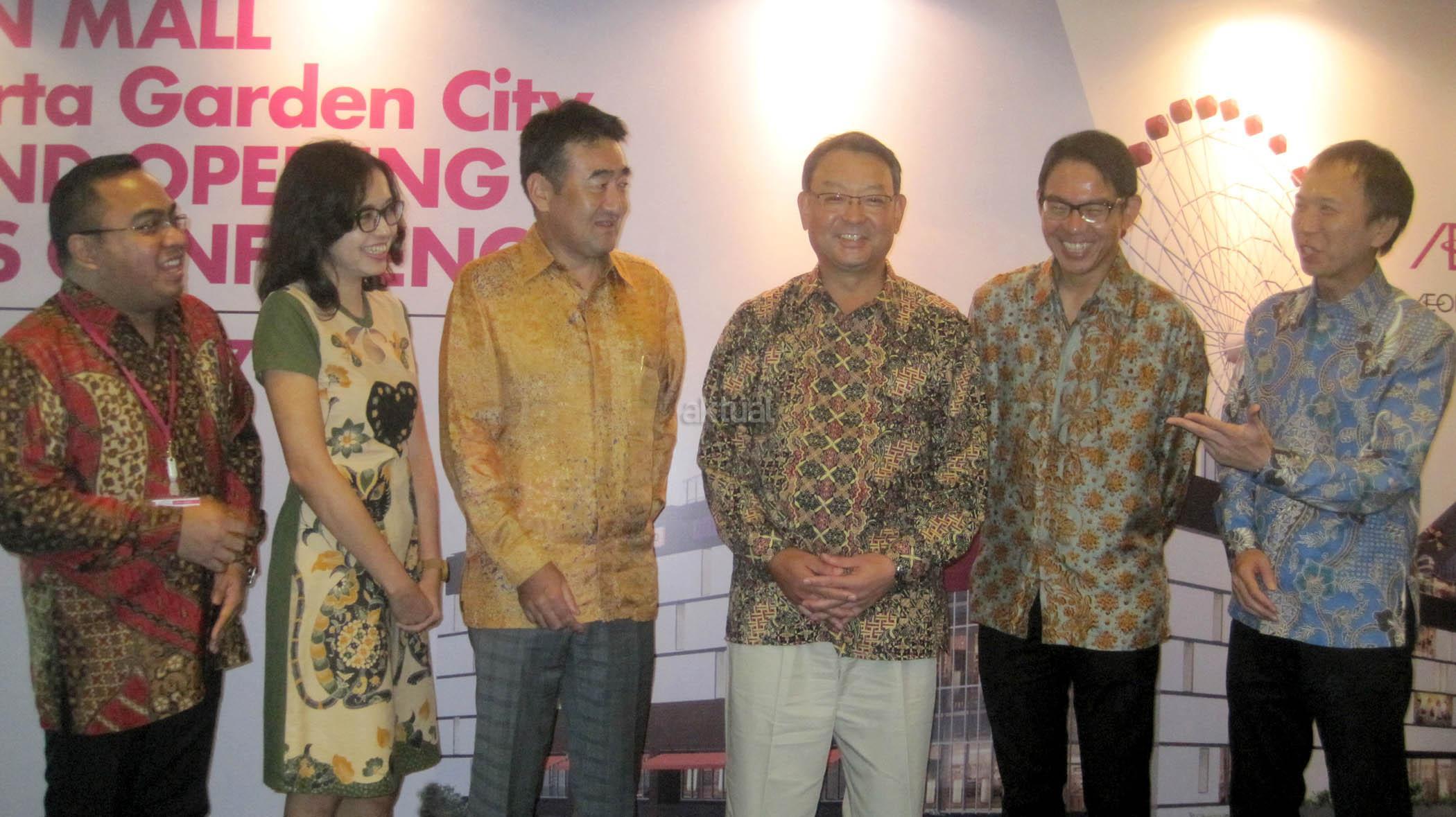 Dari kiri ke kanan, General Manager Aeon Mall Jakarta Garden City Sri Prayogio, Senior Manager Marketing Division Herlany Goenawan, President Director PT Aeon Indonesia Toyofumi Kashi, President Director PT Aeon Mall Indonesia Mitsugu Tamai, Director of Operation PT Aeon Mall Indonesia Daisuke Isobe dan General Manager Aeon Mall Jakarta Garden City Yoshiaki Naito berbincang usai jumpa pers di Bekasi, Jawa Barat, Rabu (30/8). Aeon Mall Jakarta Garden City secara resmi dibuka pada 30 september mendatang, Aeon Mall merupakan pusat perbelanjaan asal Jepang yang menawarkan nuansa dan aneka gaya hidup khas negeri Sakura yang mengusung konsep “smile of life” yakni selain menjadi pusat berbelanja, juga disediakan arena bermain bagi keluarga dan pusat kuliner di area seluas 85.000 m2. AKTUAL/Eko S Hilman