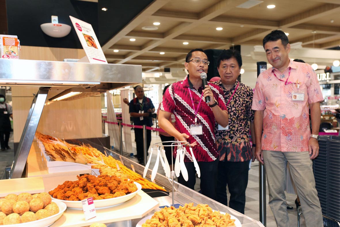 Presiden Direktur PT AEON Indonesia Toyofumi Kashi (kanan) memperlihatkan sushi, tempura, karaage, okonomiyaki, takoyaki, yakitori, dengan harga yang terjangkau sehingga dapat dinikmati oleh seluruh pelanggan dengan konsep popularisasi makanan Jepang. Bagian yang terpenting adalah Sushi Corner di Indonesia yakni Sushi World yang menjual 150 item termasuk Nigiri sushi, Makizushi dan Inari Sushi. AKTUAL/Eko S Hilman