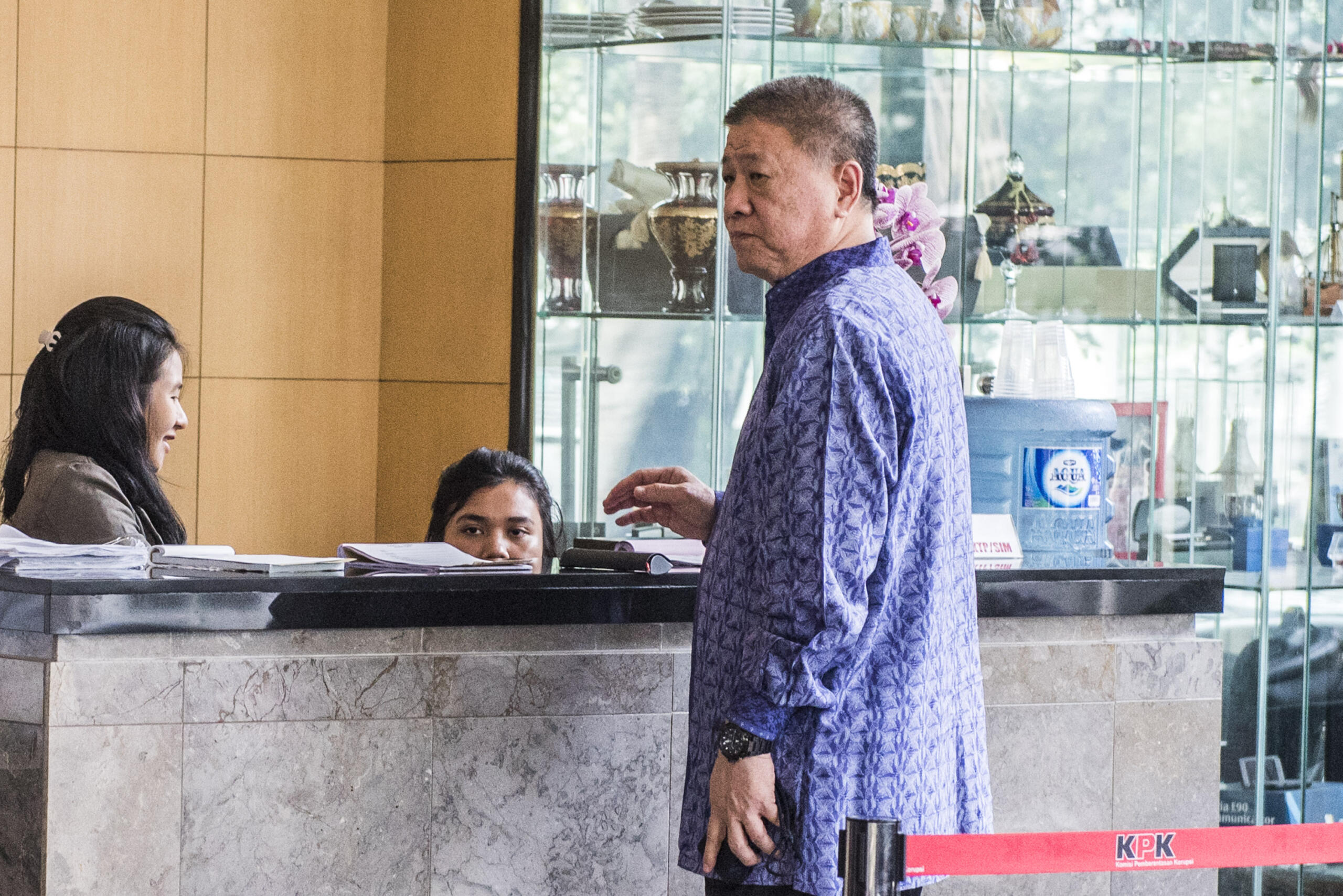 Chairman Agung Sedayu Group Sugianto Kusuma alias Aguan menunggu di ruang tunggu seusai menjalani pemeriksaan di gedung KPK, Jakarta, Rabu (13/4). Aguan diperiksa sebagai saksi untuk tersangka Anggota DPRD DKI Jakarta M Sanusi, terkait kasus pembahasan Raperda tentang rencana zonasi wilayah pesisir dan pulau-pulau kecil provinsi DKI Jakarta tahun 2015-2035 dan raperda tentang rencana tata ruang kawasan strategis Pantai Utara Jakarta. ANTARA FOTO/M Agung Rajasa/pd/16